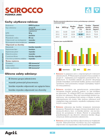 ŚRODKI OCHRONY ROŚLIN NASZE REKOMENDACJE NASIONA ZBÓŻ JARYCH SCIROCCO PSZENICA JARA Cechy użytkowo-rolnicze: Hodowca Typ odmiany KWS Lochow grupa E MTZ Krzewienie Wysokość roślin Odporność na wyleganie Wymagania stanowiskowe Odporność na choroby: Mączniak Septorioza liści Septorioza plew Rdza brunatna Fuzarioza kłosa Choroba podstawy źdźbła Norma wysiewu: Wczesny Optymalny Lekko opóźniony 50 g średnie 85 cm wysoka średnie Średnie parametry jakościowe towaru pochodzącego z plantacji nasiennych Agrii (wysoka plenność i jakość wypiekowa) MTZ (g) Białko (%) 2011 53,90 14,93 31,87 262,33 79,70 2012 51,90 19,04 42,50 236,21 79,50 2013 49,30 15,58 34,76 320,60 79,20 Pszenica jara wyniki BSA 2011 10 9 bardzo wysoka średnie wysoka wysoka bardzo wysoka wysoka 8 7 6 5 4 3 2 1 450 ziaren/m² 470 ziaren/m² 520 ziaren/m² 0 Scirocco (E) Sonett (E) krzewienie Główne zalety odmiany: Thasos (E) Monsun (A) Tybalt (A) MTZ Ethos (A) plon ®® Scirocco to pszenica jara o nieprzeciętnych walorach jakościowych. W Niemczech zarejestrowana została w grupie E - najlepszej pod względem parametrów wypiekowych. O wysokiej jakości jej plonów decydują przede wszystkim: zawartość białka, gluten oraz liczba opadania, czyli parametry mające największy wpływ na cenę pszenicy. ® E-litarna grupa jakościowa ® wysoki potencjał plonowania ® bardzo wysoka odporność na ugięcie łanu ®® Scirocco wyróżnia się genetycznym potencjałem tworzenia bardzo grubych nasion, co jest źródłem jej plenności. To właśnie MTZ ma największy wpływ na plon tej odmiany. Kłos jest wprawdzie średnio zaziarniony, ale mniejszą ilość ziaren w kłosie w pełni rekompensuje ich masa. Jako jedyna odmiana pod względem tego parametru uzyskała najlepszą z możliwych ocenę 9 pkt. ® bardzo wysoka odporność na choroby NASIONA RZEPAKU JAREGO NASIONA TRAW Ilość Liczba Gęstość glutenu opada- ziarna (%) nia (s) (kg/m3) Rok ®® Scirocco odznacza się bardzo wczesnym terminem kłoszenia. Najszybciej osiąga również dojrzałość techniczną do zbioru, lecz - co bardzo istotne - nie ma tendencji do porastania w kłosie. Nawet w przypadku przedłużających się zbiorów odmiana bardzo długo utrzymuje dobre parametry jakościowe. ®® Scirocco cechuje się dobrą odpornością na większość chorób. Zdecydowanie wyróżnia się pod względem odporności na mączniaka oraz fuzariozę kłosów. 20