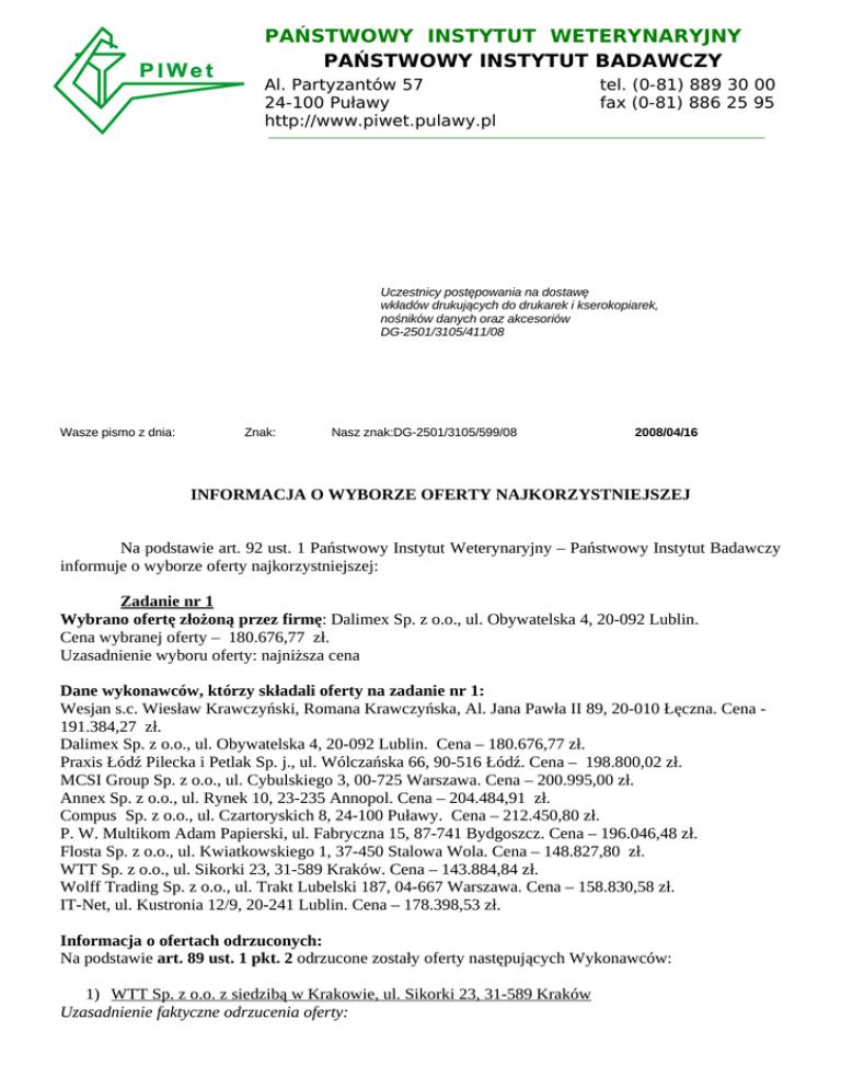 PAŃSTWOWY INSTYTUT WETERYNARYJNY PAŃSTWOWY INSTYTUT BADAWCZY Al. Partyzantów 57 24-100 Puławy http://www.piwet.pulawy.pl tel. (0-81) 889 30 00 fax (0-81) 886 25 95 Uczestnicy postępowania na dostawę wkładów drukujących do drukarek i kserokopiarek, nośników danych oraz akcesoriów DG-2501/3105/411/08 Wasze pismo z dnia: Znak: Nasz znak:DG-2501/3105/599/08 2008/04/16 INFORMACJA O WYBORZE OFERTY NAJKORZYSTNIEJSZEJ Na podstawie art. 92 ust. 1 Państwowy Instytut Weterynaryjny – Państwowy Instytut Badawczy informuje o wyborze oferty najkorzystniejszej: Zadanie nr 1 Wybrano ofertę złożoną przez firmę: Dalimex Sp. z o.o., ul. Obywatelska 4, 20-092 Lublin. Cena wybranej oferty – 180.676,77 zł. Uzasadnienie wyboru oferty: najniższa cena Dane wykonawców, którzy składali oferty na zadanie nr 1: Wesjan s.c. Wiesław Krawczyński, Romana Krawczyńska, Al. Jana Pawła II 89, 20-010 Łęczna. Cena 191.384,27 zł. Dalimex Sp. z o.o., ul. Obywatelska 4, 20-092 Lublin. Cena – 180.676,77 zł. Praxis Łódź Pilecka i Petlak Sp. j., ul. Wólczańska 66, 90-516 Łódź. Cena – 198.800,02 zł. MCSI Group Sp. z o.o., ul. Cybulskiego 3, 00-725 Warszawa. Cena – 200.995,00 zł. Annex Sp. z o.o., ul. Rynek 10, 23-235 Annopol. Cena – 204.484,91 zł. Compus Sp. z o.o., ul. Czartoryskich 8, 24-100 Puławy. Cena – 212.450,80 zł. P. W. Multikom Adam Papierski, ul. Fabryczna 15, 87-741 Bydgoszcz. Cena – 196.046,48 zł. Flosta Sp. z o.o., ul. Kwiatkowskiego 1, 37-450 Stalowa Wola. Cena – 148.827,80 zł. WTT Sp. z o.o., ul. Sikorki 23, 31-589 Kraków. Cena – 143.884,84 zł. Wolff Trading Sp. z o.o., ul. Trakt Lubelski 187, 04-667 Warszawa. Cena – 158.830,58 zł. IT-Net, ul. Kustronia 12/9, 20-241 Lublin. Cena – 178.398,53 zł. Informacja o ofertach odrzuconych: Na podstawie art. 89 ust. 1 pkt. 2 odrzucone zostały oferty następujących Wykonawców: 1) WTT Sp. z o.o. z siedzibą w Krakowie, ul. Sikorki 23, 31-589 Kraków Uzasadnienie faktyczne odrzucenia oferty: Oferta Wykonawcy zawiera specyfikacje techniczne produktu świadczące o wydajności tych produktów, co jest w tym przypadku częścią dokumentów składających się na dokumenty wymagane przez zamawiającego w celu potwierdzenia równoważności. Odpowiedź na pismo zamawiającego przysłana po terminie (w piśmie Wykonawca informuje, że zaoferował w kilku pozycjach produkty oryginalne, niestety brak jest informacji, o które pozycje tutaj chodzi). Oferta zawiera tylko jedno oświadczenie producenta o możliwości zastosowania produktów zamiennych (tj. oświadczenie Helwett Packard Polska Sp. z o.o.), lecz producent obciąży kosztami naprawy użytkownika sprzętu w przypadku gdy awaria zostanie spowodowana użyciem wkładu innego niż wkład HP. Wykonawca nic nie pisze ani nie załącza do oferty oświadczenia o przejęciu zobowiązań gwarancyjnych w przypadku gdy zastosowanie produktu innego niż pochodzący od producenta drukarek spowoduje uszkodzenia w sprzęcie, który jest objęty gwarancją producenta. Producent HP Polska Sp. z o.o. nie może zagwarantować poprawnego działania urządzeń przy użyciu materiałów eksploatacyjnych innych firm. Użycie materiału eksploatacyjnego równoważnego pozbawia zamawiającego możliwości zarządzania urządzeniem przy użyciu oprogramowania drukarki. Nie ma możliwości uzyskania informacji o stanie materiałów eksploatacyjnych takich jak ilość wykonanych kopii, ilość kopii do wykonania, itp. Brak jest oświadczeń innych producentów sprzętu wymienionego w zadaniu nr 1, np. Lexmark, Minolta, Epson, Xerox. W specyfikacji istotnych warunków zamówienia zamawiający wymagał dokumentów potwierdzających równoważność oraz produktów spełniających wymagania gwarancyjne (Opis przedmiotu zamówienia cyt: „Dopuszcza się produkt równoważny. Przez produkt równoważny rozumie się produkt spełniający wymagania gwarancyjne (przy czym chodzi tu o oświadczenie producenta urządzeń, że w przypadku zastosowania materiałów eksploatacyjnych innych niż wskazane w siwz nie spowoduje to utraty gwarancji i zapewni poprawne działanie urządzeń) udokumentowany zaświadczeniem od producenta.” oraz pkt. 4 SIWZ). Zdaniem Wykonawcy oferta nie spełnia wymagań zamawiającego i nie zawiera wszystkich wymaganych dokumentów. 2) Wolff Trading Sp. z o.o., ul. Trakt Lubelski 187, 04-667 Warszawa Uzasadnienie faktyczne odrzucenia oferty: Oferta Wykonawcy zawiera specyfikacje techniczne produktu świadczące o wydajności tych produktów, co jest w tym przypadku częścią dokumentów składających się na dokumenty wymagane przez zamawiającego w celu potwierdzenia równoważności. Oferta zawiera tylko jedno oświadczenie producenta o możliwości zastosowania produktów zamiennych (tj. oświadczenie Helwett Packard Polska Sp. z o.o.), lecz producent obciąży kosztami naprawy użytkownika sprzętu w przypadku gdy awaria zostanie spowodowana użyciem wkładu innego niż wkład HP. Producent HP Polska Sp. z o.o. nie może zagwarantować poprawnego działania urządzeń przy użyciu materiałów eksploatacyjnych innych firm. Użycie materiału eksploatacyjnego równoważnego pozbawia zamawiającego możliwości zarządzania urządzeniem przy użyciu oprogramowania drukarki. Nie ma możliwości uzyskania informacji o stanie materiałów eksploatacyjnych takich jak ilość wykonanych kopii, ilość kopii do wykonania, itp. Brak jest oświadczenia producenta (Xerox) sprzętu wymienionego w zadaniu nr 1 poz. 72. W pozostałych przypadkach zaoferowano produkty oryginalne. 3) I.T. Net M. i G. Petruczynik, ul. Kustronia 12/9, 20-241 Lublin Uzasadnienie faktyczne odrzucenia oferty: Oferta Wykonawcy zawiera specyfikacje techniczne produktu świadczące o wydajności tych produktów, co jest w tym przypadku częścią dokumentów składających się na dokumenty wymagane przez zamawiającego w celu potwierdzenia równoważności. Oferta zawiera tylko jedno oświadczenie 
