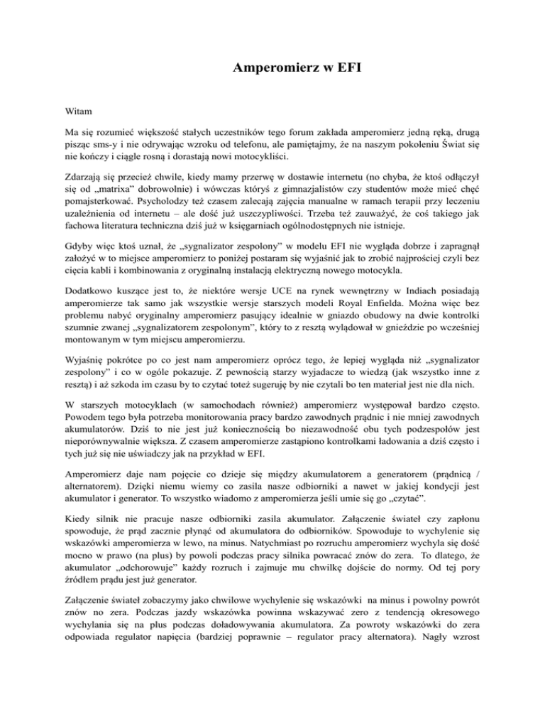 Amperomierz w EFI Witam Ma się rozumieć większość stałych uczestników tego forum zakłada amperomierz jedną ręką, drugą pisząc sms-y i nie odrywając wzroku od telefonu, ale pamiętajmy, że na naszym pokoleniu Świat się nie kończy i ciągle rosną i dorastają nowi motocykliści. Zdarzają się przecież chwile, kiedy mamy przerwę w dostawie internetu (no chyba, że ktoś odłączył się od „matrixa” dobrowolnie) i wówczas któryś z gimnazjalistów czy studentów może mieć chęć pomajsterkować. Psycholodzy też czasem zalecają zajęcia manualne w ramach terapii przy leczeniu uzależnienia od internetu – ale dość już uszczypliwości. Trzeba też zauważyć, że coś takiego jak fachowa literatura techniczna dziś już w księgarniach ogólnodostępnych nie istnieje. Gdyby więc ktoś uznał, że „sygnalizator zespolony” w modelu EFI nie wygląda dobrze i zapragnął założyć w to miejsce amperomierz to poniżej postaram się wyjaśnić jak to zrobić najprościej czyli bez cięcia kabli i kombinowania z oryginalną instalacją elektryczną nowego motocykla. Dodatkowo kuszące jest to, że niektóre wersje UCE na rynek wewnętrzny w Indiach posiadają amperomierze tak samo jak wszystkie wersje starszych modeli Royal Enfielda. Można więc bez problemu nabyć oryginalny amperomierz pasujący idealnie w gniazdo obudowy na dwie kontrolki szumnie zwanej „sygnalizatorem zespolonym”, który to z resztą wylądował w gnieździe po wcześniej montowanym w tym miejscu amperomierzu. Wyjaśnię pokrótce po co jest nam amperomierz oprócz tego, że lepiej wygląda niż „sygnalizator zespolony” i co w ogóle pokazuje. Z pewnością starzy wyjadacze to wiedzą (jak wszystko inne z resztą) i aż szkoda im czasu by to czytać toteż sugeruję by nie czytali bo ten materiał jest nie dla nich. W starszych motocyklach (w samochodach również) amperomierz występował bardzo często. Powodem tego była potrzeba monitorowania pracy bardzo zawodnych prądnic i nie mniej zawodnych akumulatorów. Dziś to nie jest już koniecznością bo niezawodność obu tych podzespołów jest nieporównywalnie większa. Z czasem amperomierze zastąpiono kontrolkami ładowania a dziś często i tych już się nie uświadczy jak na przykład w EFI. Amperomierz daje nam pojęcie co dzieje się między akumulatorem a generatorem (prądnicą / alternatorem). Dzięki niemu wiemy co zasila nasze odbiorniki a nawet w jakiej kondycji jest akumulator i generator. To wszystko wiadomo z amperomierza jeśli umie się go „czytać”. Kiedy silnik nie pracuje nasze odbiorniki zasila akumulator. Załączenie świateł czy zapłonu spowoduje, że prąd zacznie płynąć od akumulatora do odbiorników. Spowoduje to wychylenie się wskazówki amperomierza w lewo, na minus. Natychmiast po rozruchu amperomierz wychyla się dość mocno w prawo (na plus) by powoli podczas pracy silnika powracać znów do zera. To dlatego, że akumulator „odchorowuje” każdy rozruch i zajmuje mu chwilkę dojście do normy. Od tej pory źródłem prądu jest już generator. Załączenie świateł zobaczymy jako chwilowe wychylenie się wskazówki na minus i powolny powrót znów no zera. Podczas jazdy wskazówka powinna wskazywać zero z tendencją okresowego wychylania się na plus podczas doładowywania akumulatora. Za powroty wskazówki do zera odpowiada regulator napięcia (bardziej poprawnie – regulator pracy alternatora). Nagły wzrost zapotrzebowania na prąd (włączenie świateł) pokrywa akumulator stąd skok wskazówki na minus, zaraz jednak regulator puszcza do sieci więcej mocy (utrzymując napięcie i zwiększając prąd) i wskazówka powraca do zera. Wyłączenie świateł powoduje z kolei skok wskazówki na plus i zaraz za reakcją regulatora znów powrót do zera. Nagłe odłączenie odbiornika prądu powoduje, że wytwarzana przez alternator moc jest za duża i jej część wędruje chwilowo do akumulatora dopóki regulator jej nie zmniejszy. W czasie pracy alternatora akumulator jest jedynie odbiornikiem, który przed poborem prądu broni się tylko wewnętrzną rezystancją: jeśli jest wystarczająco duża kiedy akumulator jest w pełni naładowany to nie zachodzi proces ładowania. Im bardziej rozładowany akumulator tym mniejsza jego rezystancja i większy pobór prądu zgodnie ze znanym wzorem opisującym tę zależność. Wyjaśnię tu, że wiedziony utartym żargonem pisząc „prąd” mam na myśli natężenie prądu wyrażane w Amperach. Z takiego zachowania amperomierza wiemy, że akumulator jest w dobrym stanie bo nie pobiera prądu z generatora zbyt długo. Wiemy też, że generator pracuje poprawnie bo daje radę zasilać wszystkie odbiorniki i nie wspomaga się prądem z akumulatora, no i wiemy, że regulator generatora reaguje poprawnie na zmiany obciążenia w instalacji. Tak dzieje się, kiedy wszystko działa prawidłowo. A co jeśli amperomierz wskazuje ciągle dodatnie wartości prądu? Oznacza to, że akumulator ciągle pobiera prąd z naszej instalacji a więc jego czas dobiega końca (zasiarczenie, powyginane płyty, uszkodzone separatory, ubytek masy na płytach, zwarcie wewnętrzne). Zdarza się też, że wskazówka ciągle znajduje się na polu ujemnym. Wówczas wiemy, że nasz generator lub jego regulator nie działa prawidłowo. Nie jest w stanie pokryć zapotrzebowania na prąd i akumulator musi mu pomagać. Przyczyną może być też zainstalowanie dodatkowych prądożernych odbiorników. Prędzej czy później akumulator się wyładuje a my staniemy w polu i na pewno stanie się to w sobotę po południu kiedy wszystkie sklepy są już zamknięte i trzeba czekać do poniedziałku a my jesteśmy daleko od domu i mamy rozładowaną baterię w telefonie że o zbliżającym się deszczu nie wspomnę. Czego będziemy potrzebować? - amperomierz – jedna sztuka - zewnętrzna kontrolka żółta – jedna sztuka - zewnętrzna kontrolka czerwona – jedna sztuka 