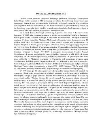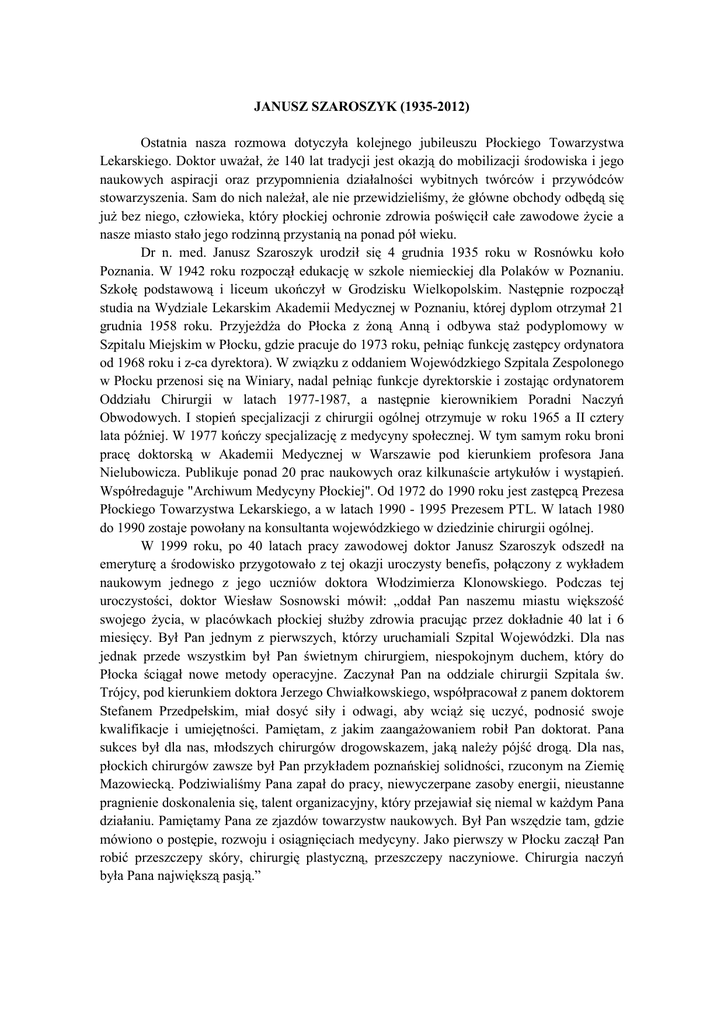 JANUSZ SZAROSZYK (1935-2012) Ostatnia nasza rozmowa dotyczyła kolejnego jubileuszu Płockiego Towarzystwa Lekarskiego. Doktor uważał, że 140 lat tradycji jest okazją do mobilizacji środowiska i jego naukowych aspiracji oraz przypomnienia działalności wybitnych twórców i przywódców stowarzyszenia. Sam do nich należał, ale nie przewidzieliśmy, że główne obchody odbędą się już bez niego, człowieka, który płockiej ochronie zdrowia poświęcił całe zawodowe życie a nasze miasto stało jego rodzinną przystanią na ponad pół wieku. Dr n. med. Janusz Szaroszyk urodził się 4 grudnia 1935 roku w Rosnówku koło Poznania. W 1942 roku rozpoczął edukację w szkole niemieckiej dla Polaków w Poznaniu. Szkołę podstawową i liceum ukończył w Grodzisku Wielkopolskim. Następnie rozpoczął studia na Wydziale Lekarskim Akademii Medycznej w Poznaniu, której dyplom otrzymał 21 grudnia 1958 roku. Przyjeżdża do Płocka z żoną Anną i odbywa staż podyplomowy w Szpitalu Miejskim w Płocku, gdzie pracuje do 1973 roku, pełniąc funkcję zastępcy ordynatora od 1968 roku i z-ca dyrektora). W związku z oddaniem Wojewódzkiego Szpitala Zespolonego w Płocku przenosi się na Winiary, nadal pełniąc funkcje dyrektorskie i zostając ordynatorem Oddziału Chirurgii w latach 1977-1987, a następnie kierownikiem Poradni Naczyń Obwodowych. I stopień specjalizacji z chirurgii ogólnej otrzymuje w roku 1965 a II cztery lata później. W 1977 kończy specjalizację z medycyny społecznej. W tym samym roku broni pracę doktorską w Akademii Medycznej w Warszawie pod kierunkiem profesora Jana Nielubowicza. Publikuje ponad 20 prac naukowych oraz kilkunaście artykułów i wystąpień. Współredaguje "Archiwum Medycyny Płockiej". Od 1972 do 1990 roku jest zastępcą Prezesa Płockiego Towarzystwa Lekarskiego, a w latach 1990 - 1995 Prezesem PTL. W latach 1980 do 1990 zostaje powołany na konsultanta wojewódzkiego w dziedzinie chirurgii ogólnej. W 1999 roku, po 40 latach pracy zawodowej doktor Janusz Szaroszyk odszedł na emeryturę a środowisko przygotowało z tej okazji uroczysty benefis, połączony z wykładem naukowym jednego z jego uczniów doktora Włodzimierza Klonowskiego. Podczas tej uroczystości, doktor Wiesław Sosnowski mówił: „oddał Pan naszemu miastu większość swojego życia, w placówkach płockiej służby zdrowia pracując przez dokładnie 40 lat i 6 miesięcy. Był Pan jednym z pierwszych, którzy uruchamiali Szpital Wojewódzki. Dla nas jednak przede wszystkim był Pan świetnym chirurgiem, niespokojnym duchem, który do Płocka ściągał nowe metody operacyjne. Zaczynał Pan na oddziale chirurgii Szpitala św. Trójcy, pod kierunkiem doktora Jerzego Chwiałkowskiego, współpracował z panem doktorem Stefanem Przedpełskim, miał dosyć siły i odwagi, aby wciąż się uczyć, podnosić swoje kwalifikacje i umiejętności. Pamiętam, z jakim zaangażowaniem robił Pan doktorat. Pana sukces był dla nas, młodszych chirurgów drogowskazem, jaką należy pójść drogą. Dla nas, płockich chirurgów zawsze był Pan przykładem poznańskiej solidności, rzuconym na Ziemię Mazowiecką. Podziwialiśmy Pana zapał do pracy, niewyczerpane zasoby energii, nieustanne pragnienie doskonalenia się, talent organizacyjny, który przejawiał się niemal w każdym Pana działaniu. Pamiętamy Pana ze zjazdów towarzystw naukowych. Był Pan wszędzie tam, gdzie mówiono o postępie, rozwoju i osiągnięciach medycyny. Jako pierwszy w Płocku zaczął Pan robić przeszczepy skóry, chirurgię plastyczną, przeszczepy naczyniowe. Chirurgia naczyń była Pana największą pasją.” Żegnamy dzisiaj skromnego i uczciwego lekarza, szanowanego kolegę, nauczyciela i mistrza, człowieka z autorytetem i pasją, bez której płocka medycyna rozwijałaby się wolniej. Panie doktorze! Przez wiele lat spotykaliśmy się podczas posiedzeń Katolickiego Stowarzyszenia Lekarzy Polskich. Niech Pan doktor zadba o godne miejsce naszego ponownego widzenia i kontynuacji przerwanej rozmowy, wśród wszystkich twórców i legend małego, ale trwałego środowiska płockich medyków. Tymczasem umieszczam Pańskie nazwisko w Panteonie Wybitnych Płockich Lekarzy i do zobaczenia! Jarosław Wanecki