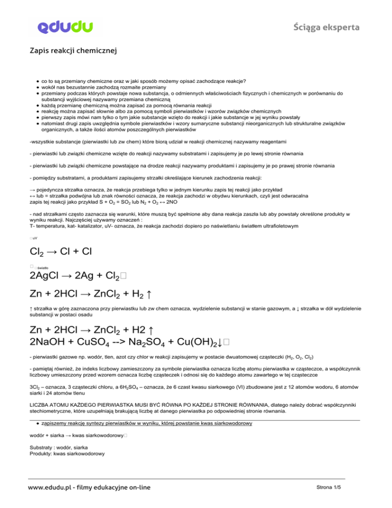 Ściąga eksperta Zapis reakcji chemicznej co to są przemiany chemiczne oraz w jaki sposób możemy opisać zachodzące reakcje? wokół nas bezustannie zachodzą rozmaite przemiany przemiany podczas których powstaje nowa substancja, o odmiennych właściwościach fizycznych i chemicznych w porównaniu do substancji wyjściowej nazywamy przemiana chemiczną każdą przemianę chemiczną można zapisać za pomocą równania reakcji reakcję można zapisać słownie albo za pomocą symboli pierwiastków i wzorów związków chemicznych pierwszy zapis mówi nam tylko o tym jakie substancje wzięto do reakcji i jakie substancje w jej wyniku powstały natomiast drugi zapis uwzględnia symbole pierwiastków i wzory sumaryczne substancji nieorganicznych lub strukturalne związków organicznych, a także ilości atomów poszczególnych pierwiastków -wszystkie substancje (pierwiastki lub zw chem) które biorą udział w reakcji chemicznej nazywamy reagentami - pierwiastki lub związki chemiczne wzięte do reakcji nazywamy substratami i zapisujemy je po lewej stronie równania - pierwiastki lub związki chemiczne powstające na drodze reakcji nazywamy produktami i zapisujemy je po prawej stronie równania - pomiędzy substratami, a produktami zapisujemy strzałki określające kierunek zachodzenia reakcji: → pojedyncza strzałka oznacza, że reakcja przebiega tylko w jednym kierunku zapis tej reakcji jako przykład ↔ lub = strzałka podwójna lub znak równości oznacza, że reakcja zachodzi w obydwu kierunkach, czyli jest odwracalna zapis tej reakcji jako przykład S + O2 = SO2 lub N2 + O2 ↔ 2NO - nad strzałkami często zaznacza się warunki, które muszą być spełnione aby dana reakcja zaszła lub aby powstały określone produkty w wyniku reakcji. Najczęściej używamy oznaczeń : T- temperatura, kat- katalizator, uV- oznacza, że reakcja zachodzi dopiero po naświetlaniu światłem ultrafioletowym uV Cl2 → Cl + Cl światło 2AgCl → 2Ag + Cl2 Zn + 2HCl → ZnCl2 + H2 ↑ ↑ strzałka w górę zaznaczona przy pierwiastku lub zw chem oznacza, wydzielenie substancji w stanie gazowym, a ↓ strzałka w dół wydzielenie substancji w postaci osadu Zn + 2HCl → ZnCl2 + H2 ↑ 2NaOH + CuSO4 --> Na2SO4 + Cu(OH)2↓ - pierwiastki gazowe np. wodór, tlen, azot czy chlor w reakcji zapisujemy w postacie dwuatomowej cząsteczki (H2, O2, Cl2) - pamiętaj również, że indeks liczbowy zamieszczony za symbole pierwiastka oznacza liczbę atomu pierwiastka w cząsteczce, a współczynnik liczbowy umieszczony przed wzorem oznacza liczbę cząsteczek i odnosi się do każdego atomu zawartego w tej cząsteczce 3Cl2 – oznacza, 3 cząsteczki chloru, a 6H2SO4 – oznacza, że 6 czast kwasu siarkowego (VI) zbudowane jest z 12 atomów wodoru, 6 atomów siarki i 24 atomów tlenu LICZBA ATOMU KAŻDEGO PIERWIASTKA MUSI BYĆ RÓWNA PO KAŻDEJ STRONIE RÓWNANIA, dlatego należy dobrać współczynniki stechiometryczne, które uzupełniają brakującą liczbę at danego pierwiastka po odpowiedniej stronie równania. zapiszemy reakcję syntezy pierwiastków w wyniku, której powstanie kwas siarkowodorowy wodór + siarka → kwas siarkowodorowy Substraty : wodór, siarka Produkty: kwas siarkowodorowy www.edudu.pl - filmy edukacyjne on-line Strona 1/5 Ściąga eksperta substratami tej reakcji są wodór i siarka, a produktem kwas siarkowodorowy H + S → H S zapis tej reakcji za pomocą symboli i wzorów będzie wyglądał następująco: 2 2 zapis pojawia się gdy go odczytuje wodór jak już wspominałam zapisujemy w postaci cząsteczki dwuatomowej gdy czytam, że po lewej stronie znajdują się 2 atomy wodoru, można podkreślić albo zaznaczyć te atomy na inny kolor dla lepszego zobrazowania, następnie gdy czytam, że taka sama ilość jest po prawej podkreślić te atomy po prawej i pod równaniem można umieścić zapis: 2 atomy H = 2 atomy H L = P po lewej stronie znajdują się 2 atomy wodoru taka sama ilość jest po stronie prawej. Ilość atomów siarki po lewej i po prawej stronie równania jest również identyczna zapiszmy reakcję syntezy tlenku glinu glin + tlen→ tlenek glinu Substraty : glin, tlen Produkty: tlenek glinu jako substraty użyliśmy glinu i tlenu wwyniku reakcji syntezy powstał produkt - tlenek glinu Al + O2 → Al2O3 wzór tlenku glinu ma postać Al2O3, ponieważ przy jego ustalaniu korzystamy z reguły krzyża Al jest III, a O II indeksy zapisujemy na krzyż zanim dobierzemy współczynniki stechiometryczne przeliczmy najpierw atomy poszczególnych pierwiastków po obu stronach równania www.edudu.pl - filmy edukacyjne on-line Strona 2/5 Ściąga eksperta po lewej stronie znajduje się 1 atomy Al i 2 atomyt O, a po prawej 2 atomy Al i 3 atomy O aby ilość atomów O po obu stronach równania była jednakowa należy wpisać współczynnik 3 po lewej stronie równania, a www.edudu.pl - filmy edukacyjne on-line Strona 3/5 Ściąga eksperta Al + 3O → 2Al O współczynnik 2 po prawej stronie 2 3 2 po obu stronach równania znajduje się po 6 atomów O po prawej stronie znajdują się 4 at tego pierwiastka, a po lewej 1 atom aby uzupełnić brakującą liczbę atomów wpisujemy 4 przed symbolem pierwiastka 4Al + 3O2 →2 Al2O3 po uzgodnieniu równania odczytujemy: 4 atomy Al przereagowały z 3 cząsteczkami O, w wyniku czego powstały 2 cząst tlenku glinu jako substratów użyjemy siarczanu (VI) żelaza (III) i azotanu (V) ołowiu (II). W wyniku reakcji powstały siarczan (VI) ołowiu (II) oraz azotan (V) żelaza (III) poprawny zapis słowny tej reakcji powinien wyglądać w następujący sposób: siarczanu(VI) żelaza(III) + azotanu(V) ołowiu(II) → siarczan(VI) ołowiu(II) ↓ + azotan(V) żelaza(III) apisując reakcję należy uwzględnić, że w jej wyniku wydziela się siarczan(VI) ołowiu(II) w postaci osadu przy związku tym należy narysować strzałkę skierowaną w dół strzałka w dół pojawia się wtedy gdy mówię, że jej zapis jest konieczny zapiszmy przeb