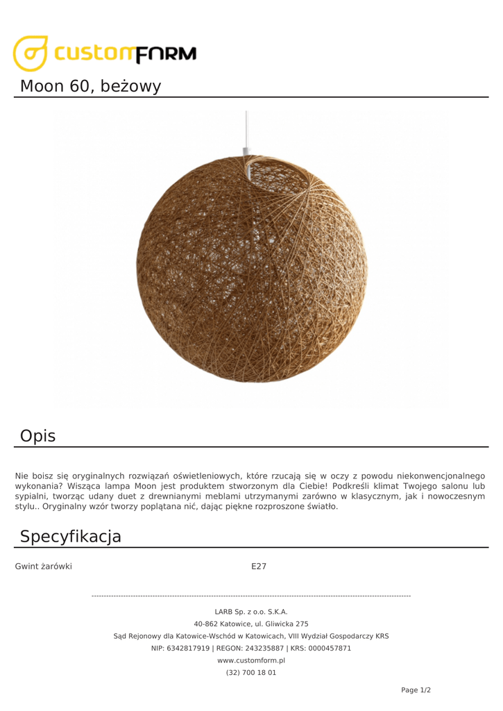 Moon 60, beżowy Opis Nie boisz się oryginalnych rozwiązań oświetleniowych, które rzucają się w oczy z powodu niekonwencjonalnego wykonania? Wisząca lampa Moon jest produktem stworzonym dla Ciebie! Podkreśli klimat Twojego salonu lub sypialni, tworząc udany duet z drewnianymi meblami utrzymanymi zarówno w klasycznym, jak i nowoczesnym stylu.. Oryginalny wzór tworzy poplątana nić, dając piękne rozproszone światło. Specyfikacja Gwint żarówki E27 ----------------------------------------------------------------------------------------------------------------------------------LARB Sp. z o.o. S.K.A. 40-862 Katowice, ul. Gliwicka 275 Sąd Rejonowy dla Katowice-Wschód w Katowicach, VIII Wydział Gospodarczy KRS NIP: 6342817919 | REGON: 243235887 | KRS: 0000457871 www.customform.pl (32) 700 18 01 Page 1/2 Średnica 60 cm Moc żarówki max 60W Ilość żarówek 1 Żarówka w komplecie nie Materiał żywica wzmocniona włóknem szklanym Dodatkowe zdjęcia ----------------------------------------------------------------------------------------------------------------------------------LARB Sp. z o.o. S.K.A. 40-862 Katowice, ul. Gliwicka 275 Sąd Rejonowy dla Katowice-Wschód w Katowicach, VIII Wydział Gospodarczy KRS NIP: 6342817919 | REGON: 243235887 | KRS: 0000457871 www.customform.pl (32) 700 18 01 Page 2/2 Powered by TCPDF (www.tcpdf.org)