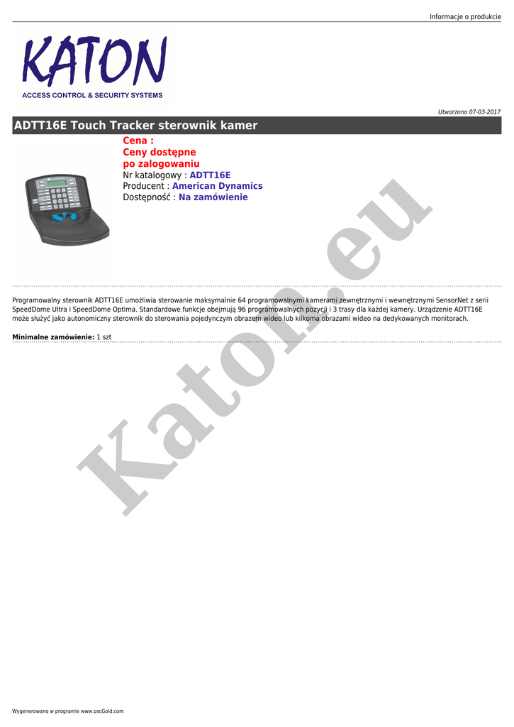 Informacje o produkcie Utworzono 07-03-2017 ADTT16E Touch Tracker sterownik kamer Cena : Ceny dostępne po zalogowaniu at on . eu Nr katalogowy : ADTT16E Producent : American Dynamics Dostępność : Na zamówienie Programowalny sterownik ADTT16E umożliwia sterowanie maksymalnie 64 programowalnymi kamerami zewnętrznymi i wewnętrznymi SensorNet z serii SpeedDome Ultra i SpeedDome Optima. Standardowe funkcje obejmują 96 programowalnych pozycji i 3 trasy dla każdej kamery. Urządzenie ADTT16E może służyć jako autonomiczny sterownik do sterowania pojedynczym obrazem wideo lub kilkoma obrazami wideo na dedykowanych monitorach. K Minimalne zamówienie: 1 szt Wygenerowano w programie www.oscGold.com