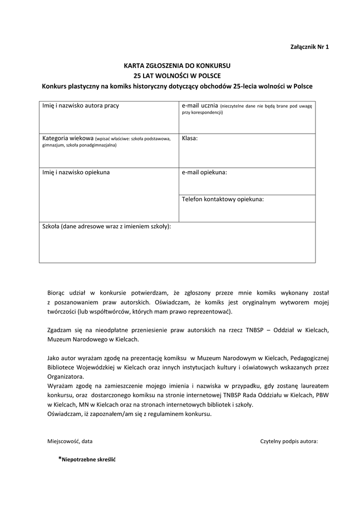 Załącznik Nr 1 KARTA ZGŁOSZENIA DO KONKURSU 25 LAT WOLNOŚCI W POLSCE Konkurs plastyczny na komiks historyczny dotyczący obchodów 25-lecia wolności w Polsce Imię i nazwisko autora pracy e-mail ucznia Kategoria wiekowa (wpisać właściwe: szkoła podstawowa, Klasa: (nieczytelne dane nie będą brane pod uwagę przy korespondencji) gimnazjum, szkoła ponadgimnazjalna) Imię i nazwisko opiekuna e-mail opiekuna: Telefon kontaktowy opiekuna: Szkoła (dane adresowe wraz z imieniem szkoły): Biorąc udział w konkursie potwierdzam, że zgłoszony przeze mnie komiks wykonany został z poszanowaniem praw autorskich. Oświadczam, że komiks jest oryginalnym wytworem mojej twórczości (lub współtwórców, których mam prawo reprezentować). Zgadzam się na nieodpłatne przeniesienie praw autorskich na rzecz TNBSP – Oddział w Kielcach, Muzeum Narodowego w Kielcach. Jako autor wyrażam zgodę na prezentację komiksu w Muzeum Narodowym w Kielcach, Pedagogicznej Bibliotece Wojewódzkiej w Kielcach oraz innych instytucjach kultury i oświatowych wskazanych przez Organizatora. Wyrażam zgodę na zamieszczenie mojego imienia i nazwiska w przypadku, gdy zostanę laureatem konkursu, oraz dostarczonego komiksu na stronie internetowej TNBSP Rada Oddziału w Kielcach, PBW w Kielcach, MN w Kielcach oraz na stronach internetowych bibliotek i szkoły. Oświadczam, iż zapoznałem/am się z regulaminem konkursu. Miejscowość, data *Niepotrzebne skreślić Czytelny podpis autora: