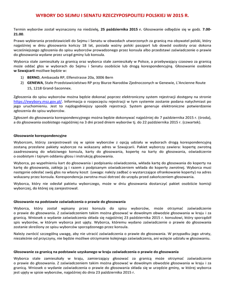 WYBORY DO SEJMU I SENATU RZECZYPOSPOLITEJ POLSKIEJ W 2015 R. Termin wyborów został wyznaczony na niedzielę, 25 października 2015 r. Głosowanie odbędzie się w godz. 7.0021.00. Prawo wybierania przedstawicieli do Sejmu i Senatu w obwodach utworzonych za granicą ma obywatel polski, który najpóźniej w dniu głosowania kończy 18 lat, posiada ważny polski paszport lub dowód osobisty oraz dokona wcześniejszego zgłoszenia do spisu wyborców prowadzonego przez konsula albo przedstawi zaświadczenie o prawie do głosowania wydane przez urząd gminy lub konsula. Wyborca stale zamieszkały za granicą oraz wyborca stale zamieszkały w Polsce, a przebywający czasowo za granicą może oddać głos w wyborach do Sejmu i Senatu osobiście lub drogą korespondencyjną. Głosowanie osobiste w Szwajcarii możliwe będzie w: 1) BERNO, Ambasada RP, Elfenstrasse 20a, 3006 Bern 2) GENEWA, Stałe Przedstawicielstwo RP przy Biurze Narodów Zjednoczonych w Genewie, L’Ancienne Route 15, 1218 Grand-Saconnex. Zgłoszenia do spisu wyborców można będzie dokonać poprzez elektroniczny system rejestracji dostępny na stronie https://ewybory.msz.gov.pl/. Informacja o rozpoczęciu rejestracji w tym systemie zostanie podana natychmiast po jego uruchomieniu. Jest to najdogodniejszy sposób rejestracji. System generuje elektroniczne potwierdzenie zgłoszenia do spisu wyborców. Zgłoszeń do głosowania korespondencyjnego można będzie dokonywać najpóźniej do 7 października 2015 r. (środa), a do głosowania osobistego najpóźniej na 3 dni przed dniem wyborów tj. do 22 października 2015 r. (czwartek). Głosowanie korespondencyjne Wyborcom, którzy zarejestrowali się w spisie wyborców z opcją udziału w wyborach drogą korespondencyjną zostaną przesłane pakiety wyborcze na wskazany adres w Szwajcarii. Pakiet wyborczy zawiera: kopertę zwrotną zaadresowaną do właściwego konsula, karty do głosowania, kopertę na karty do głosowania, oświadczenie o osobistym i tajnym oddaniu głosu i instrukcję głosowania. Wyborca, po wypełnieniu kart do głosowania i podpisaniu oświadczenia, wkłada kartę do głosowania do koperty na kartę do głosowania, zakleja ją i razem z podpisanym oświadczeniem wkłada do koperty zwrotnej. Wyborca musi następnie odesłać swój głos na własny koszt (uwaga: należy zadbać o wystarczające ofrankowanie koperty) na adres wskazany przez konsula. Korespondencja zwrotna musi dotrzeć do urzędu przed zakończeniem głosowania. Wyborca, który nie odesłał pakietu wyborczego, może w dniu głosowania dostarczyć pakiet osobiście komisji wyborczej, do której się zarejestrował. Głosowanie na podstawie zaświadczenia o prawie do głosowania Wyborca, który został wpisany przez konsula do spisu wyborców, może otrzymać zaświadczenie o prawie do głosowania. Z zaświadczeniem takim można głosować w dowolnym obwodzie głosowania w kraju i za granicą. Wniosek o wydanie zaświadczenia składa się najpóźniej 23 października 2015 r. konsulowi, który sporządził spis wyborów, w którym wyborca jest ujęty. Wyborca, któremu wydano zaświadczenie o prawie do głosowania zostanie skreślony ze spisu wyborców sporządzonego przez konsula. Należy zwrócić szczególną uwagę, aby nie utracić zaświadczenia o prawie do głosowania. W przypadku jego utraty, niezależnie od przyczyny, nie będzie możliwe otrzymanie kolejnego zaświadczenia, ani wzięcie udziału w głosowaniu. Głosowanie za granicą na podstawie uzyskanego w kraju zaświadczenia o prawie do głosowania Wyborca stale zamieszkały w kraju, zamierzający głosować za granicą może otrzymać zaświadczenie o prawie do głosowania. Z zaświadczeniem takim można głosować w dowolnym obwodzie głosowania w kraju i za granicą. Wniosek o wydanie zaświadczenia o prawie do głosowania składa się w urzędzie gminy, w której wyborca jest ujęty w spisie wyborców, najpóźniej do dnia 23 października 2015 r.