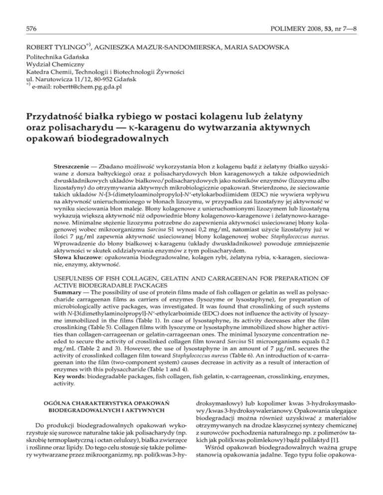 POLIMERY 2008, 53, nr 7—8 576 ROBERT TYLINGO∗), AGNIESZKA MAZUR-SANDOMIERSKA, MARIA SADOWSKA Politechnika Gdañska Wydzia³ Chemiczny Katedra Chemii, Technologii i Biotechnologii ¯ywnoœci ul. Narutowicza 11/12, 80-952 Gdañsk ∗) e-mail: [email protected] Przydatnoœæ bia³ka rybiego w postaci kolagenu lub ¿elatyny oraz polisacharydu — κ-karagenu do wytwarzania aktywnych opakowañ biodegradowalnych Streszczenie — Zbadano mo¿liwoœæ wykorzystania b³on z kolagenu b¹dŸ z ¿elatyny (bia³ko uzyskiwane z dorsza ba³tyckiego) oraz z polisacharydowych b³on karagenowych a tak¿e odpowiednich dwusk³adnikowych uk³adów bia³kowo/polisacharydowych jako noœników enzymów (lizozymu albo lizostafyny) do otrzymywania aktywnych mikrobiologicznie opakowañ. Stwierdzono, ¿e sieciowanie takich uk³adów N-[3-(dimetyloamino)propylo]-N‘-etylokarbodiimidem (EDC) nie wywiera wp³ywu na aktywnoœæ unieruchomionego w b³onach lizozymu, w przypadku zaœ lizostafyny jej aktywnoœæ w wyniku sieciowania b³on maleje. B³ony kolagenowe z unieruchomionymi lizozymem lub lizostafyn¹ wykazuj¹ wiêksz¹ aktywnoœæ ni¿ odpowiednie b³ony kolagenowo-karagenowe i ¿elatynowo-karagenowe. Minimalne stê¿enie lizozymu potrzebne do zapewnienia aktywnoœci usieciowanej b³ony kolagenowej wobec mikroorganizmu Sarcina S1 wynosi 0,2 mg/ml, natomiast u¿ycie lizostafyny ju¿ w iloœci 7 µg/ml zapewnia aktywnoœæ usieciowanej b³ony kolagenowej wobec Staphylococcus aureus. Wprowadzenie do b³ony bia³kowej κ-karagenu (uk³ady dwusk³adnikowe) powoduje zmniejszenie aktywnoœci w skutek oddzia³ywania enzymów z tym polisacharydem. S³owa kluczowe: opakowania biodegradowalne, kolagen rybi, ¿elatyna rybia, κ-karagen, sieciowanie, enzymy, aktywnoœæ. USEFULNESS OF FISH COLLAGEN, GELATIN AND CARRAGEENAN FOR PREPARATION OF ACTIVE BIODEGRADABLE PACKAGES Summary — The possibility of use of protein films made of fish collagen or gelatin as well as polysaccharide carrageenan films as carriers of enzymes (lysozyme or lysostaphyne), for preparation of microbiologically active packages, was investigated. It was found that crosslinking of such systems with N-[3(dimethylamino)propyl]-N‘-ethylcarboimide (EDC) does not influence the activity of lysozyme immobilized in the films (Table 1). In case of lysostaphyne, its activity decreases after the film crosslinking (Table 5). Collagen films with lysozyme or lysostaphyne immobilized show higher activities than collagen-carrageenan or gelatin-carrageenan ones. The minimal lysozyme concentration needed to secure the activity of crosslinked collagen film toward Sarcina S1 microorganisms equals 0.2 mg/mL (Table 2 and 3). However, the use of lysostaphyne in an amount of 7 µg/mL secures the activity of crosslinked collagen film toward Staphylococcus aureus (Table 6). An introduction of κ-carrageenan into the film (two-component system) causes decrease in activity as a result of interaction of enzymes with this polysaccharide (Table 1 and 4). Key words: biodegradable packages, fish collagen, fish gelatin, κ-carrageenan, crosslinking, enzymes, activity. OGÓLNA CHARAKTERYSTYKA OPAKOWAÑ BIODEGRADOWALNYCH I AKTYWNYCH Do produkcji biodegradowalnych opakowañ wykorzystuje siê surowce naturalne takie jak polisacharydy (np. skrobiê termoplastyczn¹ i octan celulozy), bia³ka zwierzêce i roœlinne oraz lipidy. Do tego celu stosuje siê tak¿e polimery wytwarzane przez mikroorganizmy, np. poli(kwas 3-hy- droksymas³owy) lub kopolimer kwas 3-hydroksymas³owy/kwas 3-hydroksywalerianowy. Opakowania ulegaj¹ce biodegradacji mo¿na równie¿ uzyskiwaæ z materia³ów otrzymywanych na drodze klasycznej syntezy chemicznej z surowców pochodzenia naturalnego np. z polimerów takich jak poli(kwas polimlekowy) b¹dŸ polilaktyd [1]. Wœród opakowañ biodegradowalnych wa¿n¹ grupê stanowi¹ opakowania jadalne. Tego typu folie opakowa- POLIMERY 2008, 53, nr 7—8 niowe mog¹ byæ wytwarzane ze wspomnianych ju¿ grup surowców naturalnych, mianowicie z bia³ek (glutenu, pszenicy, kolagenu, kazeiny, bia³ek serwatki), polisacharydów (alginianów, karagenów, skrobi, pektyn i dekstryn) oraz lipidów (acylogliceroli i kwasów t³uszczowych) [2, 3]. Jadalne folie opakowaniowe czêsto staj¹ siê integraln¹ czêœci¹ produktu. Dzieje siê tak wtedy, gdy formuje siê je bezpoœrednio na powierzchni pakowanego wyrobu w wyniku zanurzenia w roztworze b³onotwórczym b¹dŸ rozpylenia b³ony na produkcie. Mo¿liwe jest równie¿ u¿ycie takich folii do rozdzielenia poszczególnych warstw towaru, np. w wyrobach cukierniczych. Z tego wzglêdu folie jadalne powinny byæ bezwonne i pozbawione smaku, ponadto jest konieczne, aby spe³nia³y wszystkie wymogi jakoœci i bezpieczeñstwa dotycz¹ce ¿ywnoœci. Czêœæ sk³adników, z których powstaj¹ jadalne folie, jest trawiona w przewodzie pokarmowym, pozosta³e zaœ, np. polisacharydy (celuloza, hemicelulozy, pektyny, gumy, œluzy) i ligniny nie ulegaj¹ dzia³aniu enzymów trawiennych. Opakowania aktywne to materia³y, które dziêki zawartym w nich tzw. substancjom aktywnym — powoduj¹cym np. niszczenie lub hamowanie wzrostu drobnoustrojów wystêpuj¹cych w ¿ywnoœci — zapobiegaj¹ niekorzystnym zmianom jakoœci pakowanego produktu. Aby zapewniæ sta³y kontakt takiego czynnego sk³adnika z produktem musi on zostaæ w odpowiedni sposób unieruchomiony w opakowaniu. Najprostsze rozwi¹zanie stanowi umieszczenie wewn¹trz tradycyjnego opakowania specjalnego systemu emituj¹cego tê substancjê. Zadanie to mo¿e spe³niaæ np. saszetka z mikroporowatym materia³em nasyconym aktywnym zwi¹zkiem. Innym rozwi¹zaniem jest wbudowanie czynnego dodatku w strukturê samego opakowania lub stworzenie na nim otoczki z takiej substancji. W tego typu systemach wykorzystuje siê rozmaite folie — biodegradowalne oraz niebiodegradowalne wytwarzane z syntetycznych tworzyw polimerowych [4]. W charakterze sk³adnika aktywnego jadalnych b³on stosuje s