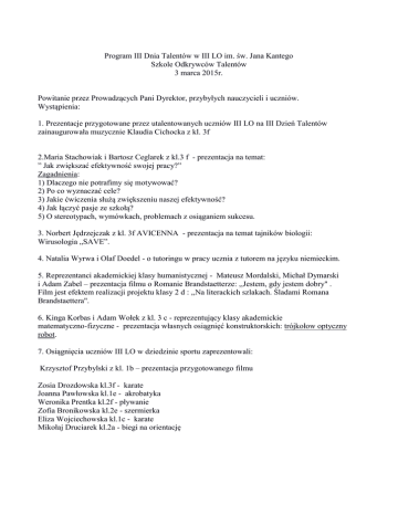Program III Dnia Talentów w III LO im. św. Jana Kantego Szkole Odkrywców Talentów 3 marca 2015r. Powitanie przez Prowadzących Pani Dyrektor, przybyłych nauczycieli i uczniów. Wystąpienia: 1. Prezentacje przygotowane przez utalentowanych uczniów III LO na III Dzień Talentów zainaugurowała muzycznie Klaudia Cichocka z kl. 3f 2.Maria Stachowiak i Bartosz Ceglarek z kl.3 f - prezentacja na temat: ” Jak zwiększać efektywność swojej pracy?” Zagadnienia: 1) Dlaczego nie potrafimy się motywować? 2) Po co wyznaczać cele? 3) Jakie ćwiczenia służą zwiększeniu naszej efektywność? 4) Jak łączyć pasje ze szkołą? 5) O stereotypach, wymówkach, problemach z osiąganiem sukcesu. 3. Norbert Jędrzejczak z kl. 3f AVICENNA - prezentacja na temat tajników biologii: Wirusologia „SAVE”. 4. Natalia Wyrwa i Olaf Doedel - o tutoringu w pracy ucznia z tutorem na języku niemieckim. 5. Reprezentanci akademickiej klasy humanistycznej - Mateusz Mordalski, Michał Dymarski i Adam Zabel – prezentacja filmu o Romanie Brandstaetterze: ,,Jestem, gdy jestem dobry" . Film jest efektem realizacji projektu klasy 2 d : ,,Na literackich szlakach. Śladami Romana Brandstaettera". 6. Kinga Korbas i Adam Wołek z kl. 3 c - reprezentujący klasy akademickie matematyczno-fizyczne - prezentacja własnych osiągnięć konstruktorskich: trójkołow optyczny robot. 7. Osiągnięcia uczniów III LO w dziedzinie sportu zaprezentowali: Krzysztof Przybylski z kl. 1b – prezentacja przygotowanego filmu Zosia Drozdowska kl.3f - karate Joanna Pawłowska kl.1e - akrobatyka Weronika Prentka kl.2f - pływanie Zofia Bronikowska kl.2e - szermierka Eliza Wojciechowska kl.1c - karate Mikołaj Druciarek kl.2a - biegi na orientację 8. Osiągnięcia związane z dziedziną historii: Mateusz Rezler – absolwent, student II roku prawa; finalista Olimpiady Historycznej Iga Ciesielska – dwukrotny uczestnik szczebla rejonowego Olimpiady Historycznej Karol Mędak – członek zespołu debat oksfordzkich 9. Muzczne zakończenie prezentacji. Zofia Bartkowiak z kl. 2a - dwa utwory: „Falling Slowly” i „1000 miles”. Zosia - jest finalistką XXV edycji Festiwalu Muzycznego Młodych Talentów Polskiej Sceny WYBRYK, - zdobyła wyróżnienie w konkursie piosenki irlandzkiej w Poznaniu w 2014 roku, - posiada własne studio nagrań (!) III DZIEŃ TALENTÓW w III LO im. św. JANA KANTEGO w POZNANIU MARZEC 2015 Nasza Szkoła od trzech lat należy do sieci Szkół Odkrywców Talentów, uczestnicząc w projekcie Ośrodka Rozwoju Edukacji. Każdego roku w marcu utalentowani uczniowie prezentują swoje osiągnięcia i działania związane z rozwijaniem pasji w różnych dziedzinach. Aula III LO im. św. Jana Kantego w Poznaniu stała się 03.03.2015r. miejscem takiego wydarzenia. Tegoroczne prezentacje przygotowane przez utalentowanych Uczniów III LO w Poznaniu zainaugurowała Klaudia Cichocka z kl. 3f, wprowadzając słuchaczy w pogodny nastrój swoim występem wokalno-instrumentalnym, pełnym wrażliwości i pasji... Maria Stachowiak i Bartosz Ceglarek z kl. 3f przekonywali odbiorców, że możliwym jest osiągnięcie przez każdego z nas 5 sukcesów dziennie, a 5 sukcesów x 365 dni TO 1825 SUKCESÓW w ROKU!:-) Odwołując się do zdobytej wiedzy i osobistych doświadczeń, z niezwykłym zaangażowaniem mówili o tym, jakie ćwiczenia należy wykonywać, by zwiększyć efektywność swojej pracy, jak łączyć pasje z obowiązkami szkolnymi, po co wyznaczać cele i w jaki sposób pokonywać problemy w dążeniu do osiągnięcia sukcesu! O swoich pasjach związanych ze zgłębianiem tajników historii i poznawaniem odległych zakątków świata opowiedział absolwent III LO – student I roku prawa - Mateusz Rezler, potwierdzając treści przekazane przez Marię i Bartosza. Historia to także pasja i pole sukcesów Ingi Ciesielskiej, która zachęcała rówieśników do udziału w Olimpiadzie Historycznej, będąc dwukrotnie uczestniczką szczebla rejonowego olimpiady. A o tym, czym są debaty oksfordzkie opowiedział Karol Mędak – zaangażowany w prężne działania zespołu debat naszego liceum. Czym jest tutoring w indywidualizowaniu pracy ucznia przez nauczyciela mówili, w odniesieniu do pracy na języku niemieckim, Natalia Wyrwa i Olaf Doedel, zachęcając koleżanki i kolegów do pracy ze swoimi tutorami i do uczenia się języków obcych. Uczniowie humanistycznej klasy akademickiej 2d – Michał Dymarski, Mateusz Mordalski i Adam Zabel – przedstawili film o Romanie Brandstaetterze: „ Jestem, gdy jestem dobry”. Film ten został zrealizowany przez uczniów w projekcie: „Na literackich szlakach. Śladami Romana Brandstaettera”. Nie zabrakło pasjonatów nauk ścisłych i przyrodniczych! W tajniki nauk przyrodniczych wprowadził nas Norbert Jędrzejczak z kl. 3f, prezentując efekty swojej pracy naukowej na temat: Wirusologia „Save”. Jacek Gulij i Karol Loręcki przekonywali rówieśników do matematyki, natomiast młodzi fizycy Kinga Korbas i Adam Wołek z kl. 3c – zaprezentowali oprogramowanie i działanie skonstruowanego przez nich trójkołowego optycznego robota! Niezwykłymi osiągnięciami mogą poszczycić się uczniowie III LO im. św. Jana Kantego również w dziedzinie sportu. Dokumentuje je film Krzysztofa Przybylskiego z kl. 1b, obrazujący pasje, uzdolnienia, sukcesy sportowe w różnych dyscyplinach. Zofia Bronikowska z kl. 2e zaprezentowała rówieśnikom swoje umiejętności w dziedzinie szermierki. W akrobatyce osiąga sukcesy Joanna Pawłowska z kl.1e, w pływaniu – Weronika Prentka, sukcesy w karate odnoszą Zofia Drozdowska z kl. 3f i Eliza Wojciechowska z kl. 1c, a w biegach na orientację – Mikołaj Druciarek z kl. 2a. Prezentacje w III Dniu Talentów zakończył występ uczennicy kl. 2a - Zofii Bartkowiak, która jest finalistką XXV edycji Festiwalu Muzycznego Młodych Talentów Polskiej Sceny WYBRYK. W imieniu Pani Dyrektor III LO im. św. Jana Kantego w Poznaniu i z