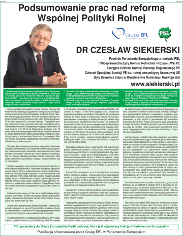 REKLAMA 2466114/00 Podsumowanie prac nad reformą Wspólnej Polityki Rolnej DR CZESŁAW SIEKIERSKI Poseł do Parlamentu Europejskiego z ramienia PSL I Wiceprzewodniczący Komisji Rolnictwa i Rozwoju Wsi PE Zastępca Członka Komisji Rozwoju Regionalnego PE Członek Specjalnej komisji PE ds. nowej perspektywy finansowej UE Były Sekretarz Stanu w Ministerstwie Rolnictwa i Rozwoju Wsi www.siekierski.pl Założenia legislacyjne reformy Wspólnej Polityki Rolnej zostały oficjalnie przedstawione przez Komisarza ds. Rolnictwa i Rozwoju Obszarów Wiejskich Daciana Ciolosa 12 października 2011 roku. Są to już propozycje w postaci projektów rozporządzeń, tj. aktów decyzyjnych. Pakiet legislacyjny obejmuje siedem projektów rozporządzeń, z czego cztery mają zasadnicze znaczenie: 1. Wniosek dotyczący rozporządzenia Parlamentu Europejskiego i Rady ustanawiającego zasady przekazywania rolnikom płatności bezpośrednich wynikających z systemów wsparcia w ramach wspólnej polityki rolnej; 2. Wniosek dotyczący rozporządzenia Parlamentu Europejskiego i Rady ustanawiającego wspólną organizację rynku produktów rolnych; 3. Wniosek dotyczący rozporządzenia Parlamentu Europejskiego i Rady w sprawie wsparcia rozwoju obszarów wiejskich ze środków Europejskiego Funduszu Rolnego na rzecz Rozwoju Obszarów Wiejskich (EFRROW); 4. Wniosek dotyczący rozporządzenia Parlamentu Europejskiego i Rady w sprawie finansowania i monitorowania wspólnej polityki rolnej oraz zarządzania nią. Do ww. projektów rozporządzeń w Komisji Rolnictwa i Rozwoju Wsi Parlamentu Europejskiego przygotowane zostały raporty formułujące zmiany do propozycji Komisji Europejskiej. Następnie do tych raportów posłowie zgłaszali poprawki. W sumie do czterech głównych raportów została złożona rekordowa liczba blisko 8 tysięcy poprawek. W dn. 23-24 stycznia 2013 r. Komisja Rolnictwa i Rozwoju Wsi przyjęła w głosowaniu swoje stanowisko, które stało się podstawą stanowiska całego Parlamentu Europejskiego przyjętego w głosowaniu na sesji plenarnej w dn. 13 marca. Następnie na spotkaniu w dn. 19 marca swoje stanowisko przyjęła również Rada Ministrów Rolnictwa 27 państw członkowskich. Obecnie trwają rozmowy trójstronne (tzw. trylogi) między przedstawicielami Parlamentu Europejskiego, Rady UE i Komisji Europejskiej. Ostatecznego porozumienia można spodziewać się pod koniec czerwca. z 7-8 lutego br. W rezultacie tego porozumienia budżet WPR w UE zmalał o ok. 10 proc. I to jest wynik przyjętego przez Unię procesu ograniczania wydatków na rolnictwo. Natomiast to, że wzrosła pula środków dla Polski wynika z podpisanego Traktatu Akcesyjnego, gdzie zapisano upraszczając, że dopłaty dla naszych rolników mają się wyrównywać z dopłatami farmerów ze starej Unii. Zwiększony budżet z UE na I filar o 6 mld euro ma zastąpić nasze dopłaty krajowe, dlatego tak duża kwota wzrostu nie przekłada się na znaczące zwiększenie dopłat do hektara. Ale zmniejszono nam II filar - według moich wyliczeń o ok. 2,5 mld euro. W sumie na rolnictwo dostaniemy ok. 33 mld euro w cenach bieżących - ok. 22 mld na I filar i ponad 11 mld na II filar, czyli na inwestycje i wsparcie rozwoju obszarów wiejskich. (Według cen stałych z 2011 r. otrzymamy 28,6 mld euro, z czego 18,8 mld na I i 9,8 mld na II filar). Na ostatniej naszej międzynarodowej konferencji krakowskiej rok temu pokazywano w terenie możliwe rodzaje produkcji rozwijające się w gospodarstwach drobnych, w większości ta produkcja w gospodarstwie była połączona z pracą przedstawiciela rodziny poza gospodarstwem, a więc dochód z gospodarstwa był uzupełniany dochodem zewnętrznym. Pojawia się znaczna grupa gospodarstw, w których ten dochód dodatkowy pochodzi z produkcji pozarolniczej czy usług dla rolnictwa i sfery pozarolniczej prowadzonych przez osoby z tego gospodarstwa często na bazie infrastruktury i budynków tego gospodarstwa. Oceniając dotychczasowe porozumienia osiągnięte w Parlamencie i Radzie należy stwierdzić, że proponowana reforma Wspólnej Polityki Rolnej zawiera więcej elementów kontynuacji niż zmian. Stare państwa członkowskie obawiały się bowiem głębszych modyfikacji, aby nie naruszyć istniejącego podziału środków finansowych, który został ustanowiony w przeszłości. Dlatego z małymi korektami jest on utrzymywany. Na dopłaty dostaliśmy więcej o wspomniane 6 mld, a oprócz tego premier zapowiedział, że 25 proc. z II filaru, czyli 2,75 mld euro będzie można przesunąć do I filara, tj. na dopłaty bezpośrednie, aby zwiększyć ich wysokość i zbliżyć się do średniego poziomu w UE. Natomiast rzeczywiście będzie mniej w II filarze, bo najpierw (szczyt listopadowy) zredukowano nam go o ponad 3 mld euro (według moich wyliczeń) w porównaniu z obecnym okresem programowaniai jeśli przesuniemy jeszcze ponad 2 mld euro do I filara to nasz II filar będzie wynosić ponad 9 mld euro. Zabrakło koncepcji na zaproponowanie obiektywnych kryteriów podziału płatności bezpośrednich. Wprawdzie rozwiązania zaproponowane w obecnej reformie spłaszczają nieco różnice między krajami, ale ich nie likwidują. Najwięcej zyskują ci, którzy mieli najmniej - czyli kraje bałtyckie. Trochę tracą natomiast państwa mające najwyższe dopłaty, ale jest to niewielka kwota, ponieważ kraje zyskujące są małe. Niewiele otrzymują "kraje środka", do których zalicza się Polska. Wynika to m.in. z obniżenia środków na Wspólną Politykę Rolną w latach 2014-2020 w porównaniu do perspektywy finansowej 2007-2013 o 44 mld euro. Polska otrzymała więcej na I filar, ale te środki zastąpią dotychczasowy nasz wkład z budżetu narodowego, którym zwiększaliśmy dopłaty bezpośrednie dla polskich rolników. Równocześnie zmniejszono nam jednak środki na II filar. Zmiany, które zaproponowała Komisja Rolnictwa i Rozwoju Wsi, przyjęte następnie przez plenum Parlament
