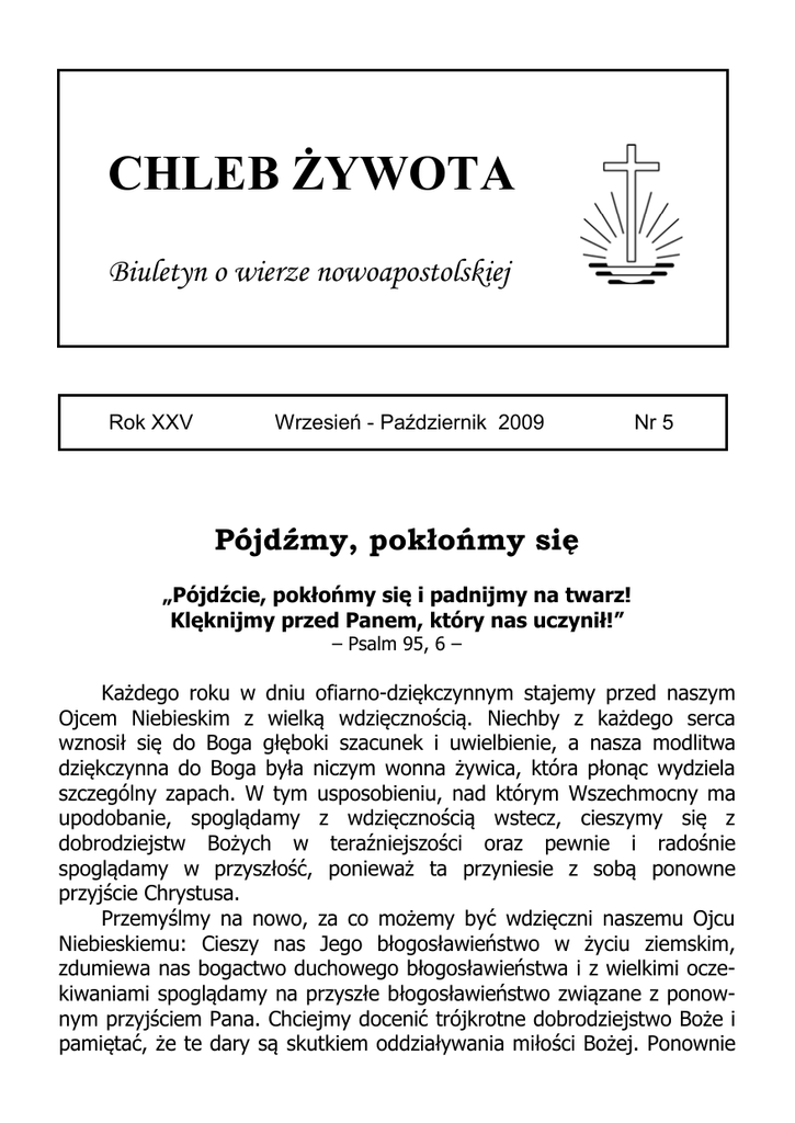 CHLEB ŻYWOTA Biuletyn o wierze nowoapostolskiej Rok XXV Wrzesień - Październik 2009 Nr 5 Pójdźmy, pokłońmy się „Pójdźcie, pokłońmy się i padnijmy na twarz! Klęknijmy przed Panem, który nas uczynił!” – Psalm 95, 6 – Każdego roku w dniu ofiarno-dziękczynnym stajemy przed naszym Ojcem Niebieskim z wielką wdzięcznością. Niechby z każdego serca wznosił się do Boga głęboki szacunek i uwielbienie, a nasza modlitwa dziękczynna do Boga była niczym wonna żywica, która płonąc wydziela szczególny zapach. W tym usposobieniu, nad którym Wszechmocny ma upodobanie, spoglądamy z wdzięcznością wstecz, cieszymy się z dobrodziejstw Bożych w teraźniejszości oraz pewnie i radośnie spoglądamy w przyszłość, ponieważ ta przyniesie z sobą ponowne przyjście Chrystusa. Przemyślmy na nowo, za co możemy być wdzięczni naszemu Ojcu Niebieskiemu: Cieszy nas Jego błogosławieństwo w życiu ziemskim, zdumiewa nas bogactwo duchowego błogosławieństwa i z wielkimi oczekiwaniami spoglądamy na przyszłe błogosławieństwo związane z ponownym przyjściem Pana. Chciejmy docenić trójkrotne dobrodziejstwo Boże i pamiętać, że te dary są skutkiem oddziaływania miłości Bożej. Ponownie darował nam Bóg ziemskie błogosławieństwo, nasz chleb powszedni. Ponownie sprawił nam to, czego potrzebowaliśmy do pokonania trudów życia. Mimo to niejedno trzeba było przeżyć: chorobę, cierpienie, ból po stracie ukochanego człowieka, troskę o pracę i chleb. Tu i tam wystąpiły też niepokój, wrogość, czy niesprawiedliwość. Łaska Boża była z nami we wszystkich doświadczeniach. To jest powód do wdzięczności. Błogosławieństwo duchowe stało się naszym działem, a to szczególnie w postaci drogocennego daru stanu dziecka Bożego. Wszechmocny wybrał nas przed założeniem świata. (por. Efezjan 1, 4. 5) Poprzez czynność pieczętowania świętego, wykonaną przez apostoła, otrzymaliśmy Ducha Świętego. Pan zapewnia nam też możność wytrwania i udoskonalenia w wierze. Czy to nie jest powód do wielbienia Pana i dziękowania Jemu? Pan zaopatruje nas w chleb i wino, które możemy spożywać podczas każdej uroczystości świętej wieczerzy. Dziękujmy za to. Ponadto wielkie błogosławieństwo zawarte jest w naszej nadziei na przyszłość. Oczekiwanie na Oblubieńca naszych dusz pozwala nam pozostać spokojnymi i opanowanymi w chwilach niepew-ności obecnego czasu. Zostaje w nas ożywiana nadzieja ujrzenia wreszcie Tego, który miłuje naszą duszę: Jezusa Chrystusa. Dziękujmy też Panu, że nas zachował pod swoją opieką i że możemy być pewni Jego zbawienia. Gdy osiągniemy wieczną społeczność z Trójjedynym Bogiem, to wszelkie trudy i ofiary zostaną sowicie wynagrodzone. Radość i wdzięczność będą wówczas niezmierne. Dlatego też już dzisiaj chciejmy z wdzięcznością stawać przed Nim i Go czcić. Dział duszpasterski dla dzieci Biskupi piszą do dzieci: W ramach cyklu listów biskupich tym razem zapoznamy się z tym, co pisze Biskup Euclides Segura z Dominikany. Być posłusznym Miłe dzieci! Chciałbym opowiedzieć wam o moim przeżyciu, gdy byłem dziewięcioletnim chłopcem. Przyjaciel moich rodziców pewnego dnia wziął mnie na wycieczkę. Bardzo się ucieszyłem z tego zaproszenia. Prawie dwa 2 kilometry szliśmy ścieżką, która nie była zbyt uczęszczana. Rozmawiając z tym mężczyzną, musiałem się bardzo wysilać, żeby dotrzymać mu kroku. Nagle usłyszeliśmy jakiś hałas. Trzech mężczyzn na koniach pędziło prosto na nas. Urządzili sobie wyścigi, a przy tym stracili kontrolę nad końmi. Mój towarzysz, który rozpoznał niebezpieczeństwo krzyknął: „Stój przy mnie!”. Ale gdy konie były już blisko, wtedy ze strachu próbowałem się schronić na skraju drogi, przy czym wbiegłem wprost pod konie. Wokół mnie były same kopyta, a wszystko odbyło się błyskawicznie. Na szczęście nie miałem nic złamanego, ale całe ciało okropnie mnie bolało. Mój towarzysz natychmiast do mnie podbiegł, nachylił się nade mną, żeby sprawdzić, czy jestem ranny. Jemu samemu nic się nie stało. „Przecież cię prosiłem, żebyś stał przy mnie; dlaczego uciekłeś?” – zapytał drżącym głosem. Czułem się winny, ponieważ go nie usłuchałem. Wyrzuty sumienia sprawiły mi wtedy więcej kłopotu niż bóle spowodowane stłuczeniem. Można by powiedzieć, że właściwie nie byłem winny, ponieważ byłem dzieckiem i działałem pod wpływem strachu. Ale przecież także jako dziecko mogłem posłuchać się mojego towarzysza. Opowiedziałem wam tę historię dlatego, bowiem myślę, że możecie się z niej czegoś nauczyć, bez zbierania takich bolesnych doświadczeń. Miłe dzieci, chciałbym skorzystać z okazji i dać wam radę, abyście pozostawały w pobliżu tych ludzi, którzy was kochają, chronią, wami kierują i abyście były im posłuszne. Do nich zaliczam waszych rodziców, nauczycieli szkółki niedzielnej i sług Bożych. Euclides Segura Biskup Euclides Segura wspiera apostoła Johna Fendta z Nowego Jorku w obsłudze duszpasterskiej 26 zborów w Republice Dominikańskiej, 11 zborów w Hondurasie i 6 zborów w Gwatemali. W tym okręgu obsługuje ponad 300 dzieci. Być może wszystko będzie dobrze Na imię mam Lena. W szkole idzie mi nienajlepiej. W ostatnim dyktandzie zrobiłam osiemnaście błędów. „Osiemnaście błędów, Lena…” – powiedziała nauczycielka i dodała – „musisz się bardziej postarać, bo w przeciwnym wypadku nie uzyskasz promocji do następnej klasy”. 3 Bardzo się przestraszyłam. Ja chcę przejść do następnej klasy. Ja nie chcę się znaleźć w innej klasie! Lubię też naszą wychowawczynię. Nadal chcę też siedzieć obok Reginy. „Poproś swoją mamę aby każdego dnia uczyła się z tobą” – powiedziała jeszcze nauczycielka – „a wtedy będzie lepiej”. Moja mama nie może się ze mną uczyć, ponieważ pop