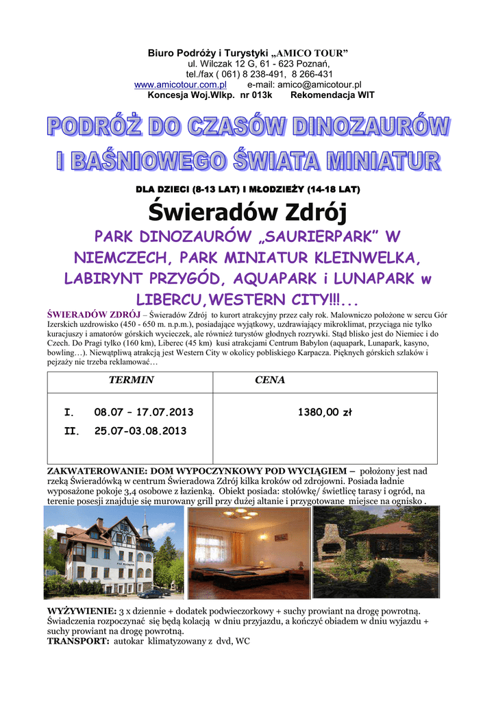 Biuro Podróży i Turystyki „AMICO TOUR” ul. Wilczak 12 G, 61 - 623 Poznań, tel./fax ( 061) 8 238-491, 8 266-431 www.amicotour.com.pl e-mail: [email protected] Koncesja Woj.Wlkp. nr 013k Rekomendacja WIT DLA DZIECI (8(8-13 LAT) I MŁODZIEŻY (14 (1414-18 LAT) Świeradów Zdrój PARK DINOZAURÓW „SAURIERPARK” W NIEMCZECH, PARK MINIATUR KLEINWELKA, LABIRYNT PRZYGÓD, AQUAPARK i LUNAPARK w LIBERCU,WESTERN CITY!!!... ŚWIERADÓW ZDRÓJ – Świeradów Zdrój to kurort atrakcyjny przez cały rok. Malowniczo położone w sercu Gór Izerskich uzdrowisko (450 - 650 m. n.p.m.), posiadające wyjątkowy, uzdrawiający mikroklimat, przyciąga nie tylko kuracjuszy i amatorów górskich wycieczek, ale również turystów głodnych rozrywki. Stąd blisko jest do Niemiec i do Czech. Do Pragi tylko (160 km), Liberec (45 km) kusi atrakcjami Centrum Babylon (aquapark, Lunapark, kasyno, bowling…). Niewątpliwą atrakcją jest Western City w okolicy pobliskiego Karpacza. Pięknych górskich szlaków i pejzaży nie trzeba reklamować… TERMIN I. 08.07 – 17.07.2013 II. 25.07-03.08.2013 CENA 1380,00 zł ZAKWATEROWANIE: DOM WYPOCZYNKOWY POD WYCIĄGIEM – położony jest nad rzeką Świeradówką w centrum Świeradowa Zdrój kilka kroków od zdrojowni. Posiada ładnie wyposażone pokoje 3,4 osobowe z łazienką. Obiekt posiada: stołówkę/ świetlicę tarasy i ogród, na terenie posesji znajduje się murowany grill przy dużej altanie i przygotowane miejsce na ognisko . WYŻYWIENIE: 3 x dziennie + dodatek podwieczorkowy + suchy prowiant na drogę powrotną. Świadczenia rozpoczynać się będą kolacją w dniu przyjazdu, a kończyć obiadem w dniu wyjazdu + suchy prowiant na drogę powrotną. TRANSPORT: autokar klimatyzowany z dvd, WC PROGRAM: WYCIECZKA AUTOKAROWA: PARK DINOZAURÓW „ SAURIERPARK” w Bautzen w Niemczech, Park Miniatur, Labirynt Kleinwelka Wstępując do Parku „Saurierpark” wchodzimy do świata, który istniał przed milionami lat, kiedy lądy, morza i przestworza opanowane były przez dinozaury. Spojrzymy to w oczy naturalnej wielkości łagodnym roślinożercom i potężnym drapieżnikom. W parku znajduje się ponad 200 dinozaurów, a wśród nich słynny tyranozaur rex. Do dyspozycji dzieci jest ogromnych rozmiarów zjeżdżalnia i zamek z lin do wspinaczek. Najmłodsi mogą także pobawić się w archeologów i odkopać ciekawe znaleziska na stanowiskach archeologicznych. Jest też planetarny plac zabaw, ścianka wspinaczkowa. Ponadto znajdziemy tu wystawę o podwodnym świece dinozaurów. PARK MINIATUR KLEINWELKA Park leśny w którym na najmłodszych gości czekają wspaniałe gry i zabawy. W parku znajduje się ponad 600 figur, które możemy oglądać w rozmaitych sceneriach. Zobaczymy najmniejszą pisankę na świecie, albo wypróbujemy maszynę śmiechu. Poznamy takie atrakcje jak wodna droga rzeżb, tor z przeszkodami dla jajek lub zabawne ściany, przy których można zrobić pamiątkowe zdjęcia. Nie zabraknie możliwości do wspólnych zabaw: poszukiwania złota, olimpiada prehistoryczna, armatki wodne i wiele innych. LABIRYNT KLEINWELKA W labiryncie wszyscy będziemy zmierzać w kierunku środka, gdzie otrzymamy pieczątkę potwierdzającą dotarcie do celu. Po zakończeniu zabawy można jeszcze udać się na długi podwyższony pomost i obserwować innych zagubionych z góry. Labirynt zagadek daje nam możliwość przetestowania swojej wiedzy. WYCIECZKA AUTOKAROWA: Aquaparku i Lunaparku „Babylon” w Libercu: całodniowa wycieczka do centrum rozrywki Babylon i pobyt w AQUAPARKU: Kryty tematyczny raj wodny czynny przez cały rok. Temperatura wody w basenach do 30°C. Na terenie Aquaparku są: baseny, w tym basen temperaturze 30°C, który zapewnia doskonały relaks; 4 zjeżdżalnie; zjeżdżalnia o długości 107 m; unikalny adrenalinowy space-bowl dla odważnych; rwąca rzeka, romantyczne jaskinie wodne z rzecznymi prądami i jeziorkami, unikalne akwaria morskie z fauną morską, jacuzzi, strefa relaksacyjna, bary z przekąskami, w dni słoneczne udostępniony jest rozległy taras do opalania z widokiem na górę Jested i Liberec. Pobyt w LUNAPARKU: Zadaszony ośrodek w stylu staroczeskiego kiermaszu z atrakcjami dla dzieci i dorosłych czynny przez cały rok. Znajdziecie tu: autodrom, karuzele, huśtawki, tory przeszkód, trampoliny, ściana wspinaczkowa, rodeo na dzikim byku… WYCIECZKA AUTOKAROWA: po Kotlinie Jeleniogórskiej: Western City – pobyt w miasteczku rodem z Dzikiego Zachodu, Karpacz ze słynną świątynią Wang, Szklarska Poręba – z romantycznym Wodospadem Szklarki, Chata Walońska i Muzeum Minerałów, ZAMEK CZOCHA – gdzie kręcono serial „Tajemnica Twierdzy Szyfrów” na podstawie powieści B. Wołoszańskiego (z zewnątrz). GRILL – PARTY, DYSKOTEKI SPACERY m.in. do Schroniska na Stogu Izerskim Pobyt w Parku Zdrojowym KONKURSY I RYWALIZACJA: przeciąganie liny, wyścigi w workach, podchody, konkurs plastyczny. OPIEKA: doświadczona kadra pedagogiczna, miejscowe służby medyczne. UBEZPIECZENIE: NNW i KL (Czechy i Niemcy). ZBIÓRKA: w pierwszym dniu turnusu o godz. 8.30 przy ul. Słowiańskiej 78 w Poznaniu Klub Sportowy Posnania. Wyjazd o godz. 9.00. Trasa przejazdu bez dopłat: Poznań, Kościan, Leszno, Rawicz. POWRÓT: w ostatnim dniu turnusu na miejsce wyjazdu ok. 19.00-20.00 UWAGA!! Wszyscy uczestnicy zobowiązani są posiadać: OBOWIĄZKOWO 20 euro ( na realizację programu, bilety wstępu do Parków i Labiryntu na terenie Niemiec)– kwota zbierana w pierwszym dniu przez kierownika. Paszport lub dowód tymczasowy, Legitymację szkolną, bidon lub butelkę na napój podczas wycieczek, mały plecak lub torbę na wycieczki, kurtkę przeciwdeszczową, wygodne obuwie, czapkę lub chustkę na głowę, krem z wysokim filtrem, strój kąpielowy, klapki, kieszonkowe na własne wydatki.