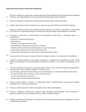 Regulamin Społecznego Gimnazjum Hispaniola Wszyscy członkowie społeczności szkolnej mają obowiązek respektować Konstytucję Rzeczypospolitej 1.1 Szkolnej oraz podporządkowywać się uchwałom konstytucyjnych władz szkolnych. 1.2 Wszyscy członkowie społeczności szkolnej mają obowiązek dbać o dobre imię szkoły. 1.3 Każdy członek społeczności szkolnej może w sprawach spornych odwołać się do Sądu Szkolnego. Wszyscy członkowie społeczności szkolnej powinni odnosić się do siebie z szacunkiem i życzliwością 2.1 oraz okazywać wzajemną tolerancję; na co dzień powinni przestrzegać zasad dobrego wychowania. 2.2 2.4 2.5 3.1 Uczniowie i nauczyciele są zobowiązani do przestrzegania zasad kultury i dyscypliny pracy, a w szczególności: - obecności na zajęciach lekcyjnych, - punktualności, - rzetelności w przygotowaniu do zajęć, - maksymalnego wykorzystania czasu pracy na lekcji, - unikania zachowań, które przeszkadzają innym w pracy na lekcjach, - terminowego oddawania prac domowych (uczniowie), - terminowego sprawdzania prac domowych i klasowych (nauczyciele). Nauczyciele są zobowiązani w miarę możliwości pomagać uczniom w rozwiązywaniu ich problemów. Uczniowie mogą formułować ocenę pracy nauczycieli i przedstawiać ją Dyrektorowi szkoły. Rady Szkół są zobowiązane do przeprowadzenia anonimowych ankiet w tej sprawie przynajmniej raz do roku. Wszyscy członkowie społeczności szkolnej powinni starać się, aby szkoła była miejscem bezpiecznym i aby panowało w niej wzajemne zaufanie. W związku z tym: - nie stwarzają zagrożenia bezpieczeństwa przez nieprzemyślane czy nieodpowiedzialne zachowania, - nie dopuszczają do aktów przemocy, bójek, agresji słownej, - nie używają wulgarnego słownictwa, - unikają sytuacji umożliwiających kradzieże. 3.2 Wszyscy powinni dbać o czystość i o wyposażenie szkoły. Niedopuszczalne jest niszczenie sprzętu, brudzenie ścian, zaśmiecanie podłogi itp. 3.3 Wszyscy rzetelnie powinni wykonywać podjęte wobec szkoły zobowiązania. 3.4 Wszyscy członkowie społeczności szkolnej mają obowiązek przestrzegania reguł korzystania z pracowni przedmiotowych, sali gimnastycznej, siłowni i boiska szkolnego. 4.1 Rodzice (opiekunowie) mają prawo otrzymywać od nauczycieli pełną informację o postępach w nauce i o problemach ich dziecka. 4.2 Rodzice (opiekunowie) powinni: - uczestniczyć w zebraniach organizowanych przez szkołę, - współpracować ze szkołą w przypadku trudności wychowawczych z ich dzieckiem, - usprawiedliwiać na piśmie lub osobiście każdą nieobecność swego dziecka na zajęciach obowiązkowych, - uczestniczyć w różnych formach w życiu szkoły. Rodzice (opiekunowie) na podstawie wniosku na piśmie mogą uzyskać od wychowawcy zgodę na 4.3 nieobecność dziecka na zajęciach z przyczyn innych niż choroba - na czas nie dłuższy niż 7 dni. Dłuższa nieobecność na zajęciach z przyczyn innych niż choroba powinna być uzgodniona z Dyrektorem szkoły. 4.4 Usprawiedliwienie nieobecności ucznia na zajęciach może w uzasadnionych przypadkach zostać przyjęte przez wychowawcę nie od rodziców, ale od samego ucznia. 5.1 Zajęcia w szkole rozpoczynają się o godz. 8.30. Zajęcia dodatkowe mogą rozpoczynać się od godz. 7.30. 5.2 Lekcje trwają 40 minut. Przerwy między lekcjami trwają nie krócej niż 10 min.; przerwa obiadowa trwa 20 minut. 5.3 W uzasadnionych przypadkach jedynie Dyrektor może zarządzić zmianę tego porządku. 6.1 Praca klasowa to sprawdzian obejmujący materiał z co najmniej dwóch tygodni nauki, trwający od 40 do 120 minut jednego dnia, chyba, że nauczyciel z uczniami uzgodnią inaczej. Prace klasowe nie mogą się odbywać częściej niż trzy razy w tygodniu i powinny być zapowiadane z co najmniej z tygodniowym wyprzedzeniem. Nauczyciel gimnazjum ma obowiązek wpisania pracy 6.2 klasowej do dziennika i na tablicy w pokoju nauczycielskim najpóźniej w dniu ogłoszenia. Nie dotyczy to prac poprawkowych oraz prac klasowych przełożonych na życzenie większości uczniów. 6.3 Jednego dnia może odbyć się tylko jedna praca klasowa. 6.4 Kartkówka to sprawdzian odbywający się na początku lub końcu danej lekcji, trwający nie dłużej niż 20 minut, obejmujący materiał z nie więcej niż 2 ostatnich lekcji. 6.4.1 Długość i trudność zadań na kartkówce musi być możliwa do wykonania przez ucznia w czasie jej trwania, czyli nie więcej niż 20 minut. 6.5 W ostatnim tygodniu przed radą klasyfikacyjną nie mogą odbywać się prace klasowe. 7.1 Szkoła zapewnia podstawową opiekę medyczną (stała obecność pielęgniarki, dyżury lekarza, apteczka z lekami pierwszej pomocy, izolatka). 7.2 Szkoła zapewnia uczniom zbiorowe ubezpieczenia od następstw nieszczęśliwych wypadków oraz ubezpiecza nauczycieli od odpowiedzialności cywilnej w związku z wykonywaniem zawodu. 8.1 Uczniów gimnazjum obowiązuje całkowity zakaz: - palenia papierosów, - picia alkoholu i przebywania pod jego wpływem. 8.2 Pozostałych członków społeczności szkolnej powyższe zakazy obowiązują na terenie szkoły oraz podczas imprez i wycieczek szkolnych. 8.3 Wszystkich członków społeczności szkolnej obowiązuje kategoryczny zakaz używania, posiadania i rozprowadzania narkotyków bądź jakichkolwiek środków odurzających. 8.4 Każdy z członków społeczności szkolnej ma moralny obowiązek nieczynienia tajemnicy z posiadanych informacji dotyczących złamania powyższych zakazów. 9.1 Za nieprzestrzeganie niniejszego Regulaminu grożą uczniom następujące kary: 9.1.1 Rozmowa ostrzegawcza z Dyrektorem. 9.1.2 Rozmowa wychowawcy lub Dyrektora z rodzicami ucznia. 9.1.3 Zakaz uczestniczenia w wycieczkach i imprezach szkolnych. 9.1.4 Nagana z wpisaniem do akt. 9.1.5 Okresowe pozbawienie praw obywatelskich Rzeczypospolitej Szkolnej 9.1.6 Skreślenie ucznia z listy uczniów zgodnie z zapisami Statutu Szkoły 9.2 O zastosowaniu kary de