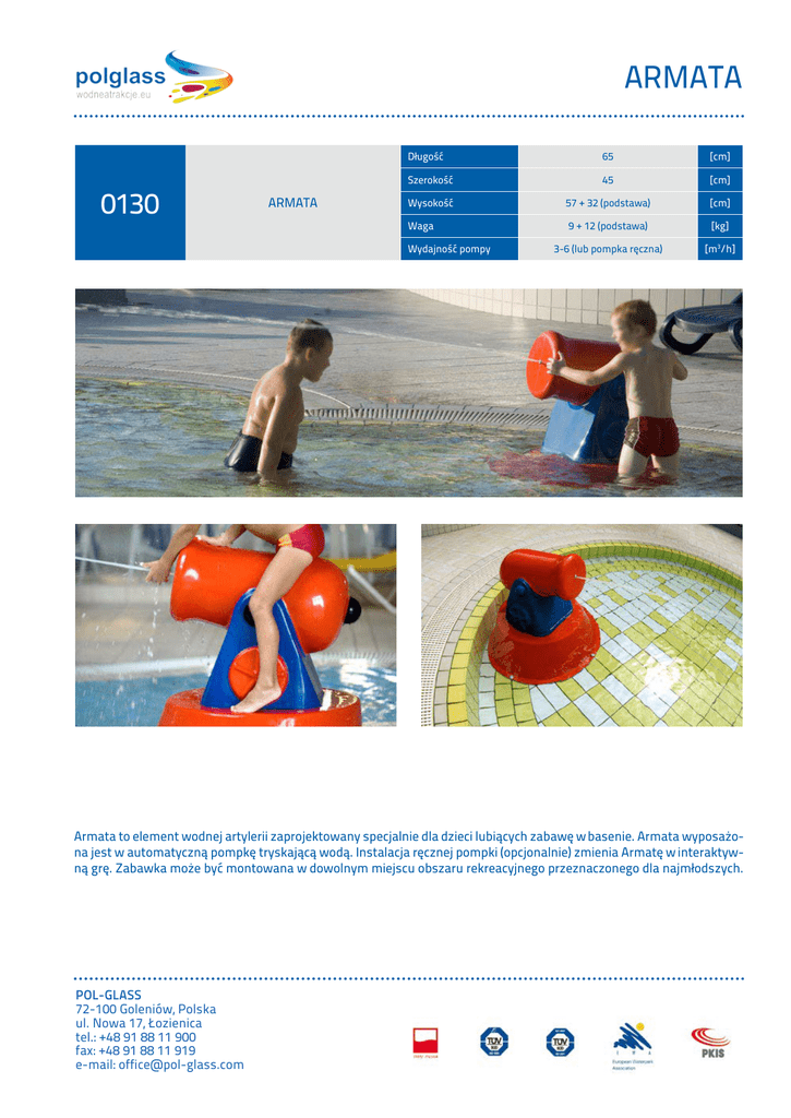 ARMATA 0130 ARMATA Długość 65 [cm] Szerokość 45 [cm] Wysokość 57 + 32 (podstawa) [cm] Waga 9 + 12 (podstawa) [kg] 3-6 (lub pompka ręczna) [m3/h] Wydajność pompy Armata to element wodnej artylerii zaprojektowany specjalnie dla dzieci lubiących zabawę w basenie. Armata wyposażona jest w automatyczną pompkę tryskającą wodą. Instalacja ręcznej pompki (opcjonalnie) zmienia Armatę w interaktywną grę. Zabawka może być montowana w dowolnym miejscu obszaru rekreacyjnego przeznaczonego dla najmłodszych. POL-GLASS POL-GLASS 72-003 k. Szczecina 72-100Dobra Goleniów, Polska Wołczkowo, ul.Łozienica Lipowa 124 ul. Nowa 17, tel.: +48 91 424 40 54 tel.:+48 +489191487 8881 1154, 900 fax:+48 +489191311 8836 1139919 fax: e-mail:[email protected] [email protected] e-mail:
