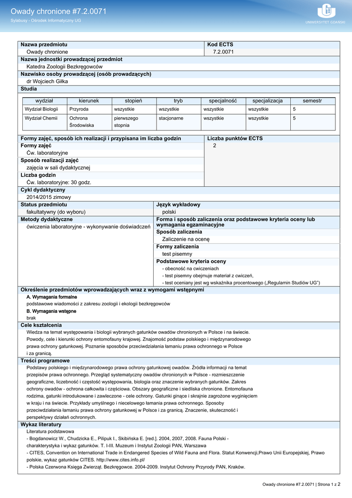 Owady chronione #7.2.0071 Sylabusy - Ośrodek Informatyczny UG Nazwa przedmiotu Owady chronione Nazwa jednostki prowadzącej przedmiot Katedra Zoologii Bezkręgowców Nazwisko osoby prowadzącej (osób prowadzących) dr Wojciech Giłka Studia wydział kierunek Kod ECTS 7.2.0071 stopień tryb specjalność specjalizacja semestr Wydział Biologii Przyroda wszystkie wszystkie wszystkie wszystkie 5 Wydział Chemii Ochrona Środowiska pierwszego stopnia stacjonarne wszystkie wszystkie 5 Formy zajęć, sposób ich realizacji i przypisana im liczba godzin Liczba punktów ECTS Formy zajęć 2 Ćw. laboratoryjne Sposób realizacji zajęć zajęcia w sali dydaktycznej Liczba godzin Ćw. laboratoryjne: 30 godz. Cykl dydaktyczny 2014/2015 zimowy Status przedmiotu Język wykładowy fakultatywny (do wyboru) polski Metody dydaktyczne Forma i sposób zaliczenia oraz podstawowe kryteria oceny lub ćwiczenia laboratoryjne - wykonywanie doświadczeń wymagania egzaminacyjne Sposób zaliczenia Zaliczenie na ocenę Formy zaliczenia test pisemny Podstawowe kryteria oceny - obecność na cwiczeniach - test pisemny obejmuje materiał z cwiczeń, - test oceniany jest wg wskaźnika procentowego („Regulamin Studiów UG”) Określenie przedmiotów wprowadzających wraz z wymogami wstępnymi A. Wymagania formalne podstawowe wiadomości z zakresu zoologii i ekologii bezkręgowców B. Wymagania wstępne brak Cele kształcenia Wiedza na temat występowania i biologii wybranych gatunków owadów chronionych w Polsce i na świecie. Powody, cele i kierunki ochrony entomofauny krajowej. Znajomość podstaw polskiego i międzynarodowego prawa ochrony gatunkowej. Poznanie sposobów przeciwdziałania łamaniu prawa ochronnego w Polsce i za granicą. Treści programowe Podstawy polskiego i międzynarodowego prawa ochrony gatunkowej owadów. Źródła informacji na temat przepisów prawa ochronnego. Przegląd systematyczny owadów chronionych w Polsce - rozmieszczenie geograficzne, liczebność i częstość występowania, biologia oraz znaczenie wybranych gatunków. Zakres ochrony owadów - ochrona całkowita i częściowa. Obszary geograficzne i siedliska chronione. Entomofauna rodzima, gatunki introdukowane i zawleczone - cele ochrony. Gatunki ginące i skrajnie zagrożone wyginięciem w kraju i na świecie. Przykłady umyślnego i niecelowego łamania prawa ochronnego. Sposoby przeciwdziałania łamaniu prawa ochrony gatunkowej w Polsce i za granicą. Znaczenie, skuteczność i perspektywy działań ochronnych. Wykaz literatury Literatura podstawowa - Bogdanowicz W., Chudzicka E., Pilipuk I., Skibińska E. [red.]. 2004, 2007, 2008. Fauna Polski charakterystyka i wykaz gatunków. T. I-III. Muzeum i Instytut Zoologii PAN, Warszawa - CITES, Convention on International Trade in Endangered Species of Wild Fauna and Flora. Statut Konwencji,Prawo Unii Europejskiej, Prawo polskie, wykaz gatunków CITES. http://www.cites.info.pl/ - Polska Czerwona Księga Zwierząt. Bezkręgowce. 2004-2009. Instytut Ochrony Przyrody PAN, Kraków. Owady chronione #7.2.0071 | Strona 1 z 2 Owady chronione #7.2.0071 Sylabusy - Ośrodek Informatyczny UG http://www.iop.krakow.pl/pckz/ - Rozporządzenie Ministra Środowiska z dnia 12 października 2011 r. w sprawie gatunków dziko występujących zwierząt objętych ochroną. Dz.U. 2011 nr 237 poz. 1419 Literatura uzupełniająca - Fauna Europaea Service, Fauna Europaea version 1.3. Internetowa baza danych. http://www.faunaeur.org Efekty uczenia się K_W03charakteryzuje związki i zależności pomiędzy różnymi dyscyplinami nauk przyrodniczych i ścisłych, wykorzystuje wiedzę z zakresu matematyki, fizyki, chemii i biologii w opisie podstawowych pojęć, koncepcji oraz zasad w ochronie środowiska; K_W06wyjaśnia przebieg naturalnych oraz wywołanych antropopresją fizycznych, chemicznych oraz biologicznych procesów i zjawisk zachodzących w przyrodzie na różnych poziomach organizacji materii; K_W09wyjaśnia mechanizmy powstawania gospodarczej i konsumpcyjnej presji na środowisko oraz rozpoznaje możliwości jej ograniczania z wykorzystaniem najnowszej wiedzy i osiągnięć nauki; K_W11opisuje podstawowe metody, techniki i narzędzia pozwalające na racjonalne wykorzystywanie, kształtowanie i odtwarzanie zasobów naturalnych; Wiedza charakteryzuje związki i zależności pomiędzy występowaniem różnych gatunków owadów a warunkami środowiskowymi oraz zasady ochrony owadów; wyjaśnia przebieg naturalnych oraz wywołanych antropopresją biologicznych procesów i zjawisk zachodzących w obrębie fauny, zwłaszcza tych dotyczących entomofauny; wyjaśnia mechanizmy powstawania gospodarczej i konsumpcyjnej presji na owady oraz rozpoznaje możliwości jej ograniczania z wykorzystaniem najnowszej wiedzy i osiągnięć nauki; opisuje podstawowe metody, techniki i narzędzia pozwalające na racjonalne wykorzystywanie, kształtowanie i odtwarzanie zasobów naturalnych w dziedzinie entomofauny; definiuje podstawowe regulacje prawne i instrumenty stosowania prawa w ochronie środowiska dotyczące ochrony owadów Polski i świata; Umiejętności ocenia funkcjonowanie naturalnych i zmienionych przez człowieka systemów przyrodniczych, w których żyją owady oraz określa wpływ antropopresji na zmiany w entomofaunie; K_W13definiuje podstawowe regulacje prawne i posługuje się terminologią z zakresu ochrony środowiska oraz nomenklaturą instrumenty stosowania prawa w ochronie środowiska; związaną z zoologią, a w szczególności z owadami; K_U03ocenia funkcjonowanie naturalnych i zmienionych przez człowieka systemów przyrodniczych oraz określa Kompetencje społeczne (postawy) identyfikuje poziom swojej wiedzy i umiejętności z zakresu ochrony emtomofauny wpływ antropopresji na określone procesy zachodzące w oraz potrzebę ciagłego dokształcania się zawodowego, aktualizowania wiedzy o środowisku naturalnym; środowisku i jego ochronie oraz rozwoju osobistego; K_U06posługuje się termin