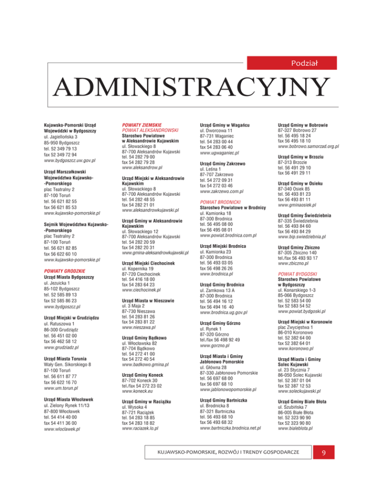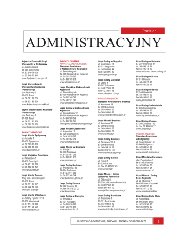 Podział ADMINISTRACYJNY Kujawsko-Pomorski Urząd Wojewódzki w Bydgoszczy ul. Jagiellońska 3 85-950 Bydgoszcz tel. 52 349 79 13 fax 52 349 72 94 www.bydgoszcz.uw.gov.pl Urząd Marszałkowski Województwa Kujawsko-Pomorskiego plac Teatralny 2 87-100 Toruń tel. 56 621 82 55 fax 56 621 85 53 www.kujawsko-pomorskie.pl Sejmik Województwa Kujawsko-Pomorskiego plac Teatralny 2 87-100 Toruń tel. 56 621 82 85 fax 56 622 60 10 www.kujawsko-pomorskie.pl POWIATY GRODZKIE Urząd Miasta Bydgoszczy ul. Jezuicka 1 85-102 Bydgoszcz tel. 52 585 89 13 fax 52 585 86 23 www.bydgoszcz.pl Urząd Miejski w Grudziądzu ul. Ratuszowa 1 86-300 Grudziądz tel. 56 451 02 00 fax 56 462 58 12 www.grudziadz.pl Urząd Miasta Torunia Wały Gen. Sikorskiego 8 87-100 Toruń tel. 56 611 87 77 fax 56 622 16 70 www.um.torun.pl Urząd Miasta Włocławek ul. Zielony Rynek 11/13 87-800 Włocławek tel. 54 414 40 00 fax 54 411 36 00 www.wloclawek.pl POWIATY ZIEMSKIE Powiat aleksandrowski Starostwo Powiatowe w Aleksandrowie Kujawskim ul. Słowackiego 8 87-700 Aleksandrów Kujawski tel. 54 282 79 00 fax 54 282 79 28 www.aleksandrow.pl Urząd Miejski w Aleksandrowie Kujawskim ul. Słowackiego 8 87-700 Aleksandrów Kujawski tel. 54 282 48 55 fax 54 282 21 01 www.aleksandrowkujawski.pl Urząd Gminy w Aleksandrowie Kujawskim ul. Słowackiego 12 87-700 Aleksandrów Kujawski tel. 54 282 20 59 fax 54 282 20 31 www.gmina-aleksandrowkujawski.pl Urząd Miejski Ciechocinek ul. Kopernika 19 87-720 Ciechocinek tel. 54 416 18 00 fax 54 283 64 23 www.ciechocinek.pl Urząd Miasta w Nieszawie ul. 3 Maja 2 87-730 Nieszawa tel. 54 283 81 26 fax 54 283 81 22 www.nieszawa.pl Urząd Gminy Bądkowo ul. Włocławska 82 87-704 Bądkowo tel. 54 272 41 00 fax 54 272 40 54 www.badkowo.gmina.pl Urząd Gminy w Wagańcu ul. Dworcowa 11 87-731 Waganiec tel. 54 283 00 44 fax 54 283 06 40 www.ugwaganiec.pl Urząd Gminy Zakrzewo ul. Leśna 1 87-707 Zakrzewo tel. 54 272 09 31 fax 54 272 03 46 www.zakrzewo.com.pl Powiat brodnicki Starostwo Powiatowe w Brodnicy ul. Kamionka 18 87-300 Brodnica tel. 56 495 08 00 fax 56 495 08 01 www.powiat.brodnica.com.pl Urząd Miejski Brodnica ul. Kamionka 23 87-300 Brodnica tel. 56 493 03 05 fax 56 498 26 26 www.brodnica.pl Urząd Gminy Brodnica ul. Zamkowa 13 A 87-300 Brodnica tel. 56 494 16 12 fax 56 494 16 40 www.brodnica.ug.gov.pl Urząd Gminy Górzno ul. Rynek 1 87-320 Górzno tel./fax 56 498 92 49 www.gorzno.pl Urząd Gminy w Bobrowie 87-327 Bobrowo 27 tel. 56 495 18 24 fax 56 495 18 10 www.bobrowo.samorzad.org.pl Urząd Gminy w Brzoziu 87-313 Brzozie tel. 56 491 29 10 fax 56 491 29 11 Urząd Gminy w Osieku 87-340 Osiek 85 tel. 56 493 81 23 fax 56 493 81 11 www.gminaosiek.pl Urząd Gminy Świedziebnia 87-335 Świedziebnia tel. 56 493 84 60 fax 56 493 84 29 www.bip.swiedziebnia.pl Urząd Gminy Zbiczno 87-305 Zbiczno 140 tel./fax 56 493 93 17 www.zbiczno.pl Powiat bydgoski Starostwo Powiatowe w Bydgoszczy ul. Konarskiego 1-3 85-066 Bydgoszcz tel. 52 583 54 00 fax 52 583 54 52 www.powiat.bydgoski.pl Urząd Miejski w Koronowie plac Zwycięstwa 1 86-010 Koronowo tel. 52 382 64 00 fax 52 382 64 01 www.koronowo.pl Urząd Gminy Koneck 87-702 Koneck 30 tel./fax 54 272 23 02 www.koneck.eu Urząd Miasta i Gminy Jabłonowo Pomorskie ul. Główna 28 87-330 Jabłonowo Pomorskie tel. 56 697 68 00 fax 56 697 68 10 www.jablonowopomorskie.pl Urząd Miasta i Gminy Solec Kujawski ul. 23 Stycznia 7 86-050 Solec Kujawski tel. 52 387 01 04 fax 52 387 12 53 www.soleckujawski.pl Urząd Gminy w Raciążku ul. Wysoka 4 87-721 Raciążek tel. 54 283 18 85 fax 54 283 18 82 www.raciazek.lo.pl Urząd Gminy Bartniczka ul. Brodnicka 8 87-321 Bartniczka tel. 56 493 68 10 fax 56 493 68 32 www.bartniczka.brodnica.net.pl Urząd Gminy Białe Błota ul. Szubińska 7 86-005 Białe Błota tel. 52 323 90 90 fax 52 323 90 80 www.bialeblota.pl KUJAWSKO-POMORSKIE, ROZWÓJ I TRENDY GOSPODARCZE