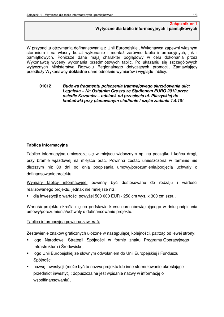 Załącznik 1 – Wytyczne dla tablic informacyjnych i pamiątkowych 1/3 Załącznik nr 1 Wytyczne dla tablic informacyjnych i pamiątkowych W przypadku otrzymania dofinansowania z Unii Europejskiej, Wykonawca zapewni własnym staraniem i na własny koszt wykonanie i montaż zarówno tablic informacyjnych, jak i pamiątkowych. Poniższe dane mają charakter poglądowy w celu dokonania przez Wykonawcę wyceny wykonania przedmiotowych tablic. Po ukazaniu się szczegółowych wytycznych Ministerstwa Rozwoju Regionalnego dotyczących promocji, Zamawiający przedłoży Wykonawcy dokładne dane odnośnie wymiarów i wyglądu tablicy. 01012 Budowa fragmentu połączenia tramwajowego skrzyżowania ulic: Legnicka – Na Ostatnim Groszu ze Stadionem EURO 2012 przez osiedle Kozanów – odcinek od przecięcia ul. Pilczyckiej do krańcówki przy planowanym stadionie / część zadania 1.4.10/ Tablica informacyjna Tablicę informacyjną umieszcza się w miejscu widocznym np. na początku i końcu drogi, przy bramie wjazdowej na miejsce prac. Powinna zostać umieszczona w terminie nie dłuższym niż 30 dni od dnia podpisania umowy/porozumienia/podjęcia uchwały o dofinansowanie projektu. Wymiary tablicy informacyjnej powinny być dostosowane do rodzaju i wartości realizowanego projektu, jednak nie mniejsze niż: dla inwestycji o wartości powyżej 500 000 EUR - 250 cm wys. x 300 cm szer., Wartość projektu określa się na podstawie kursu euro obowiązującego w dniu podpisania umowy/porozumienia/uchwały o dofinansowanie projektu. Tablica informacyjna powinna zawierać: Zestawienie znaków graficznych ułożone w następującej kolejności, patrząc od lewej strony: logo Narodowej Strategii Spójności w formie znaku Programu Operacyjnego Infrastruktura i Środowisko, logo Unii Europejskiej ze słownym odwołaniem do Unii Europejskiej i Funduszu Spójności nazwę inwestycji (może być to nazwa projektu lub inne sformułowanie określające przedmiot inwestycji; dopuszczalne jest wpisanie nazwy w informację o współfinansowaniu), Załącznik 1 – Wytyczne dla tablic informacyjnych i pamiątkowych 2/3 informację o całkowitej wartości projektu oraz (opcjonalnie) o wartości dotacji ze środków Unii Europejskiej, nazwę Beneficjenta, informację o współfinansowaniu projektu z Funduszu Spójności w postaci: „Projekt współfinansowany przez Unię Europejską z Funduszu Spójności na lata 20072013” Układ tablicy informacyjnej musi zawierać wszystkie wymagane elementy. Co najmniej 25% powierzchni tablicy powinna zajmować informacja o wkładzie środków unijnych (znaki graficzne i informacja o współfinansowaniu). Hasło promocyjne oraz informacja o współfinansowaniu może być umieszczona na tablicy w dowolnym miejscu, jednak poza ciągiem znaków graficznych. Napisy na tablicach informacyjnych powinny zostać wykonane w sposób czytelny i trwały. Kolor tablic jest dowolny, ale powinien kontrastować z napisami w celu zachowania czytelności. Nie można stosować agresywnych kolorów tła dla tablic. Tablica pamiątkowa Tablica pamiątkowa ma na celu pozostawienie trwałej informacji o wsparciu inwestycji ze środków Funduszu Spójności. Tablica pamiątkowa powinna być widoczna i dużych rozmiarów oraz zostać umieszczona na stałe nie później niż sześć miesięcy od zakończenia realizacji projektu. Wymiary tablicy pamiątkowej nie powinny być mniejsze niż 70 cm wys. x 100 cm szer. Zaleca się wykonanie tablic pamiątkowych z materiałów trwałych takich jak np. mosiądz, marmur lub granit. Tablicę pamiątkową umieszcza się po rzeczowym zakończeniu realizacji projektu, który dotyczył zakupu środków trwałych lub finansowania robót infrastrukturalnych lub budowlanych. Tablica pamiątkowa powinna zawierać: Zestawienie znaków graficznych ułożone w następującej kolejności, patrząc od lewej strony: logo Narodowej Strategii Spójności w formie znaku Programu Operacyjnego Infrastruktura i Środowisko, logo Unii Europejskiej ze słownym odwołaniem do Unii Europejskiej i Funduszu Spójności nazwę inwestycji (może być to nazwa projektu lub inne sformułowanie określające przedmiot inwestycji; dopuszczalne jest wpisanie nazwy w informację o współfinansowaniu), informację o całkowitej wartości projektu oraz (opcjonalnie) o wartości dotacji ze środków Unii Europejskiej, nazwę Beneficjenta, informację o współfinansowaniu projektu z Funduszu Spójności w postaci: „Projekt współfinansowany przez Unię Europejską z Funduszu Spójności na lata 20072013” Załącznik 1 – Wytyczne dla tablic informacyjnych i pamiątkowych 3/3 Układ tablicy pamiątkowej musi zawierać wszystkie wymagane elementy. Informacja o wkładzie środków unijnych (znaki graficzne i informacja o współfinansowaniu) powinna zajmować co najmniej 25% powierzchni tablicy. Hasło promocyjne oraz treść informacji o współfinansowaniu mogą być umieszczone w dowolnym miejscu tablicy, jednak poza ciągiem znaków graficznych. Napisy na tablicach pamiątkowych powinny zostać wykonane w sposób czytelny i trwały. Montaż tablic pamiątkowych ma się odbyć przed odbiorem końcowym zadań.