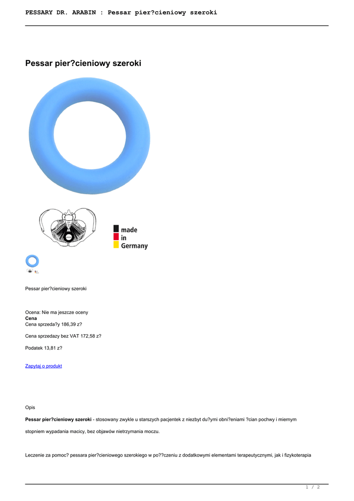 PESSARY DR. ARABIN : Pessar pier?cieniowy szeroki Pessar pier?cieniowy szeroki Pessar pier?cieniowy szeroki Ocena: Nie ma jeszcze oceny Cena Cena sprzeda?y 186,39 z? Cena sprzedazy bez VAT 172,58 z? Podatek 13,81 z? Zapytaj o produkt Opis Pessar pier?cieniowy szeroki - stosowany zwykle u starszych pacjentek z niezbyt du?ymi obni?eniami ?cian pochwy i miernym stopniem wypadania macicy, bez objawów nietrzymania moczu. Leczenie za pomoc? pessara pier?cieniowego szerokiego w po??czeniu z dodatkowymi elementami terapeutycznymi, jak i fizykoterapia 1 / 2 PESSARY DR. ARABIN : Pessar pier?cieniowy szeroki i estrogenoterapia, pozwala na wyleczenie lub co najmniej zmniejszenie dolegliwo?ci zwi?zanych z wypadaniem pochwy i/lub macicy. Rozmiary: 50 mm 55 mm 60 mm 65 mm 70 mm 75 mm 80 mm 85 mm Opinie Nikt jeszcze nie recenzowa? tego produktu. 2 / 2 Powered by TCPDF (www.tcpdf.org)