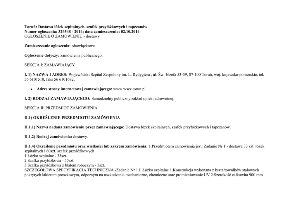 Toruń: Dostawa łóżek szpitalnych, szafek przyłóżkowych i tapczanów Numer ogłoszenia: 326548 - 2014; data zamieszczenia: 02.10.2014 OGŁOSZENIE O ZAMÓWIENIU - dostawy Zamieszczanie ogłoszenia: obowiązkowe. Ogłoszenie dotyczy: zamówienia publicznego. SEKCJA I: ZAMAWIAJĄCY I. 1) NAZWA I ADRES: Wojewódzki Szpital Zespolony im. L. Rydygiera , ul. Św. Józefa 53-59, 87-100 Toruń, woj. kujawsko-pomorskie, tel. 56 6101510, faks 56 6101682. Adres strony internetowej zamawiającego: www.wszz.torun.pl I. 2) RODZAJ ZAMAWIAJĄCEGO: Samodzielny publiczny zakład opieki zdrowotnej. SEKCJA II: PRZEDMIOT ZAMÓWIENIA II.1) OKREŚLENIE PRZEDMIOTU ZAMÓWIENIA II.1.1) Nazwa nadana zamówieniu przez zamawiającego: Dostawa łóżek szpitalnych, szafek przyłóżkowych i tapczanów. II.1.2) Rodzaj zamówienia: dostawy. II.1.4) Określenie przedmiotu oraz wielkości lub zakresu zamówienia: 1.Przedmiotem zamówienia jest: Zadanie Nr 1 - dostawa 33 szt. łóżek szpitalnych i 60szt. szafek przyłóżkowych 1.Łóżko szpitalne - 33szt. 2.Szafka przyłóżkowa - 55szt. 3.Szafka przyłóżkowa z blatem roboczym - 5szt. SZCZEGÓŁOWA SPECYFIKACJA TECHNICZNA -Zadanie Nr 1 I. Łóżko szpitalne 1.Konstrukcja wykonana z kształtowników stalowych pokrytych lakierem proszkowym, odpornym na uszkodzenia mechaniczne, chemiczne oraz promieniowanie UV 2.Szerokość całkowita 900 mm (+/- 50 mm) 3.Długość całkowita: 2100 mm (+/- 50 mm) 4.Wysokość leża od podłogi: 600 mm (+/- 50 mm) 5.Leże łóżka 2 segmentowe 6.Segmenty leża wypełnione siatką metalową pokrytą lakierem proszkowym. 7.Ręczna regulacja oparcia pleców w zakresie 00 - 750 (+/-50) 8.Łóżko wyposażone w 4 koła o średnicy min. 125 mm z czego 2 mają posiadać blokadę jazdy i obrotu 9.Lakierowane szczyty łóżka 10.Wyjmowane wypełnienie szczytów łóżka wykonane z płyty meblowej z możliwością wyboru koloru wypełnień 11.Łóżko zaopatrzone w krążki odbojowe zabezpieczające przed obijaniem ścian 12.Wyposażenie dodatkowe: - Materac dopasowany do ramy leża z pianki poliuretanowej w pokrowcu paroprzepuszczalnym, nieprzenikliwy dla cieczy, z możliwością wymiany pokrowca, pokrowiec z zamkiem błyskawicznym obszyty w literę L z okapnikiem, grubość minimum 10 cm, odporny na środki dezynfekujące - 33 szt. -Barierki lakierowane proszkowe, wykonane z 3 profili stalowych owalnych o wysokości min. 40 mm i grubości min. 20mm składane wzdłuż ramy leża za pomocą jednego przycisku, montowane pod ramą w specjalnych tulejach wyposażona w mechanizm zatrzaskowy z możliwością demontażu bez użycia narzędzi - 33 kpl. II. Szafki przyłóżkowe 1.Szkielet szafki wykonany z profili stalowych oraz blachy ocynkowanej, pokrytej lakierem proszkowym, odpornym na uszkodzenia mechaniczne, chemiczne i promieniowanie UV 2.Szerokość szafki: 380 mm (± 20 mm) Wysokość szafki: 800 mm (± 20 mm) Głębokość szafki: 410 mm (± 20 mm) 3.Blat szafki wykonany z płyty laminowanej, zakończony tworzywową oblamówką, odporny na wilgoć, dezynfekcję oraz promieniowanie UV. 4.Drzwi szafki oraz front szuflady pokryte lakierem proszkowym odpornym na uszkodzenia mechaniczne, chemiczne i promieniowanie UV 5.Szuflada wysuwana na prowadnicach rolkowych z wkładem tworzywowym odejmowanym. Szuflada zabezpieczona przed wysunięciem 6.Pomiędzy szufladą a kontenerem półka na prasę o wysokości min. 120 mm, dostęp do półki z czterech stron. 7.Szafka wyposażona w półkę do odkładania obuwia lub pojemników urologicznych wykonana z siatki stalowej (średnica min. 5 mm) pokrytej lakierem proszkowym. Półka wyprofilowana zabezpieczająca przed wypadnięciem przedmiotów. 8.Szafka wyposażona w haczyki do zawieszania ręczników 9.Szafka z możliwością zamocowania w przyszłości blatu bocznego, bez konieczności przeróbek technologicznych. 10.Koła jezdne podwójne w tym min. 2 z blokadą, z elastycznym, niebrudzącym podłóg bieżnikiem 11.Szafka przystosowana do mycia i dezynfekcji 12.Konstrukcja szafki umożliwiająca zamiany stron montażu blatu bocznego oraz otwierania drzwiczek (ustawienie prawo i lewostronne) 13.Kolor frontów oraz blaty z możliwością wyboru kolorów z min. 6 szt. oraz konstrukcja z możliwością wyboru z min. dwóch kolorów w tym szary. III. Szafka przyłóżkowa z blatem bocznym 1.Szkielet szafki wykonany z profili stalowych oraz blachy ocynkowanej, pokrytej lakierem proszkowym, odpornym na uszkodzenia mechaniczne, chemiczne i promieniowanie UV 2.Szerokość szafki: 380 mm (± 20 mm) Wysokość szafki: 800 mm (± 20 mm) Głębokość szafki: 410 mm (± 20 mm) Szerokość wraz z blatem bocznym: 600 mm (± 20 mm) 3.Wymiary półki bocznej: 500 x 350 mm (± 20mm) 4.Blat boczny regulowany bezstopniowo w zakresie: 800 -1200 mm (± 20 mm) 5.Blat boczny z możliwością regulacji kąta o 30stopni lub 60stopni 6.Blat szafki oraz blat półki bocznej wykonany z płyty laminowanej, zakończony tworzywową oblamówką, odporny na wilgoć, dezynfekcję oraz promieniowanie UV. Blat półki bocznej wyposażony w tworzywowe ranty zabezpieczające min. dwie krawędzie przed zsuwaniem się przedmiotów. 7.Drzwi szafki oraz front szuflady pokryte lakierem proszkowym odpornym na uszkodzenia mechaniczne, chemiczne i promieniowanie UV 8.Szuflada wysuwana na prowadnicach rolkowych z wkładem tworzywowymodejmowanym. Szuflada zabezpieczona przed wysunięciem 9.Pomiędzy szufladą a kontenerem półka na prasę o wysokości min. 120 mm, dostęp do półki z czterech stron. 10.Szafka wyposażona w półkę do odkładania obuwia lub pojemników urologicznych wykonana z siatki stalowej (średnica min. 5 mm) pokrytej lakierem proszkowym. Półka wyprofilowana zabezpieczająca przed wypadnięciem przedmiotów. 11.Szafka wyposażona w haczyki do zawieszania ręczników 12.Koła jezdne podwójne w tym min. 2 z blokadą, z elastycznym, niebrudzącym podłóg bieżnikiem 13.Dodatkowe piąte koło z blokadą zwiększające stabiln