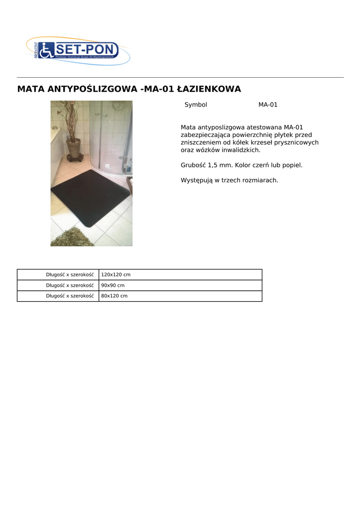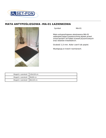 MATA ANTYPOŚLIZGOWA -MA-01 ŁAZIENKOWA Symbol MA-01 Mata antyposlizgowa atestowana MA-01 zabezpieczająca powierzchnię płytek przed zniszczeniem od kółek krzeseł prysznicowych oraz wózków inwalidzkich. Grubość 1,5 mm. Kolor czerń lub popiel. Występują w trzech rozmiarach. Powered by TCPDF (www.tcpdf.org) Długość x szerokość 120x120 cm Długość x szerokość 90x90 cm Długość x szerokość 80x120 cm