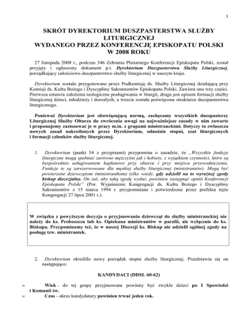 1 SKRÓT DYREKTORIUM DUSZPASTERSTWA SŁUŻBY LITURGICZNEJ WYDANEGO PRZEZ KONFERENCJĘ EPISKOPATU POLSKI W 2008 ROKU 27 listopada 2008 r., podczas 346 Zebrania Plenarnego Konferencji Episkopatu Polski, został przyjęty i ogłoszony dokument p.t. Dyrektorium Duszpasterstwa Służby Liturgicznej, porządkujący całościowo duszpasterstwo służby liturgicznej w naszym kraju. Dyrektorium zostało przygotowane przez Podkomisję ds. Służby Liturgicznej działającą przy Komisji ds. Kultu Bożego i Dyscypliny Sakramentów Episkopatu Polski. Zawiera ono trzy części. Pierwsza omawia założenia teologiczne posługiwania w liturgii, druga jest opisem formacji służby liturgicznej dzieci, młodzieży i dorosłych, a trzecia została poświęcona strukturze duszpasterstwa liturgicznego. Ponieważ Dyrektorium jest obowiązującą normą, zachęcamy wszystkich duszpasterzy Liturgicznej Służby Ołtarza do zwrócenia uwagi na najważniejsze zasady w nim zawarte i proponujemy zastosować je w pracy m.in. z grupami ministranckimi. Dotyczy to zwłaszcza nowych zasad nakreślonych przez Dyrektorium, odnośnie stopni, szat liturgicznych i formacji członków służby liturgicznej. 1. Dyrektorium (punkt 54 z przypisami) przypomina o zasadzie, że „Wszystkie funkcje liturgiczne mogą spełniać zarówno mężczyźni jak i kobiety, z wyjątkiem czynności, które są bezpośrednio usługiwaniem kapłanowi przy ołtarzu i przy miejscu przewodniczenia. Funkcje te są zarezerwowane dla męskiej służby liturgicznej (ministrantów). Mogą być powierzone dziewczętom (ministrantkom) tylko wtedy, gdy udzielił na to wyraźnej zgody biskup diecezjalny. On zaś, aby taką zgodę wydać, powinien zasięgnąć opinii Konferencji Episkopatu Polski” (Por. Wyjaśnienie Kongregacji ds. Kultu Bożego i Dyscypliny Sakramentów z 15 marca 1994 r. przypomniane i potwierdzone przez prefekta tejże Kongregacji 27 lipca 2001 r.). W związku z powyższym decyzja o przyjmowaniu dziewcząt do służby ministranckiej nie należy do ks. Proboszcza lub ks. Opiekuna ministrantów w parafii, ale wyłącznie do ks. Biskupa. Przypominamy też, że w naszej Diecezji ks. Biskup nie udzielił ogólnej zgody na posługę tzw. ministrantek. 2. Dyrektorium określiło nowy porządek stopni służby liturgicznej. Przedstawia się on następująco: KANDYDACI (DDSL 60-62) • • Wiek - do tej grupy przyjmowane powinny być zwykle dzieci po I Spowiedzi i Komunii św. Czas - okres kandydatury powinien trwać jeden rok. 2 • • • Formacja - kandydaci uczą się podstawowych funkcji liturgicznych, poznają lepiej kościół jako miejsce ich posługi, są też wprowadzani w wymagania duchowe, jakie powinni spełniać, aby móc służyć w czasie Mszy świętej i innych celebracjach liturgicznych. Strój - do czasu przyjęcia ich do grona służby liturgicznej kandydaci nie spełniają jeszcze funkcji liturgicznych (nie służą). Jeśli jednak prowadzący formację uznają za słuszne, mogą te osoby dopuścić do pełnienia niektórych funkcji w czasie Mszy świętej w ciągu tygodnia. Dyrektorium nie wspomina nic na temat strojów dla kandydatów. Z tekstu można jednak wywnioskować, że jeśli nie pełnią żadnych funkcji liturgicznych nie powinni nosić komży. Błogosławieństwo - po przeżyciu okresu kandydatury odbywa się przyjęcie do grona służby liturgicznej przez specjalne błogosławieństwo (Księga Błogosławieństw Służby Liturgicznej). Odtąd kandydaci przechodzą do grupy ministrantów młodszych i otrzymują właściwy im strój liturgiczny (sutanka (rewerenda), kołnierz, komża), znak (Księga Błogosławieństw Służby Liturgicznej str. 99) i modlitwę służby liturgicznej. MINISTRANCI MŁODSI (DDSL 63-71) • • • • • Wiek – szkoła podstawowa. Czas – 3 lata (klasa IV, V, VI). Formacja - młodsi ministranci poznają coraz lepiej czynności związane z darami ofiarnymi i naczyniami liturgicznymi, z niesieniem świec i krzyża, wody i kadzidła oraz mitry i pastorału. Poszczególne lata formacji młodszych ministrantów mają następującą tematykę: - Zgromadzenie liturgiczne (rok I), - Procesje liturgiczne (rok II), - Ołtarz i ofiara (rok III). Pod koniec każdego roku zaleca się, by ministranci młodsi przeżyli dzień skupienia, zaś w ciągu trzech lat wzięli przynajmniej raz udział w rekolekcjach przeznaczonych dla nich. Mogą to być rekolekcje Oazy Dzieci Bożych lub inna forma rekolekcji uznana przez duszpasterzy. Strój – Dyrektorium nie wymienia jak powinien wyglądać strojów dla ministrantów młodszych, jednak zachęcamy, by były to: sutanka (rewerenda) i kołnierz w kolorze białym (złotym), czerwonym, zielonym lub fioletowym oraz komża. Błogosławieństwo – po trzyletniej formacji młodszych ministrantów zostaje udzielone błogosławieństwo do wiernego wypełniania zadań w dalszych latach. Promocji można udzielić tym ministrantom, którzy spełniali w ciągu roku wyznaczone im funkcje w Liturgii oraz uczestniczyli w spotkaniach formacyjnych. Przez błogosławieństwo zostają włączeni do grona starszych ministrantów i otrzymują właściwy im strój liturgiczny (alba). MINISTRANCI STARSI (DDSL 72-85) • • • Wiek – gimnazjum. Czas – 3 lata (klasa I, II, III). Formacja – ministranci starsi są wprowadzani nie tylko w nowe funkcje liturgiczne, takie jak ministrant księgi, czy lektor, lecz także w nowy zakres zadań apostolskich, szczególnie w gronie swoich rówieśników. Poszczególne lata formacji starszych ministrantów mają następującą tematykę: - Księgi liturgiczne (rok I) - Rok liturgiczny (rok II) - Funkcje liturgiczne (rok III). Program formacyjny w III roku łączy się z dokonaniem ważnego wyboru – dotyczy on przyszłej funkcji liturgicznej: - ministranci pragnący w przyszłości być lektorami i czytać słowo Boże włączają się w kurs lektorski. 3 - ministranci pragnący w przyszłości być akolitami i posługiwać pr