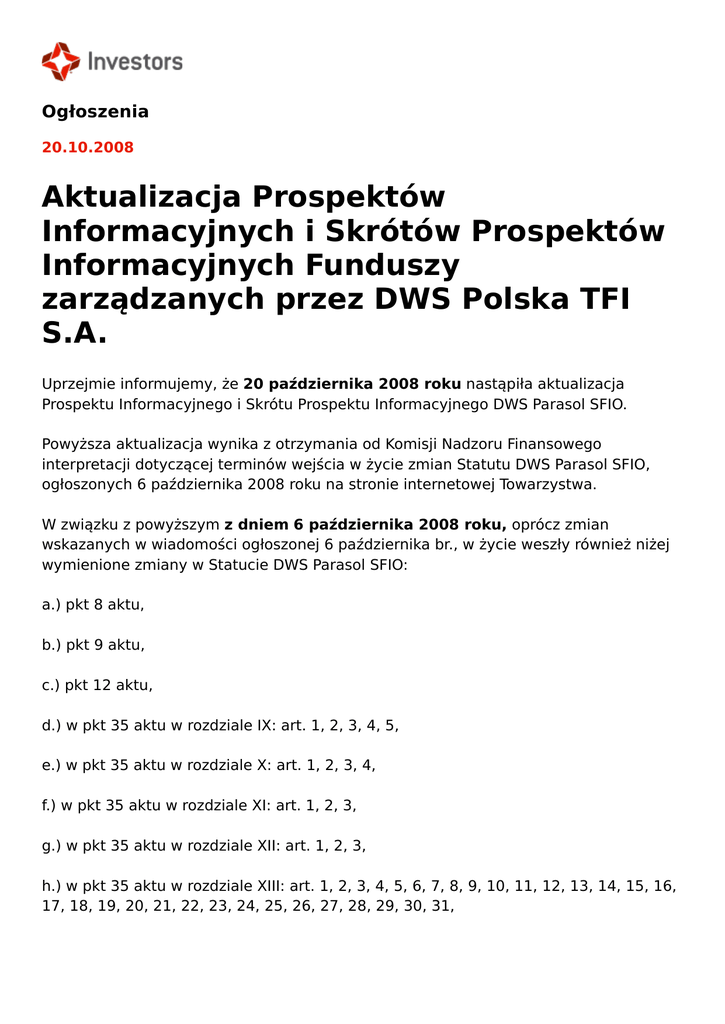 Ogłoszenia 20.10.2008 Aktualizacja Prospektów Informacyjnych i Skrótów Prospektów Informacyjnych Funduszy zarządzanych przez DWS Polska TFI S.A. Uprzejmie informujemy, że 20 października 2008 roku nastąpiła aktualizacja Prospektu Informacyjnego i Skrótu Prospektu Informacyjnego DWS Parasol SFIO. Powyższa aktualizacja wynika z otrzymania od Komisji Nadzoru Finansowego interpretacji dotyczącej terminów wejścia w życie zmian Statutu DWS Parasol SFIO, ogłoszonych 6 października 2008 roku na stronie internetowej Towarzystwa. W związku z powyższym z dniem 6 października 2008 roku, oprócz zmian wskazanych w wiadomości ogłoszonej 6 października br., w życie weszły również niżej wymienione zmiany w Statucie DWS Parasol SFIO: a.) pkt 8 aktu, b.) pkt 9 aktu, c.) pkt 12 aktu, d.) w pkt 35 aktu w rozdziale IX: art. 1, 2, 3, 4, 5, e.) w pkt 35 aktu w rozdziale X: art. 1, 2, 3, 4, f.) w pkt 35 aktu w rozdziale XI: art. 1, 2, 3, g.) w pkt 35 aktu w rozdziale XII: art. 1, 2, 3, h.) w pkt 35 aktu w rozdziale XIII: art. 1, 2, 3, 4, 5, 6, 7, 8, 9, 10, 11, 12, 13, 14, 15, 16, 17, 18, 19, 20, 21, 22, 23, 24, 25, 26, 27, 28, 29, 30, 31, i.) w pkt 35 aktu w rozdziale XIV: art. 1, 3, 4, 5, 6, 7, 8, 9, 10, 11, 12, 13, 14, 15, 16, 17, 18, 19, 20, 21, 22, 23, 24, 25, 26, 27, 28, 29, 30, j.) w pkt 35 aktu w rozdziale XV: art. 1, 2, 3, 4, 5, 6, k.) w pkt 35 aktu w rozdziale XVI: art. 1, 2, 3, 4, 5, 6, 7, 8, 9, 10, 11, 12, 13, 14, 15, 16, 17, 18, 19, 20, 21, 22, l.) w pkt 35 aktu w rozdziale XVII: art. 1, 2, 3, 4, 5, 6, 7, 8, 9, 10, 11, 12, 13, 14, 15, 16, 17, 18, 19, 20, 21, 22, 23, 24, 25. Jednocześnie uprzejmie informujemy, że 20 października 2008 roku nastąpiła również aktualizacja wszystkich Prospektów Informacyjnych funduszy DWS oraz Skrótu Prospektu Informacyjnego DWS Polska FIO Zabezpieczenia Emerytalnego. Aktualizacja dotyczy: w Prospektach Informacyjnych: • usunięcia DWS Polska FIO Konwergencji z Tabeli Opłat Manipulacyjnych, Rozdział VI.3., • zmiany statusu prawnego Dystrybutora Goldenegg Sp. z o.o na Goldenegg S.A. (oprócz DWS Polska FIO Bezpiecznego Wzrostu Plus), • korekty benchmarku DWS Polska FIO Zabezpieczenia Emerytalnego, Rozdział III.16.3.1. (tylko w DWS Polska FIO Zabezpieczenia Emerytalnego). w Skrócie Prospektu Informacyjnego: • korekty benchmarku DWS Polska FIO Zabezpieczenia Emerytalnego, Rozdział I.9.3.1.