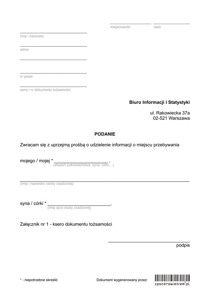 ___________________ _________________ miejscowość data _______________________________ imię i nazwisko _______________________________ adres _______________________________ _______________________________ nr pesel _______________________________ seria i nr dokumentu tożsamości Biuro Informacji i Statystyki ul. Rakowiecka 37a 02-521 Warszawa PODANIE Zwracam się z uprzejmą prośbą o udzielenie informacji o miejscu przebywania mojego / mojej * _____________________ , (stopień pokrewieństwa: syna, córki…) ________________________________________________________________________ (imię i nazwisko osoby osadzonej) syna / córki * ___________________________. (imię ojca osoby osadzonej) Załącznik nr 1 - ksero dokumentu tożsamości ________________________________ podpis * - niepotrzebne skreślić Dokument wygenerowany przez: