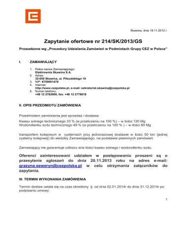 Skawina, dnia 18.11.2012 r. Zapytanie ofertowe nr 214/SK/2013/GS Prowadzone wg „Procedury Udzielania Zamówień w Podmiotach Grupy CEZ w Polsce” I. ZAMAWIAJĄCY 1. Pełna nazwa Zamawiającego: Elektrownia Skawina S.A. 2. Adres: 32-050 Skawina, ul. Piłsudskiego 10 3. NIP: 6750001478 4. Internet: http://www.cezpolska.pl, e-mail: [email protected] 5. Numer telefonu: +48 12 2762000, fax: +48 12 2778618 II. OPIS PRZEDMIOTU ZAMÓWIENIA Przedmiotem zamówienia jest sprzedaż i dostawa: Kwasu solnego technicznego 33 % (w przeliczeniu na 100 %) – w ilości 120 Mg Wodorotlenku sodu technicznego 49 % (w przeliczeniu na 100 % ) – w ilości 80 Mg transportem kolejowym w cysternach przy jednorazowej dostawie w ilości 50 ton (jednej cysterny kolejowej) do siedziby Zamawiającego, na podstawie pisemnych zamówień. Zamawiający nie gwarantuje odbioru w/w ilości kwasu solnego i wodorotlenku sodu. Oferenci zainteresowani udziałem w postępowaniu proszeni są o przesyłanie zgłoszeń do dnia 20.11.2013 roku na adres e-mail: [email protected] w celu otrzymania załączników do zapytania. III. TERMIN WYKONANIA ZAMÓWIENIA Termin dostaw ustala się na czas określony tj. od dnia 02.01.2014r do dnia 31.12.2014r po podpisaniu umowy. 1 IV. SPOSÓB PRZYGOTOWANIA OFERTY 1. Każda z ofert powinna składać się z dwóch oddzielnych części: technicznej i handlowej, w oddzielnych zapieczętowanych ofertach z właściwym dopiskiem na kopertach: „Część techniczna oferty – nr postępowania”, „Część handlowa oferty – nr postępowania”. Koperty z częściami techniczną i handlową powinny być właściwie opisane. 2. Część techniczna oferty powinna zawierać następujące informacje: a. Dokumenty wymienione w pkt. nr V niniejszego zapytania. 3. Część handlowa oferty powinna zawierać następujące informacje: a. Dokumenty wymienione w pkt. nr VI niniejszego zapytania. 4. Każdy oferent może złożyć tylko jedną ofertę. 5. Sposób przygotowania oferty: a. Oferta powinna być napisana czytelnie w języku polskim, b. Wszystkie strony oferty wraz z załącznikami powinny być podpisane przez osobę (osoby) uprawnioną do występowania w imieniu oferenta, c. Wszystkie strony oferty wraz z załącznikami powinny być spięte w sposób zapobiegający jej dekompletacji, d. Wszelkie poprawki lub zmiany w tekście oferty muszą być parafowane i datowane własnoręcznie przez osobę podpisującą ofertę lub przez osobę upoważnioną. 6. Opakowanie i oznakowanie ofert: Ofertę należy złożyć w zamkniętym opakowaniu w miejscu wskazanym w pkt. VIII. 7. Zamawiający nie bierze odpowiedzialności za skutki braku zachowania powyższych warunków przez Oferenta. Nie spełnienie wymagań j/w spowoduje odrzucenie oferty. 8. Oferent poniesie wszelkie koszty związane z przygotowaniem i złożeniem oferty. 9. Płyta CD (opisana: nazwa firmy + dopisek: „Zapytanie – „214/SK/2012/GS” ze wszystkimi dokumentami i załącznikami wymienionymi w pkt V i VI załączona w części technicznej oferty. Dokumenty składane są w wersji papierowej w oryginale lub kserokopii poświadczonej za zgodność z oryginałem. Wszelkie dokumenty wymienione w powyższych punktach oprócz tego, że powinny zostać złożone w wersji papierowej, muszą zostać przesłane również w wersji elektronicznej na nośniku CD. V. INFORMACJE O DOKUMENTACH, JAKIE MAJĄ DOSTARCZYĆ DOSTAWCY W CZĘŚCI TECHNICZNEJ OFERTY: 2 1. Koncesję, zezwolenia lub licencję. 2. Dokumenty stwierdzające, że osoby, które będą wykonywać zamówienie, posiadają wymagane uprawnienia, jeżeli ustawy nakładają obowiązek posiadania takich uprawnień 3. Listę referencyjną klientów ze szczególnym uwzględnieniem podobnych dostaw. 4. Specyfikację, Kartę Charakterystyki Produktu oraz przykładowe świadectwo jakości. 5. Czas realizacji dostawy liczony od dnia otrzymania zamówienia. 6. Czas trwania i warunki gwarancji. VI. INFORMACJE O DOKUMENTACH, JAKIE MAJĄ DOSTARCZYĆ DOSTAWCY W CZĘŚCI HANDLOWEJ OFERTY: 1. Aktualny odpis z właściwego rejestru albo aktualne zaświadczenie o wpisie do ewidencji działalności gospodarczej, wystawiony nie wcześniej niż 6 miesięcy przed upływem terminu składania ofert. 2. Pełnomocnictwo, jeżeli ofertę podpisują inne osoby niż uprawnione do zaciągania zobowiązań w imieniu oferenta, 3. Oświadczenie oferenta, że nie podlega wykluczeniu z następujących powodów stanowiące załącznik nr 1 do niniejszego zapytania: nie wywiązanie się wobec Zamawiającego z należytą starannością choćby z jednej umowy, nie jest objęty postępowaniem układowym bądź innymi postępowaniami związanymi z restrukturyzacja zadłużenia, wszczęcie postępowania upadłościowego, ogłoszenie upadłości lub będących w trakcie prowadzenia likwidacji. 4. Oświadczenie Oferenta, że akceptuje postanowienia warunków Umowy stanowiącej załącznik nr 2 do niniejszego zapytania. 5. Dane kontaktowe osoby upoważnionej ze strony Oferenta do kontaktu z Zamawiającym. 6. Cenę netto w PLN i warunki płatności na warunkach DDP Skawina wg Incoterms 2010. 7. Akceptacja terminu płatności wynoszącego 30 dni liczonych od daty otrzymania faktury przez Zamawiającego. 8. Wypełniony załącznik nr 3 „ First Assesment.xls” do niniejszego zapytania ofertowego. VII. TERMIN DO KTÓREGO DOSTAWCA BĘDZIE ZWIĄZANY ZŁOŻONĄ OFERTĄ: Dostawca będzie związany złożoną ofertą do dnia 31.12.2013r. VIII. MIEJSCE ORAZ TERMIN SKŁADANIA OFERT 1. Oferta powinna być przesłana za pośrednictwem: poczty, kuriera lub też dostarczona osobiście na adres: CEZ Polska sp. z o.o., Centrum Usług Wspólnych, ul. Piłsudskiego 10, 32-050 Skawina, na nazwisko: Grażyna Seweryn, do 27 listopada 2013 roku, do godziny 12.00. 3 2. Oferty złożone po terminie nie będą rozpatrywane. 3. Zamawiający oceni ważność ofert pod względem formalnym oraz przyjętych w zapytaniu kryteriów oceny ofert na posiedzeniu niejawnym. 