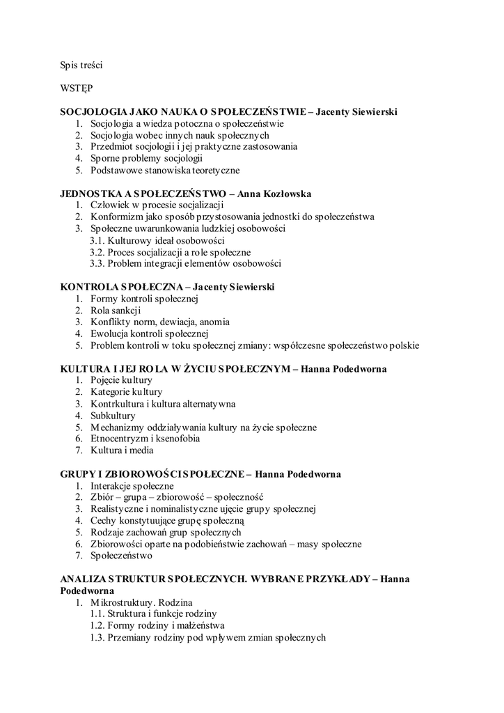 Spis treści WSTĘP SOCJOLOGIA JAKO NAUKA O S POŁECZEŃS TWIE – Jacenty Siewierski 1. Socjologia a wiedza potoczna o społeczeństwie 2. Socjologia wobec innych nauk społecznych 3. Przedmiot socjologii i jej praktyczne zastosowania 4. Sporne problemy socjologii 5. Podstawowe stanowiska teoretyczne JEDNOS TKA A S POŁECZEŃS TWO – Anna Kozłowska 1. Człowiek w procesie socjalizacji 2. Konformizm jako sposób przystosowania jednostki do społeczeństwa 3. Społeczne uwarunkowania ludzkiej osobowości 3.1. Kulturowy ideał osobowości 3.2. Proces socjalizacji a role społeczne 3.3. Problem integracji elementów osobowości KONTROLA S POŁECZNA – Jacenty S iewierski 1. Formy kontroli społecznej 2. Rola sankcji 3. Konflikty norm, dewiacja, anomia 4. Ewolucja kontroli społecznej 5. Problem kontroli w toku społecznej zmiany: współczesne społeczeństwo polskie KULTURA I JEJ RO LA W śYCIU S POŁECZNYM – Hanna Podedworna 1. Pojęcie kultury 2. Kategorie kultury 3. Kontrkultura i kultura alternatywna 4. Subkultury 5. M echanizmy oddziaływania kultury na Ŝycie społeczne 6. Etnocentryzm i ksenofobia 7. Kultura i media GRUPY I ZBIOROWOŚ CI S POŁECZNE – Hanna Podedworna 1. Interakcje społeczne 2. Zbiór – grupa – zbiorowość – społeczność 3. Realistyczne i nominalistyczne ujęcie grupy społecznej 4. Cechy konstytuujące grupę społeczną 5. Rodzaje zachowań grup społecznych 6. Zbiorowości oparte na podobieństwie zachowań – masy społeczne 7. Społeczeństwo ANALIZA S TRUKTUR S POŁECZNYCH. WYBRAN E PRZYKŁADY – Hanna Podedworna 1. M ikrostruktury. Rodzina 1.1. Struktura i funkcje rodziny 1.2. Formy rodziny i małŜeństwa 1.3. Przemiany rodziny pod wpływem zmian społecznych 2. M ezostruktury. Społeczność lokalna MNIEJS ZOŚ Ć ETNICZNA, RAS OWA, NARODOWA W ANALIZACH SOCJOLOGICZNYCH – Jolanta Polakowska-Kujawa 1. Typy mniejszości i ich specyfika 2. Grupa etniczna i rasowa 3. M niejszość narodowa jako kategoria socjologiczna 4. M igracja a struktura etniczno-narodowa 5. Asymilacja i integracja imigrantów NARÓD, NACJONALIZM, S TEREOTYPY NARODOWE – Jolanta PolakowskaKujawa 1. Naród i przesłanki narodowej identyfikacji w refleksji socjologicznej 2. Spory wokół koncepcji narodu w myśli socjologicznej 3. Spory wokół nacjonalizmu 4. Stereotypy narodowe S TRUKTURA S POŁECZN A – Janusz Gardawski 1. M akrostruktury społeczne 2. Teorie klas społecznych Karola M arksa i M axa Webera 2.1. Teoria Karola M arksa 2.2. Teoria M axa Webera 2.3. M arks a Weber 3. Nurt neoweberowski i neomarksizm 3.1. Pierwszy przykład inspiracji weberowskich: uwarstwienie społeczne według kryterium prestiŜu 3.2. Drugi przykład inspiracji weberowskich: system stratyfikacyjny EGP 3.3. Przykład stanowiska neomarksistowskiego: Erik Olin Wright 3.4. Schemat EGP a schemat Erika Olina Wrighta 4. Funkcjonalizm 4.1. Funkcjonalna teoria uwarstwienia K. Davisa i W. M oore’a 5. Klasyfikacje i skale zawodów 6. Teza o zaniku klas 6.1. Neomarksizm i neoweberyzm wobec tezy o zaniku klas 7. Badania struktury klasowej w Polsce 8. Badania struktury społeczno-zawodowej w Polsce 8.1. Hierarchia prestiŜu zawodów 9. Potoczne postrzeganie struktury społecznej PODS TAWOWE S EGMENTY S TRUKTURY S POŁECZN EJ W POLS CE – Juliusz Gardawski, Jolanta Gladys-Jakóbik, Hanna Podedworna 1. Historyczne uwarunkowania zmian w strukturze polskiego społeczeństwa 2. Robotnicy. Kontrowersje teoretyczne a rzeczywistość 2.1. Sytuacja robotników w perspektywie historycznej 2.2. Problemy z definicją robotników 2.3. Generalizacje socjologiczne dotyczące robotników. WaŜniejsze przykłady 2.4. Typologia robotników 3. Przemiany klasy chłopskiej (rolników) 3.1. Kryteria wyróŜniania klasy chłopskiej w strukturze społecznej 3.2. M odernizacja a przemiany klasy chłopskiej 3.3. Sytuacja a perspektywy chłopów (rolników) we współczesnej Polsce 4. Klasa średnia 4.1. Problem proletaryzacji klasy średniej 4.2. Kulturowe aspekty proletaryzacji 4.3. „Fragmentaryzacja” klasy średniej 4.4. Klasy średnie w Polsce KONFLIKT S POŁECZNY – Danuta Izdebska 1. Konflikt społeczny jako proces 1.1. Klasyfikacja konfliktów 1.2. Dynamika konfliktów 2. Psychologiczne aspekty konfliktów 2.1. Specyfika konfliktów destruktywnych 2.2. Zjawisko deprywacji 3. Główne teorie konfliktu 3.1. Teorie konfliktu K. M arksa i G. Simmla 3.2. Teorie R. Dahrendorfa i L. Cosera 4. Konflikty społeczne w Polsce 4.1. Konflikty w Polsce przed zmianą ustrojową ZMIANA S POŁECZNA W PERS PEKTYWIE S OCJOLOGICZN EJ – Jolanta Polakowska-Kujawa 1. Pojęcie i przyczyny zmian społecznych 1.1. Definicja zmiany 1.2. Zmiana społeczna jako przedmiot badań socjologicznych 1.3. Spory o kierunek i znaczenie zmian społecznych 1.4. Perspektywy poznawcze zmian społecznych 1.5. Przyczyny zmian społecznych 2. Zmiana społeczna w róŜnych orientacjach teoretycznych 2.1. Teorie zmiany endogennej 2.2. Teorie zmiany egzogennej MODERNIZACJA – Jacenty S iewierski 1. Zmiana i stabilność 2. Tradycja i nowoczesność 3. M odernizacja w refleksji socjologicznej 4. Problemy modernizacji w społeczeństwie zacofanym 5. M odernizacja w ramach społeczeństwa polskiego RUCHY S POŁECZN E JAKO CZYNNIK ZMIAN Y – Jolanta Polakowska-Kujawa 1. Geneza ruchów społecznych 2. Typy ruchów społecznych 3. Ruchy rewolucyjne 4. Nowe ruchy społeczne MODELE ŁADU S POŁECZN EGO – Leszek Gilejko 1. Cztery funkcje modeli idealnych 2. Typy ładu społecznego 3. M odele ładu a zachowania aktorów społecznych 4. Powstanie i załamanie się ładu monocentrycznego POLITYKA W śYCIU S POŁECZEŃS TW – Ewa Nalewajko 1. Polityka, władza, państwo 2. Typy rządzenia 2.1. Ustroje autorytarne i totalitarne 2.2. Ustroje monokratyczne i polikratyczne 2.3. Ustroje demokratyczne 3. Socjalizacja polityczna, kultura polityczna, komunikowanie polityczne INS TYTUCJE EKONOMICZN E – Leszek Gilejko 1. NajwaŜniejsze instytucje 2. Rynek jako instytucja 