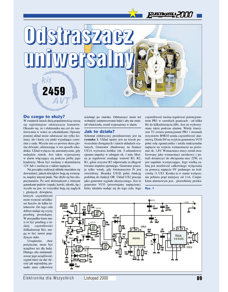 ★ Odstraszacz uniwersalny 2459 Do czego to służy? W ostatnich latach dużą popularnością cieszą się najróżniejsze odstraszacze komarów. Okazało się, że i elektronika ma coś do zao− ferowania w walce ze szkodnikami. Opisany poniżej układ może odstraszać nie tylko ko− mary, ale i krety czy ptaki wyjadające czere− śnie z sadu. Wysyła ono co pewien okres gło− śne dźwięki, odstraszając w ten sposób szko− dnika. Układ wyłącza się automatycznie, gdy nadejdzie zmrok. Jest także wyposażony w alarm włączający się podczas próby jego kradzieży. Może być zasilany z akumulatora 12V lub z zasilacza o takim napięciu. Na początku realizacji układu musiałem się dowiedzieć, jakich dźwięków boją się zwierzę− ta, między innymi ptaki. Nie obyło się bez eks− perymentów. Po serii doświadczeń z różnymi gatunkami ptaków (szpaki, kawki, sikorki, itp.) wyszło na jaw, że wszystkie boją się nagłych i głośnych dźwięków, których częstotliwość może wynosić od kilku− set herców do kilku ki− loherców. Do tego celu dobrze nadaje się czysty przebieg prostokątny. W przypadku kreta mu− si to być przebieg o ni− skiej częstotliwości (kilkadziesiąt Hz), mo− gą to być nawet poje− dyncze stuki. Urządzenie, choć pożyteczne, może być uciążliwe też dla ludzi. Dlatego, aby zminimali− zować jego uciążliwość, sygnał musi się dać sły− szeć jak najrzadziej, po− nadto musi całkowicie Elektronika dla Wszystkich ucichnąć po zmroku. Odstraszacz może też wzbudzić zainteresowanie ludzi i aby nie zmie− nił właściciela, został wyposażony w alarm. Jak to działa? Schemat elektryczny przedstawiony jest na rysunku 1. Układ oparty jest na trzech po− wszechnie dostępnych i tanich układach sca− lonych. Generator zbudowany na bramce US1A wytwarza krótkie (ok. 5−sekundowe) ujemne impulsy w odstępie ok. 1 min. Moż− na je regulować ustalając wartość R3, R2, R1, gdzie rezystor R3 odpowiada za długość trwania impulsu ujemnego. Generator pracu− je tylko wtedy, gdy fototranzystor Ft jest oświetlony. Bramka US1D pełni funkcję podobną do funkcji OR. Układ US2 pracuje jako generator sygnału akustycznego. Jest to generator VCO (przestrajany napięciem), który idealnie nadaje się do tego celu. Jego częstotliwość można regulować potencjome− trem PR1 w szerokich granicach − od kilku Hz do kilkudziesięciu kHz. Jest on wykorzy− stany także podczas alarmu. Wtedy tranzy− stor T2 zwiera potencjometr PR1 i stosunek rezystorów R9R10 ustala częstotliwość alar− mową. Dioda D4 na wyjściu generatora VCO pełni rolę ogranicznika i ustala maksymalne napięcie na wejściu wzmacniacza na pozio− mie ok. 1,8V. Wzmacniacz mocy został zrea− lizowany jako wzmacniacz mostkowy i po− trafi dostarczyć do obciążenia moc 22W, co jest zupełnie wystarczające. Jego wielką za− letą jest możliwość całkowitego wyłączenia za pomocą napięcia 0V podanego na koń− cówkę 11 US3. Kostka ta w stanie wyłącze− nia pobiera prąd mniejszy od 1µA. Czujni− kiem alarmowym jest... przerobiony przeka− Rys. 1 89 źnik. Do jego ruchomego styku została przy− lutowana szpilka z ciężarkiem na końcu. Ta− ki czujnik całkowicie wystarcza do wykrycia nawet małego przyspieszenia. Każdy wstrząs spowoduje chwilowe zwarcie styku przeka− źnika, a potem, podczas alarmu styk ten zo− staje zwarty w normalny sposób, bo na cew− kę przekaźnika zostanie podane napięcie. Czas alarmu wyznacza C2. Generator na bramce US1B generuje przerywany sygnał alarmowy o jednej częstotliwości. To dość istotne, bo właściciel urządzenia łatwiej roz− różni go od zwykłego dźwięku odstraszające− go zwierzęta. Dioda D3 wraz z C6 umożli− wiają uzyskanie sygnału charakterystyczne− go dla syren alarmowych. Montaż i uruchomienie Układ można zmontować na płytce drukowa− nej, pokazanej na rysunku 2. Można go też wykonać na płytce uniwersalnej lub nie mon− tować części alarmowej, pozostawiając tylko odstraszacz, co zresztą niewiele zmniejszy liczbę elementów. Sam montaż nie jest naj− ważniejszy, znacznie bardziej istotne jest za− bezpieczenie układu przed mgłą i deszczem oraz takie umieszczenie akumulatora, cen− tralki i głośnika, by ewentualny złodziej nie mógł od razu wyłączyć alarmu, na przykład wyrywając przewody zasilające. Układ mo− delowy został umieszczony w hermetycznej puszce używanej w natynkowych instala− cjach oświetleniowych. Z puszki wychodzą kable do zasilania i do głośnika. Warto je za− bezpieczyć przed wyrwaniem wiążąc je wo− kół siebie wewnątrz puszki. Trzeba także w obudowie zrobić otworek na fototranzy− stor. Uruchomienie nie powinno sprawić kło− potów. Należy tylko wyregulować czujnik alarmowy wyginając odpowiednio styki. Za− kres zmian dźwięku można zmieniać dowol− nie, dobierając według potrzeb wartości ele− mentów C4, R11, R12. Do układu US3 war− to dodać niewielki radiator – wystarczy nie− wielki, bo przy przebiegu prostokątnym stra− ty będą małe. Gdyby moc wzmacniacza mo− stkowego była za duża, na przykład dla 10− watowej tuby, można wykorzystać jeden ka− nał wzmacniacza TDA1516Q. Do nóżki 9 (albo 5) należy dołączyć dodatnią nóżkę kon− densatora 470...2200µF/16V. Głośnik należy włączyć między ujemną nóżkę tego konden− satora a masę. Piotr Wójtowicz Rys. 2 Schemat montażowy Wykaz elementów Kondensatory C1 . . . . . . . . . . . . . . . . . . . . . . . . . . . . .100µF/16V C2 . . . . . . . . . . . . . . . . . . . . . . . . . . . . . .22µF/16V C3 . . . . . . . . . . . . . . . . . . . . . . . . . . . . . . . . .150nF C4,C5 . . . . . . . . . . . . . . . . . . . . . . . . . . . . . .220nF C6 . . . . . . . . . . . . . . . . . . . . . . . . . . . . . .33µF/16V C7 . . . . . . . . . . . . . . . . . . . . . . . 