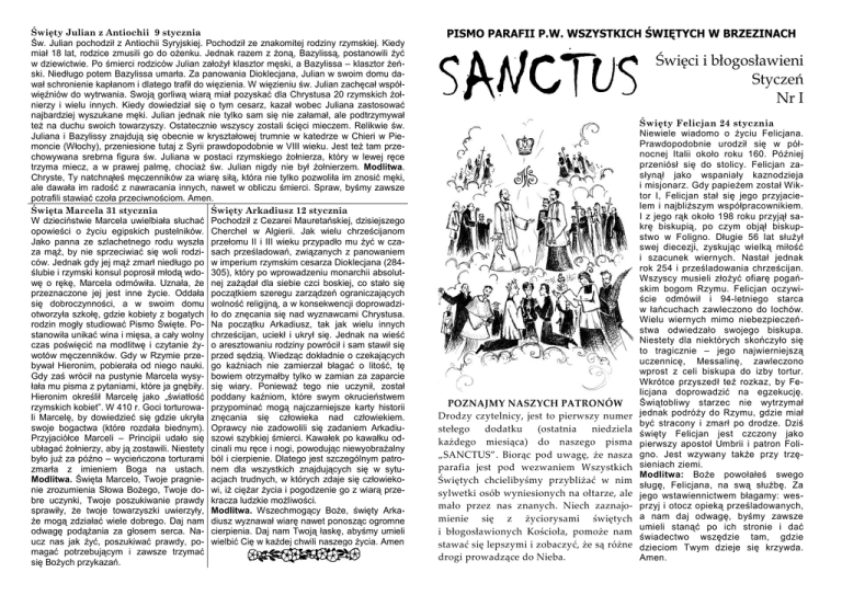 Święty Julian z Antiochii 9 stycznia Św. Julian pochodził z Antiochii Syryjskiej. Pochodził ze znakomitej rodziny rzymskiej. Kiedy miał 18 lat, rodzice zmusili go do ożenku. Jednak razem z żoną, Bazylissą, postanowili żyć w dziewictwie. Po śmierci rodziców Julian założył klasztor męski, a Bazylissa – klasztor żeński. Niedługo potem Bazylissa umarła. Za panowania Dioklecjana, Julian w swoim domu dawał schronienie kapłanom i dlatego trafił do więzienia. W więzieniu św. Julian zachęcał współwięźniów do wytrwania. Swoją gorliwą wiarą miał pozyskać dla Chrystusa 20 rzymskich żołnierzy i wielu innych. Kiedy dowiedział się o tym cesarz, kazał wobec Juliana zastosować najbardziej wyszukane męki. Julian jednak nie tylko sam się nie załamał, ale podtrzymywał też na duchu swoich towarzyszy. Ostatecznie wszyscy zostali ścięci mieczem. Relikwie św. Juliana i Bazylissy znajdują się obecnie w kryształowej trumnie w katedrze w Chieri w Piemoncie (Włochy), przeniesione tutaj z Syrii prawdopodobnie w VIII wieku. Jest też tam przechowywana srebrna figura św. Juliana w postaci rzymskiego żołnierza, który w lewej ręce trzyma miecz, a w prawej palmę, chociaż św. Julian nigdy nie był żołnierzem. Modlitwa. Chryste, Ty natchnąłeś męczenników za wiarę siłą, która nie tylko pozwoliła im znosić męki, ale dawała im radość z nawracania innych, nawet w obliczu śmierci. Spraw, byśmy zawsze potrafili stawiać czoła przeciwnościom. Amen. Święta Marcela 31 stycznia Święty Arkadiusz 12 stycznia W dzieciństwie Marcela uwielbiała słuchać Pochodził z Cezarei Mauretańskiej, dzisiejszego opowieści o życiu egipskich pustelników. Cherchel w Algierii. Jak wielu chrześcijanom Jako panna ze szlachetnego rodu wyszła przełomu II i III wieku przypadło mu żyć w czaza mąż, by nie sprzeciwiać się woli rodzi- sach prześladowań, związanych z panowaniem ców. Jednak gdy jej mąż zmarł niedługo po w imperium rzymskim cesarza Dioklecjana (284ślubie i rzymski konsul poprosił młodą wdo- 305), który po wprowadzeniu monarchii absolutwę o rękę, Marcela odmówiła. Uznała, że nej zażądał dla siebie czci boskiej, co stało się przeznaczone jej jest inne życie. Oddała początkiem szeregu zarządzeń ograniczających się dobroczynności, a w swoim domu wolność religijną, a w konsekwencji doprowadziotworzyła szkołę, gdzie kobiety z bogatych ło do znęcania się nad wyznawcami Chrystusa. rodzin mogły studiować Pismo Święte. Po- Na początku Arkadiusz, tak jak wielu innych stanowiła unikać wina i mięsa, a cały wolny chrześcijan, uciekł i ukrył się. Jednak na wieść czas poświęcić na modlitwę i czytanie ży- o aresztowaniu rodziny powrócił i sam stawił się wotów męczenników. Gdy w Rzymie prze- przed sędzią. Wiedząc dokładnie o czekających bywał Hieronim, pobierała od niego nauki. go kaźniach nie zamierzał błagać o litość, tę Gdy zaś wrócił na pustynie Marcela wysy- bowiem otrzymałby tylko w zamian za zaparcie łała mu pisma z pytaniami, które ja gnębiły. się wiary. Ponieważ tego nie uczynił, został Hieronim określił Marcelę jako „światłość poddany kaźniom, które swym okrucieństwem rzymskich kobiet”. W 410 r. Goci torturowa- przypominać mogą najczarniejsze karty historii li Marcelę, by dowiedzieć się gdzie ukryła znęcania się człowieka nad człowiekiem. swoje bogactwa (które rozdała biednym). Oprawcy nie zadowolili się zadaniem ArkadiuPrzyjaciółce Marceli – Principii udało się szowi szybkiej śmierci. Kawałek po kawałku odubłagać żołnierzy, aby ją zostawili. Niestety cinali mu ręce i nogi, powodując niewyobrażalny było już za późno – wycieńczona torturami ból i cierpienie. Dlatego jest szczególnym patrozmarła z imieniem Boga na ustach. nem dla wszystkich znajdujących się w sytuModlitwa. Święta Marcelo, Twoje pragnie- acjach trudnych, w których zdaje się człowiekonie zrozumienia Słowa Bożego, Twoje do- wi, iż ciężar życia i pogodzenie go z wiarą przebre uczynki, Twoje poszukiwanie prawdy kracza ludzkie możliwości. sprawiły, że twoje towarzyszki uwierzyły, Modlitwa. Wszechmogący Boże, święty Arkaże mogą zdziałać wiele dobrego. Daj nam diusz wyznawał wiarę nawet ponosząc ogromne odwagę podążania za głosem serca. Na- cierpienia. Daj nam Twoją łaskę, abyśmy umieli ucz nas jak żyć, poszukiwać prawdy, po- wielbić Cię w każdej chwili naszego życia. Amen magać potrzebującym i zawsze trzymać się Bożych przykazań. PISMO PARAFII P.W. WSZYSTKICH ŚWIĘTYCH W BRZEZINACH SANC SANCTUS POZNAJMY NASZYCH PATRONÓW Drodzy czytelnicy, jest to pierwszy numer stełego dodatku (ostatnia niedziela każdego miesiąca) do naszego pisma „SANCTUS”. Biorąc pod uwagę, że nasza parafia jest pod wezwaniem Wszystkich Świętych chcielibyśmy przybliżać w nim sylwetki osób wyniesionych na ołtarze, ale mało przez nas znanych. Niech zaznajomienie się z życiorysami świętych i błogosławionych Kościoła, pomoże nam stawać się lepszymi i zobaczyć, że są różne drogi prowadzące do Nieba. Święci i błogosławieni Styczeń Nr I Święty Felicjan 24 stycznia Niewiele wiadomo o życiu Felicjana. Prawdopodobnie urodził się w północnej Italii około roku 160. Później przeniósł się do stolicy. Felicjan zasłynął jako wspaniały kaznodzieja i misjonarz. Gdy papieżem został Wiktor I, Felicjan stał się jego przyjacielem i najbliższym współpracownikiem. I z jego rąk około 198 roku przyjął sakrę biskupią, po czym objął biskupstwo w Foligno. Długie 56 lat służył swej diecezji, zyskując wielką miłość i szacunek wiernych. Nastał jednak rok 254 i prześladowania chrześcijan. Wszyscy musieli złożyć ofiarę pogańskim bogom Rzymu. Felicjan oczywiście odmówił i 94-letniego starca w łańcuchach zawleczono do lochów. Wielu wiernych mimo niebezpieczeństw