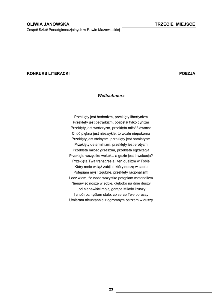 OLIWIA JANOWSKA TRZECIE MIEJSCE Zespół Szkół Ponadgimnazjalnych w Rawie Mazowieckiej KONKURS LITERACKI POEZJA Weltschmerz Przeklęty jest hedonizm, przeklęty libertynizm Przeklęty jest petrarkizm, pozostał tylko cynizm Przeklęty jest werteryzm, przeklęta miłość dworna Choć piękna jest niezwykle, to wcale niepokorna Przeklęty jest stoicyzm, przeklęty jest hamletyzm Przeklęty determinizm, przeklęty jest erotyzm Przeklęta miłość grzeszna, przeklęta egzaltacja Przeklęte wszystko wokół# a gdzie jest inwokacja? Przeklęta Twa transgresja i ten dualizm w Tobie Który mnie wciąż zabija i który noszę w sobie Potępiam myśli zgubne, przeklęty racjonalizm! Lecz wiem, że nade wszystko potępiam materializm Nienawiść noszę w sobie, głęboko na dnie duszy Lód nienawiści mojej gorąca Miłość kruszy I choć rozmyślam stale, co serce Twe poruszy Umieram nieustannie z ogromnym ostrzem w duszy 23