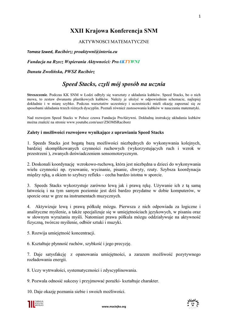 1 XXII Krajowa Konferencja SNM AKTYWNOSCI MATEMATYCZNE Tomasz Szwed, Racibórz; [email protected] Fundacja na Rzecz Wspierania Aktywności: ProAKTYWNI Danuta Zwolińska, PWSZ Racibórz Speed Stacks, czyli mój sposób na ucznia Streszczenie. Podczas KK SNM w Łodzi odbyły się warsztaty z układania kubków. Speed Stacks, bo o nich mowa, to zestaw dwunastu plastikowych kubków. Należy je ułożyć w odpowiednim schemacie, najlepiej dokładnie i w miarę szybko. Podczas warsztatów uczestnicy i uczestniczki mieli okazję zapoznać się ze sposobami układania trzech różnych dyscyplin. Poznali również zastosowania kubków w nauczaniu matematyki. Nad rozwojem Speed Stacks w Polsce czuwa Fundacja ProAktywni. Dokładną instrukcję układania kubków można znaleźć na stronie www.youtube.com/user/ZSOMSRaciborz Zalety i możliwości rozwojowe wynikające z uprawiania Speed Stacks 1. Speeds Stacks jest bogatą bazą możliwości niezbędnych do wykonywania kolejnych, bardziej skomplikowanych czynności ruchowych (wykorzystujących ruch i wzrok w przestrzeni ), zwanych doświadczeniem sensomotorycznym. 2. Doskonali koordynację wzrokowo-ruchową, która jest niezbędna u dzieci do wykonywania wielu czynności np. rysowanie, wycinanie, pisanie, chwyty, rzuty. Szybsza koordynacja między ręką, a okiem to szybszy refleks – cecha bardzo istotna w sporcie. 3. Speeds Stacks wykorzystuje zarówno lewą jak i prawą rękę. Używanie ich z tą samą łatwością i na tym samym poziomie jest dziś bardzo przydatne w dobie komputerów, w sporcie oraz w grze na instrumentach muzycznych. 4. Aktywizuje lewą i prawą półkulę mózgu. Pierwsza z nich odpowiada za logiczne i analityczne myślenie, a także specjalizuje się w umiejętnościach językowych, w pisaniu oraz w słownym wyrażaniu myśli. Natomiast prawa półkula mózgu oddziaływuje na aktywność fizyczną, twórcze myślenie, odbiór sztuki i muzyki. 5. Rozwija umiejętność koncentracji. 6. Kształtuje płynność ruchów, szybkość i jego precyzję. 7. Daje satysfakcję z opanowania umiejętności, a zarazem możliwość pozytywnego rozładowania energii. 8. Uczy wytrwałości, systematyczności i zdyscyplinowania. 9. Pozwala odnosić sukcesy i przyjmować porażki- kształtuje charakter. 10. Daje okazję poznania siebie i swoich możliwości. www.maciejko.org 2 11. Uczy umiejętności radzenia sobie ze stresem. 12. Umożliwia zdrową rywalizację i grę w zespole. 13. Uczy współpracy. Kształtuje umiejętność pracy w oparciu o ustalone zasady. 14. Stwarza okazje do wyznaczania celów i ich realizacji. 15. Daje szansę podejmowania szybkich działań w warunkach ekstremalnego stresu wynikającego z udziału w zawodach przy licznej publiczności. www.maciejko.org