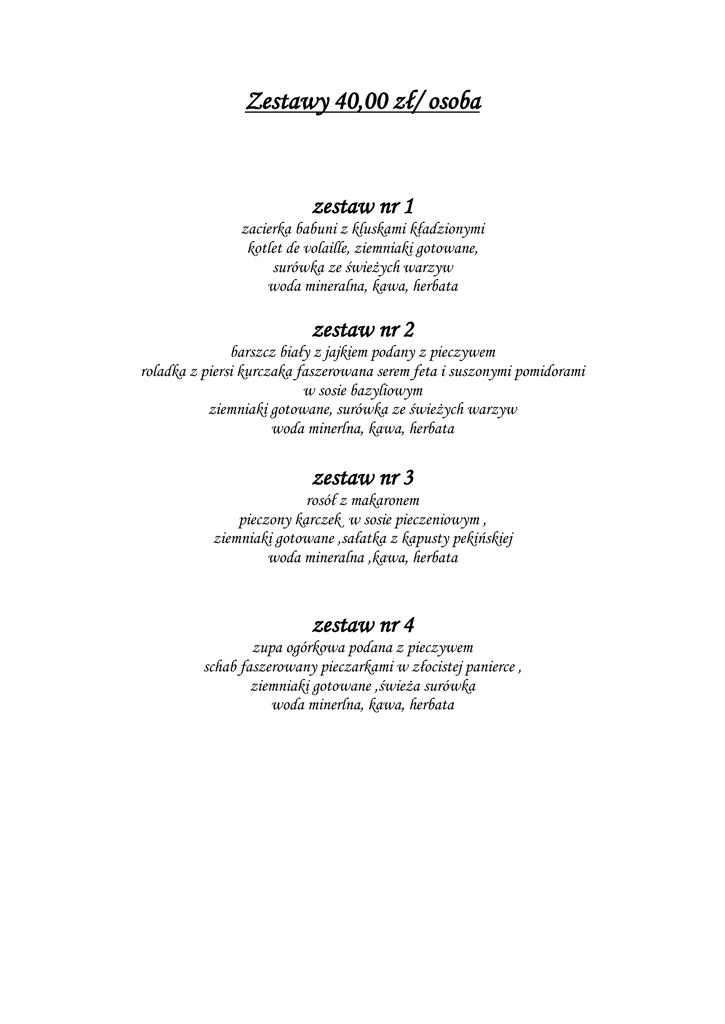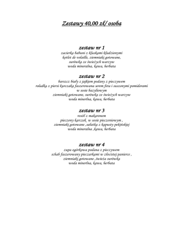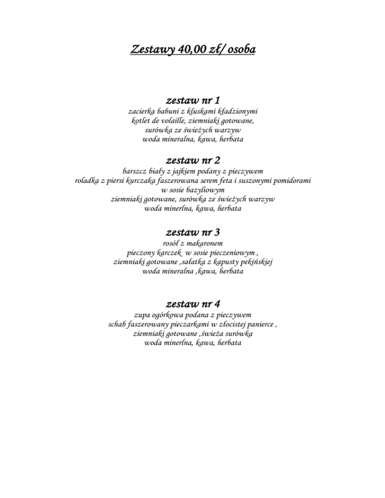 Zestawy 40,00 zł/ osoba zestaw nr 1 zacierka babuni z kluskami kładzionymi kotlet de volaille, ziemniaki gotowane, surówka ze świeżych warzyw woda mineralna, kawa, herbata zestaw nr 2 barszcz biały z jajkiem podany z pieczywem roladka z piersi kurczaka faszerowana serem feta i suszonymi pomidorami w sosie bazyliowym ziemniaki gotowane, surówka ze świeżych warzyw woda minerlna, kawa, herbata zestaw nr 3 rosół z makaronem pieczony karczek w sosie pieczeniowym , ziemniaki gotowane ,sałatka z kapusty pekińskiej woda mineralna ,kawa, herbata zestaw nr 4 zupa ogórkowa podana z pieczywem schab faszerowany pieczarkami w złocistej panierce , ziemniaki gotowane ,świeża surówka woda minerlna, kawa, herbata Zestawy 50,00 zł/ osoba zestaw nr 1 barszcz czerwony z kołdunami grillowana pierś z pieczarkami, ziemniaki opiekane, surówka ze świeżych warzyw deser lodowy woda mineralna,soki, kawa, herbata zestaw nr 2 barszcz biały z jajkiem podany z pieczywem schabowy po staropolsku z kapustą zasmażaną ziemniaki opiekane, surówka ze świeżych warzyw szarlotka królewska woda mineralna, soki, kawa, herbata zestaw nr 3 rosół z makaronem wiosennym dorsz duszony w warzywach , puree ziemniaczane ,zestaw surówek w-z woda mineralna, soki ,kawa, herbata zestaw nr 4 zupa krem z brokułów polędwiczka wieprzowa w sosie serowym , ziemniaki gotowane ,warzywa z pieca owoce z bitą śmietaną woda mineralna, soki , kawa, herbata Zestawy 60,00 zł/ osoba zestaw nr 1 rolada z kaczki z żurawiną zupa francuska z pulpetami polędwiczka wieprzowa w sosie borowikowym, ziemniaki opiekane, zestaw surówek szarlotka na ciepło z lodami woda mineralna, kawa, soki,, herbata - lampka wina 100 ml zestaw nr 2 łosoś w cieście szpinakowym z serkiem ziołowym krem z pomidorów z pianką bazyliową polędwiczka w boczku w sosie BBQ na szpinaku ziemniaki opiekane, zestaw surówek sernik na zimno z ricotty woda mineralna, soki, kawa, herbata lampka wina 100 ml zestaw nr 3 pasztet cielęcy z kurkami w cieście francuskim żur staropolski sandacz pieczony na kurkach w śmietanie puree ziemniaczane ,zestaw surówek tiramisu woda mineralna, soki ,kawa, herbata lampka wina 100 ml zestaw nr 4 roladki z cukinii z twarożkiem ziołowym zupa borowikowa z łazankami kaczka pieczona z jabłkiem i żurawiną , ziemniaki opiekane , buraczki na ostro sernik z białą czekoladą woda mineralna, soki , kawa lampka wina 100 ml - Ceny zestawów obowiązują przy rezerwacjach dla powyżej 20 osób-