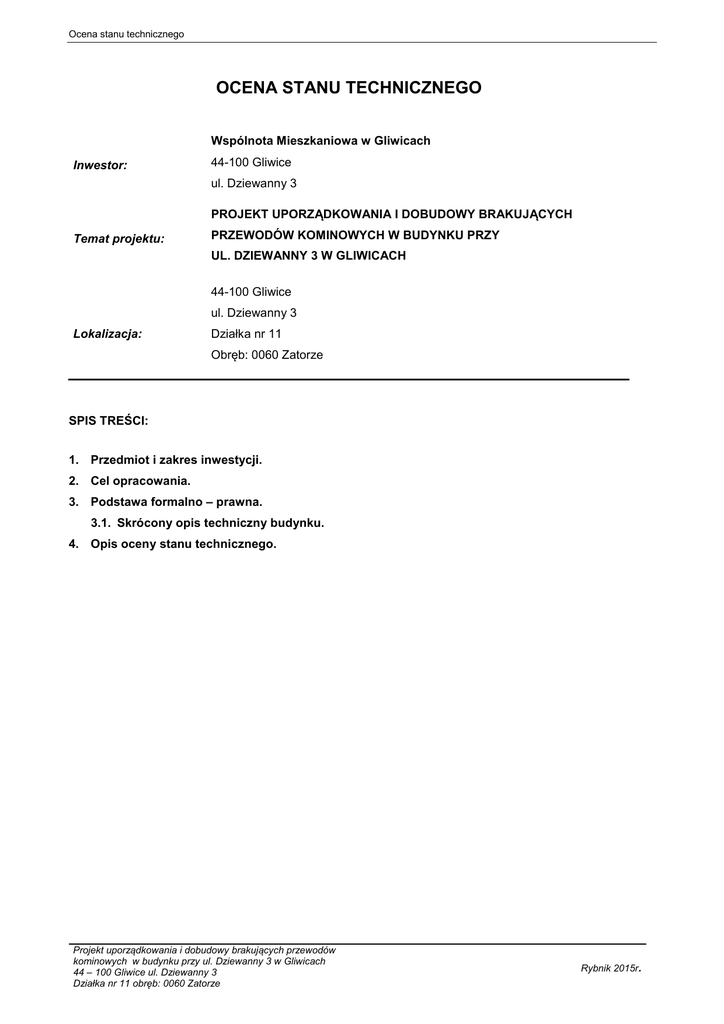 Ocena stanu technicznego OCENA STANU TECHNICZNEGO Wspólnota Mieszkaniowa w Gliwicach Inwestor: 44-100 Gliwice ul. Dziewanny 3 PROJEKT UPORZĄDKOWANIA I DOBUDOWY BRAKUJĄCYCH Temat projektu: PRZEWODÓW KOMINOWYCH W BUDYNKU PRZY UL. DZIEWANNY 3 W GLIWICACH 44-100 Gliwice ul. Dziewanny 3 Lokalizacja: Działka nr 11 Obręb: 0060 Zatorze SPIS TREŚCI: 1. Przedmiot i zakres inwestycji. 2. Cel opracowania. 3. Podstawa formalno – prawna. 3.1. Skrócony opis techniczny budynku. 4. Opis oceny stanu technicznego. Projekt uporządkowania i dobudowy brakujących przewodów kominowych w budynku przy ul. Dziewanny 3 w Gliwicach 44 – 100 Gliwice ul. Dziewanny 3 Działka nr 11 obręb: 0060 Zatorze Rybnik 2015r. Ocena stanu technicznego 1. Przedmiot i zakres inwestycji. Przedmiotem niniejszego opracowania jest budynek mieszkalny przy ul. Dziewanny w Gliwicach. Zakres opracowania obejmuje uporządkowanie przewodów wentylacyjnych, dymowych i spalinowych oraz dobudowę przewodów wentylacyjnych i spalinowych wynikających z potrzeb obowiązujących przepisów. Przewiduje się dobudowę czterech pionów kominowych wentylacyjnych oraz przedłużenie jednego przewody wentylacyjnego i spalinowego. Roboty związane z realizacją inwestycji nie wyjdą swym zasięgiem poza granicę działki nr 11. W ramach inwestycji została wykonana inwentaryzacja części budynku w zakresie koniecznym do opracowania niniejszej dokumentacji. 2. Cel opracowania. Podstawowym celem niniejszej dokumentacji jest przedstawienie rozwiązań technicznych doprowadzających system przewodów kominowych i wentylacyjnych do prawidłowych warunków eksploatacyjnych zgodnie z obowiązującymi normami i przepisami w zakresie warunków technicznych jakim powinny odpowiadać budynki w odniesieniu do budynku mieszkalnego wielorodzinnego przy ul. Dziewanny 3 Gliwicach. 3. Podstawa formalno – prawna Podstawa opracowania stanowi: zlecenie Wspólnoty Mieszkaniowej w Gliwicach z siedzibą przy ulicy Dziewanny 3 wizja lokalna w terenie, pomiary inwentaryzacyjne, aktualne obowiązujące normy i przepisy prawne, 3.1. Skrócony opis techniczny budynku. Budynek mieszkalny wielorodzinny, pięciokondygnacyjny z strychem nieużytkowym, podpiwniczony. W budynku znajduje się 10 lokali mieszkalnych. Budynek wykonany został w technologii tradycyjnej murowanej z cegły pełnej, stropy nad piwnicami to sklepienia ceglane i strop ceglany oparty na belkach stalowych, w części mieszkalnej drewniane belkowe, konstrukcja dachu drewniana płatwiowo-kleszczowa. Dach o dwuspadowy, od północno-zachodniej strony nachylony pod kątem 4 pokryty papą wierzchniego krycia i dachówką karpiówka ułożoną w koronkę. Na dachu znajduję się wieżyczka przeciwlotnicza która nie została poddana inwentaryzacji. Klatka schodowa dwubiegowa z biegami prowadzącymi na poszczególne kondygnacje. Wejście główne do budynku zostało zlokalizowane od strony południowo-wschodniej, a więc od strony ulicy Dziewanny. Do budynku można się również dostać wejściem od strony północno-zachodniej a więc od strony podwórka. Przedmiotowy budynek chroniony jest prawem miejscowym miasta Gliwice. 2 Powierzchnia działki nr 11 wynosi 377 m . Działka jest nieogrodzona. Od strony południowo-wschodniej działka przylega do ulicy Dziewanny. Od strony północno-wschodniej i południowo-zachodniej przedmiotowy budynek przylega częściowo do sąsiednich kamienic. W północno-zachodniej cześci działku znajduję się budynek usługowy który nie podlega opracowaniu. Na przedmiotowej działce nr 11 nie znajdują się obiekty budowlane przeznaczone do rozbiórki. W przedmiotowym budynku planowane prace remontowe kominów nie spowoduje zwiększenia zapotrzebowania na żadne media. Budynek i jego forma architektoniczna nie ulegną zmianie użytkowania po przebudowie kominów. Projekt uporządkowania i dobudowy brakujących przewodów kominowych w budynku przy ul. Dziewanny 3 w Gliwicach 44 – 100 Gliwice ul. Dziewanny 3 Działka nr 11 obręb: 0060 Zatorze Rybnik 2015r. Ocena stanu technicznego 4. Opis oceny stanu technicznego. Oznaczenia stanu technicznego oznacza: a) b. dobry – istniejący stan elementu idealny, nie wymaga żadnych napraw i remontów, b) dobry – istniejący stan elementu nie budzi zastrzeżeń, element w chwili obecnej nie wymaga napraw ani remontów, c) średni – istniejący stan elementu wymaga naprawy w najbliższym czasie, d) zły – istniejący stan elementu wymaga natychmiastowego kapitalnego remontu bądź wymiany. Zaniedbanie w tym zakresie spowodować może zagrożenie bezpieczeństwa konstrukcji, mienia, środowiska i ludzi tam przebywających. Fundamenty i ściany fundamentowe – nie poddano analizie ani odkrywkom, z uwagi na brak zwiększania jakichkolwiek obciążeń. Konstrukcja nośna – konstrukcję nośną budynku stanowi układ poprzeczny i podłużny ścian murowanych z cegły pełnej oraz stropy na belkach drewnianych Stan techniczny ścian jest dobry nie ma widocznych rys, spękań ani uszkodzeń. Ściany zewnętrzne – wykonane zostały jako jednowarstwowe murowane z cegły ceramicznej pełnej na zaprawie cementowo wapiennej. Ściany posiadają grubość od 55cm do 40cm-na IV piętrze. Stan techniczny ścian budynku jest dobry nie ma widocznych rys, spękań i uszkodzeń. Ściany wewnętrzne – nośne ściany wewnętrzne wykonane zostały jako murowane z cegły pełnej wykończone obustronnym tynkiem cementowo wapiennym lub tynkiem mozaikowym-na klatce schodowej. Grubość ścian nośnych jest zróżnicowana 50, 45, 42, 35, 30, 28 cm. Wynika to z pocienienia ścian wyższych kondygnacji. Oględziny ścian nie wykazały żadnych uszkodzeń, zarysowań które mogłyby świadczyć o uszkodzeniach zagrażających bezpieczeństwu dalszego użytkowania. Ścianki działowe pomieszczeń wykonane zostały jako murowane z cegły ceramicznej pełnej gr. 15, 12 i 10cm obłożone obustronnym tynkiem cem.- wap. Przeprowadzone oględziny ścian 
