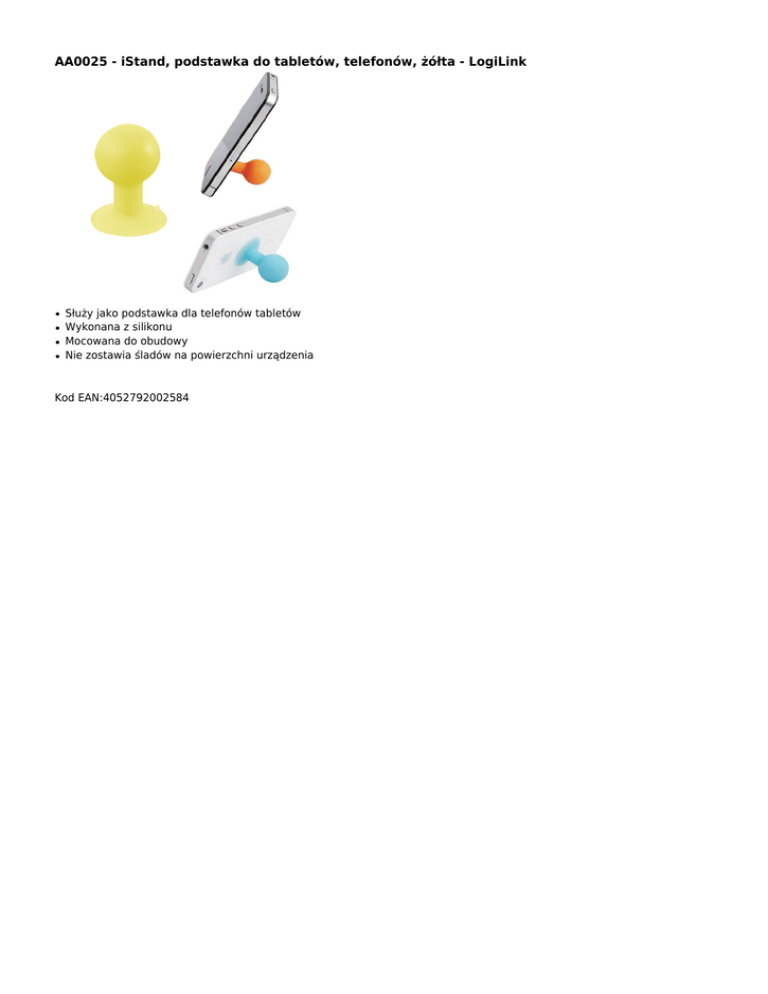 AA0025 - iStand, podstawka do tabletów, telefonów, żółta - LogiLink ● ● ● ● Służy jako podstawka dla telefonów tabletów Wykonana z silikonu Mocowana do obudowy Nie zostawia śladów na powierzchni urządzenia Kod EAN:4052792002584