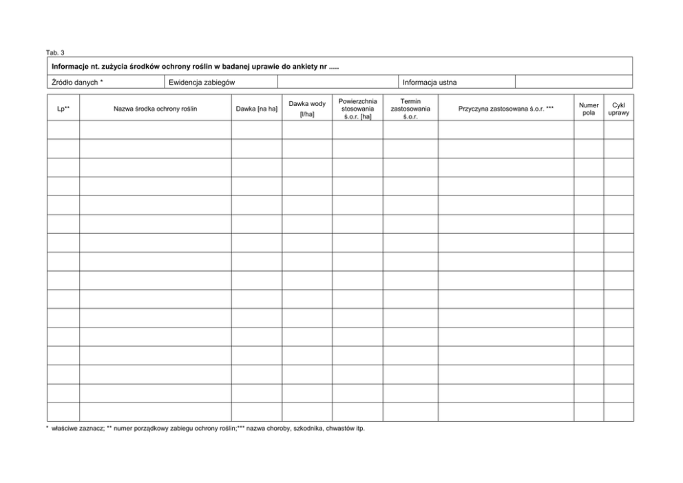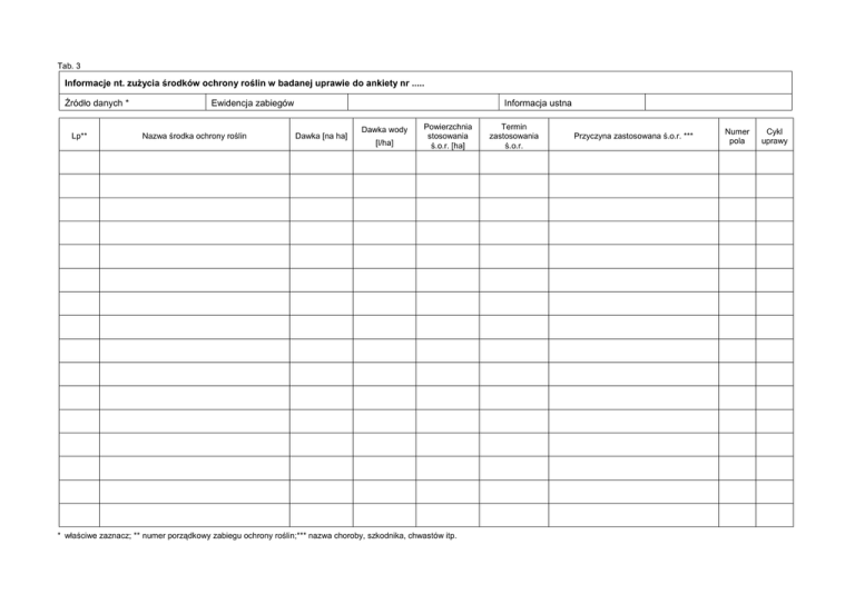 Tab. 3 Informacje nt. zużycia środków ochrony roślin w badanej uprawie do ankiety nr ..... Źródło danych * Lp** Ewidencja zabiegów Nazwa środka ochrony roślin Informacja ustna Dawka [na ha] Dawka wody [l/ha] Powierzchnia stosowania ś.o.r. [ha] * właściwe zaznacz; ** numer porządkowy zabiegu ochrony roślin;*** nazwa choroby, szkodnika, chwastów itp. Termin zastosowania ś.o.r. Przyczyna zastosowana ś.o.r. *** Numer pola Cykl uprawy