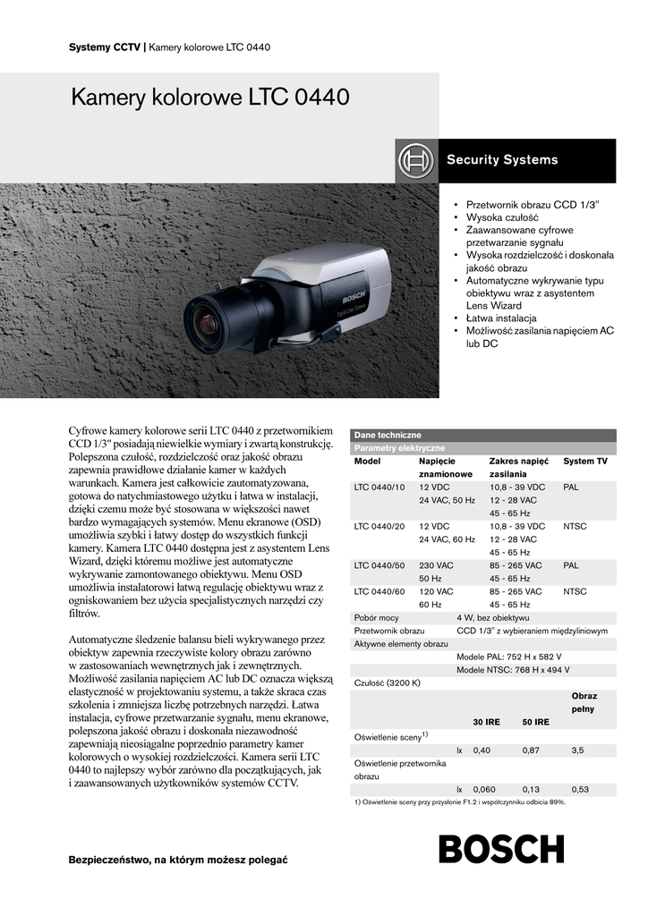 Systemy CCTV | Kamery kolorowe LTC 0440 Kamery kolorowe LTC 0440 • Przetwornik obrazu CCD 1/3" • Wysoka czułość • Zaawansowane cyfrowe przetwarzanie sygnału • Wysoka rozdzielczość i doskonała jakość obrazu • Automatyczne wykrywanie typu obiektywu wraz z asystentem Lens Wizard • Łatwa instalacja • Możliwość zasilania napięciem AC lub DC Cyfrowe kamery kolorowe serii LTC 0440 z przetwornikiem CCD 1/3" posiadają niewielkie wymiary i zwartą konstrukcję. Polepszona czułość, rozdzielczość oraz jakość obrazu zapewnia prawidłowe działanie kamer w każdych warunkach. Kamera jest całkowicie zautomatyzowana, gotowa do natychmiastowego użytku i łatwa w instalacji, dzięki czemu może być stosowana w większości nawet bardzo wymagających systemów. Menu ekranowe (OSD) umożliwia szybki i łatwy dostęp do wszystkich funkcji kamery. Kamera LTC 0440 dostępna jest z asystentem Lens Wizard, dzięki któremu możliwe jest automatyczne wykrywanie zamontowanego obiektywu. Menu OSD umożliwia instalatorowi łatwą regulację obiektywu wraz z ogniskowaniem bez użycia specjalistycznych narzędzi czy filtrów. Automatyczne śledzenie balansu bieli wykrywanego przez obiektyw zapewnia rzeczywiste kolory obrazu zarówno w zastosowaniach wewnętrznych jak i zewnętrznych. Możliwość zasilania napięciem AC lub DC oznacza większą elastyczność w projektowaniu systemu, a także skraca czas szkolenia i zmniejsza liczbę potrzebnych narzędzi. Łatwa instalacja, cyfrowe przetwarzanie sygnału, menu ekranowe, polepszona jakość obrazu i doskonała niezawodność zapewniają nieosiągalne poprzednio parametry kamer kolorowych o wysokiej rozdzielczości. Kamera serii LTC 0440 to najlepszy wybór zarówno dla początkujących, jak i zaawansowanych użytkowników systemów CCTV. Dane techniczne Parametry elektryczne Model LTC 0440/10 Napięcie Zakres napięć znamionowe zasilania 12 VDC 10,8 - 39 VDC 24 VAC, 50 Hz 12 - 28 VAC 12 VDC 10,8 - 39 VDC 24 VAC, 60 Hz 12 - 28 VAC System TV PAL 45 - 65 Hz LTC 0440/20 NTSC 45 - 65 Hz LTC 0440/50 LTC 0440/60 230 VAC 85 - 265 VAC 50 Hz 45 - 65 Hz 120 VAC 85 - 265 VAC 60 Hz 45 - 65 Hz PAL NTSC Pobór mocy 4 W, bez obiektywu Przetwornik obrazu CCD 1/3" z wybieraniem międzyliniowym Aktywne elementy obrazu Modele PAL: 752 H x 582 V Modele NTSC: 768 H x 494 V Czułość (3200 K) Obraz pełny 30 IRE 50 IRE lx 0,40 0,87 3,5 lx 0,060 0,13 0,53 Oświetlenie sceny1) Oświetlenie przetwornika obrazu 1) Oświetlenie sceny przy przysłonie F1.2 i współczynniku odbicia 89%. Bezpieczeństwo, na którym możesz polegać 2 | Kamery kolorowe LTC 0440 Parametry elektryczne Parametry środowiskowe Rozdzielczość pozioma 480 linii TV Stosunek sygnał / szum 50 dB pracy: -20°C/+50°C AGC (ARW) maks. 21 dB przechowywania: -25°C/+70°C Migawka elektroniczna automatyczna, 1/50 - 1/125000 s Wilgotność 5 – 93%, bez kondensacji Odporność Temperatura (PAL), 1/60 - 1/50000 s (NTSC) Kompatybilność Korekcja apertury symetryczna, pozioma i pionowa elektromagnetyczna Kompensacja tła względem centralnego obszaru obrazu Emisja Wyjście wizyjne całkowity sygnał wizyjny: 1,0 Vpp, 75 Ω EN50130-4 EN505022 Klasa B FCC, Klasa B Część 15 Synchronizacja Standardy Siecią zasilającą bezpieczeństwa (przy zasilaniu AC): synchronizacja kamery w punkcie przejścia LTC 0440/10 i LTC 0440/50 EN60065 LTC 0440/20 i LTC 0440/60 UL6500 napięcia zasilającego przez zero. Opóźnienie fazy odchylania pionowego może być regulowane (w zakresie 0 - 358°), aby Informacje do zamówieñ umożliwić uzyskanie synchronizacji pionowej w instalacji, w której LTC 0440/10 LTC 0440/10 urządzenia zasilane są z różnych faz LTC 0440/20 LTC 0440/20 Synchronizacja wewnętrzna LTC 0440/50 LTC 0440/50 (przy zasilaniu DC lub wyłączonej synchronizacji siecią zasilającą): LTC 0440/60 LTC 0440/60 wszystkie modele wyposażone są standardowo w wewnętrzną Akcesoria synchronizację generatorem kwarcowym Obiektyw zmiennoogniskowy LTC 3364/40 Regulacje Obiektyw zmiennoogniskowy LTC 3374/20 LTC 3374/20 Zasilacz sieciowy TC120PS TC120PS Poziom sygnału wizyjnego LTC 3364/40 Migawka: automatyczna / wyłączona / bez migotania Zasilacz sieciowy TC220PS TC220PS ARW (AGC): włączona / wyłączona Transformator zasilający TC220PSX-24 TC220PSX-24 Kompensacja tła: włączona / wyłączona Transformator zasilający TC1334 TC1334 Balans bieli: włączony / względem stałego poziomu Składowa R Składowa B Regulacja fazy: 0 – 358° Parametry mechaniczne Złącza - Wyjście wizyjne: BNC - Regulacja przysłony sygnałem wizyjnym / napięciem DC: złącze 4-stykowe EIA-J Zasilanie LTC 0440/10 i LTC 0440/20: złącza zaciskowe, polaryzacja dowolna, izolowane od wyjścia wizyjnego LTC 0440/50: kabel sieciowy z wtykiem 2-stykowym standardu europejskiego LTC 0440/60: kabel sieciowy z wtykiem 2-stykowym standardu amerykańskiego Mocowanie obiektywu C i CS Wymiary 58 (wys.) x 66 (szer.) x 122 (dł.*) mm (* ze złączami) Masa | | | 7. Mar 2005 0,45 kg
