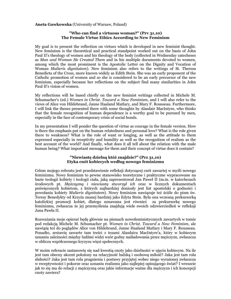 Aneta Gawkowska (University of Warsaw, Poland) "Who can find a virtuous woman?" (Prv 31,10) The Female Virtue Ethics According to New Feminism My goal is to present the reflection on virtues which is developed in new feminist thought. New feminism is the theoretical and practical standpoint worked out on the basis of John Paul II's theology of women and his theology of the body (collected in Wednesday catecheses as Man and Woman He Created Them and in his multiple documents devoted to women, among which the most prominent is the Apostolic Letter on the Dignity and Vocation of Woman Mulieris dignitatem). New feminism also refers to the writings of St. Theresa Benedicta of the Cross, more known widely as Edith Stein. She was an early proponent of the Catholic promotion of women and so she is considered to be an early precursor of the new feminism, especially because her reflections on the subject find many similarities in John Paul II's vision of women. My reflections will be based chiefly on the new feminist writings collected in Michele M. Schumacher's (ed.) Women in Christ. Toward a New Feminism, and I will also refer to the views of Alice von Hildebrand, Janne Haaland Matlary, and Mary F. Rousseau. Furthermore, I will link the theses presented there with some thoughts by Alasdair MacIntyre, who thinks that the female recognition of human dependence is a worthy goal to be pursued by men, especially in the face of contemporary crisis of social bonds. In my presentation I will ponder the question of virtue as courage in the female version. How is there the emphasis put on the human relatedness and personal love? What is the role given there to weakness? What is the role of want or longing, as well as the attitude to them expressed especially in receptivity and humility as well as the recognition of realism as the best account of the world? And finally, what does it all tell about the relation with the male human being? What important message for them and their concept of virtue does it contain? "Niewiastę dzielną któż znajdzie?" (Prz 31,10) Etyka cnót kobiecych według nowego feminizmu Celem mojego referatu jest przedstawienie refleksji dotyczącej cnót zawartej w myśli nowego feminizmu. Nowy feminizm to pewne stanowisko teoretyczne i praktyczne wypracowane na bazie teologii kobiety i teologii ciała, jaką zaprezentował Jan Paweł II (m.in. w katechezach środowych pt. Mężczyzną i niewiastą stworzył ich oraz w licznych dokumentach poświęconych kobietom, z których najbardziej doniosły jest list apostolski o godności i powołaniu kobiety Mulieris dignitatem). Nowy feminizm nawiązuje też ściśle do pism św. Teresy Benedykty od Krzyża znanej bardziej jako Edyta Stein. Była ona wczesną prekursorką katolickiej promocji kobiet, dlatego uznawana jest również za prekursorkę nowego feminizmu, zwłaszcza że jej przemyślenia znajdują wiele swoich odzwierciedleń w refleksji Jana Pawła II. Rozważania moje opierać będę głównie na pismach nowofeministycznych zawartych w tomie pod redakcją Michele M. Schumacher pt. Women in Christ. Toward a New Feminism, ale nawiążę też do poglądów Alice von Hildebrand, Janne Haaland Matlary i Mary F. Rousseau. Ponadto, zestawię zawarte tam treści z tezami Alasdaira MacIntyre'a, który w kobiecym uznaniu zależności między ludźmi widzi wzór godny naśladowania przez mężczyzn, zwłaszcza w obliczu współczesnego kryzysu więzi społecznych. W moim referacie zastanowię się nad kwestią cnoty jako dzielności w ujęciu kobiecym. Na ile jest tam obecny akcent położony na relacyjność ludzką i osobową miłość? Jaka jest tam rola słabości? Jaka jest tam rola pragnienia i postawy przyjętej wobec niego wyrażonej zwłaszcza w receptywności i pokorze oraz uznaniu realizmu jako najlepiej opisującego świat? I wreszcie jak to się ma do relacji z mężczyzną oraz jakie informacje ważne dla mężczyzn i ich koncepcji cnoty zawiera?