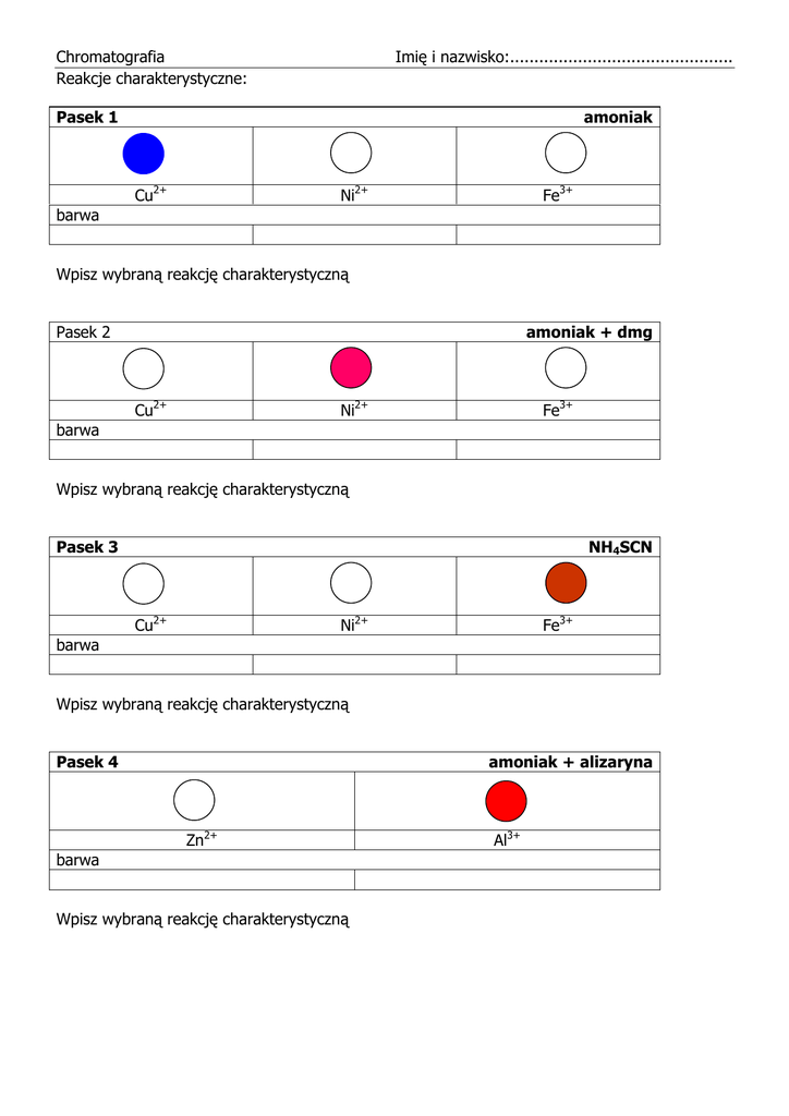 Chromatografia Reakcje charakterystyczne: Imię i nazwisko:.............................................. Pasek 1 amoniak Cu2+ Ni2+ Fe3+ barwa Wpisz wybraną reakcję charakterystyczną Pasek 2 amoniak + dmg Cu2+ Ni2+ Fe3+ barwa Wpisz wybraną reakcję charakterystyczną Pasek 3 NH4SCN Cu2+ Ni2+ Fe3+ barwa Wpisz wybraną reakcję charakterystyczną Pasek 4 amoniak + alizaryna Zn2+ barwa Wpisz wybraną reakcję charakterystyczną Al3+ Chromatografia Chromatografia kolumnowa Wywoływacz: amoniak start barwa: zidentyfikowany jon: Wywoływacz: amoniak+dmg start barwa: zidentyfikowany jon: Wywoływacz: NH4SCN start barwa: zidentyfikowany jon: Kolejność jonów: Imię i nazwisko:.............................................. Chromatografia Imię i nazwisko:.............................................. Chromatografia krążkowa Mieszanina a: Cu2+, Ni2+, Fe3+ Mieszanina a: Cu2+, Ni2+, Fe3+ amoniak amoniak + dmg NH4SCN Obserwacja: amoniak amoniak + dmg NH4SCN Identyfikacja jonów: Kolejność jonów: Chromatografia Chromatografia krążkowa Mieszanina b: Zn2+, Al3+ Mieszanina b: Zn2+, Al3+ amoniak + alizaryna Obserwacja: Identyfikacja jonów: Kolejność jonów: Imię i nazwisko:..............................................