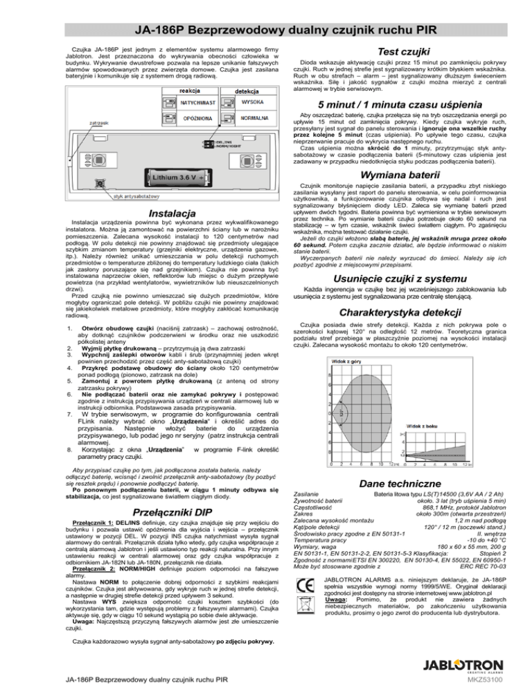 JA-186P Bezprzewodowy dualny czujnik ruchu PIR Czujka JA-186P jest jednym z elementów systemu alarmowego firmy Jablotron. Jest przeznaczona do wykrywania obecności człowieka w budynku. Wykrywanie dwustrefowe pozwala na lepsze unikanie fałszywych alarmów spowodowanych przez zwierzęta domowe. Czujka jest zasilana bateryjnie i komunikuje się z systemem drogą radiową. Test czujki Dioda wskazuje aktywację czujki przez 15 minut po zamknięciu pokrywy czujki. Ruch w jednej strefie jest sygnalizowany krótkim błyskiem wskaźnika. Ruch w obu strefach – alarm – jest sygnalizowany dłuższym świeceniem wskaźnika. Siłę i jakość sygnałów z czujki można mierzyć z centrali alarmowej w trybie serwisowym. 5 minut / 1 minuta czasu uśpienia Aby oszczędzać baterię, czujka przełącza się na tryb oszczędzania energii po upływie 15 minut od zamknięcia pokrywy. Kiedy czujka wykryje ruch, przesyłany jest sygnał do panelu sterowania i ignoruje ona wszelkie ruchy przez kolejne 5 minut (czas uśpienia). Po upływie tego czasu, czujka nieprzerwanie pracuje do wykrycia następnego ruchu. Czas uśpienia można skrócić do 1 minuty, przytrzymując styk antysabotażowy w czasie podłączenia baterii (5-minutowy czas uśpienia jest zadawany w przypadku niedotknięcia styku podczas podłączenia baterii). Wymiana baterii Instalacja Instalacja urządzenia powinna być wykonana przez wykwalifikowanego instalatora. Można ją zamontować na powierzchni ściany lub w narożniku pomieszczenia. Zalecana wysokość instalacji to 120 centymetrów nad podłogą. W polu detekcji nie powinny znajdować się przedmioty ulegające szybkim zmianom temperatury (grzejniki elektryczne, urządzenia gazowe, itp.). Należy również unikać umieszczania w polu detekcji ruchomych przedmiotów o temperaturze zbliżonej do temperatury ludzkiego ciała (takich jak zasłony poruszające się nad grzejnikiem). Czujka nie powinna być instalowana naprzeciw okien, reflektorów lub miejsc o dużym przepływie powietrza (na przykład wentylatorów, wywietrzników lub nieuszczelnionych drzwi). Przed czujką nie powinno umieszczać się dużych przedmiotów, które mogłyby ograniczać pole detekcji. W pobliżu czujki nie powinny znajdować się jakiekolwiek metalowe przedmioty, które mogłyby zakłócać komunikację radiową. 1. 2. 3. 4. 5. 6. Otwórz obudowę czujki (naciśnij zatrzask) – zachowaj ostrożność, aby dotknąć czujników podczerwieni w środku oraz nie uszkodzić półkolistej anteny Wyjmij płytkę drukowaną – przytrzymują ją dwa zatrzaski Wypchnij zaślepki otworów kabli i śrub (przynajmniej jeden wkręt powinien przechodzić przez część anty-sabotażową czujki) Przykręć podstawę obudowy do ściany około 120 centymetrów ponad podłogą (pionowo, zatrzask na dole) Zamontuj z powrotem płytkę drukowaną (z anteną od strony zatrzasku pokrywy) Nie podłączać baterii oraz nie zamykać pokrywy i postępować zgodnie z instrukcją przypisywania urządzeń w centrali alarmowej lub w instrukcji odbiornika. Podstawowa zasada przypisywania. Czujnik monitoruje napięcie zasilania baterii, a przypadku zbyt niskiego zasilania wysyłany jest raport do panelu sterowania, w celu poinformowania użytkownika, a funkcjonowanie czujnika odbywa się nadal i ruch jest sygnalizowany błyśnięciem diody LED. Zaleca się wymianę baterii przed upływem dwóch tygodni. Bateria powinna być wymieniona w trybie serwisowym przez technika. Po wymianie baterii czujka potrzebuje około 60 sekund na stabilizację – w tym czasie, wskaźnik świeci światłem ciągłym. Po zgaśnięciu wskaźnika, można testować działanie czujki. Jeżeli do czujki włożono słabą baterię, jej wskaźnik mruga przez około 60 sekund. Potem czujka zacznie działać, ale będzie informować o niskim stanie baterii. Wyczerpanych baterii nie należy wyrzucać do śmieci. Należy się ich pozbyć zgodnie z miejscowymi przepisami. Usunięcie czujki z systemu Każda ingerencja w czujkę bez jej wcześniejszego zablokowania lub usunięcia z systemu jest sygnalizowana prze centralę sterującą. Charakterystyka detekcji Czujka posiada dwie strefy detekcji. Każda z nich pokrywa pole o szerokości kątowej 120° na odległość 12 metrów. Teoretyczna granica podziału stref przebiega w płaszczyźnie poziomej na wysokości instalacji czujki. Zalecana wysokość montażu to około 120 centymetrów. W trybie serwisowym, w programie do konfigurowania centrali FLink należy wybrać okno „Urządzenia“ i określić adres do przypisania. Następnie włożyć baterie do urządzenia przypisywanego, lub podać jego nr seryjny (patrz instrukcja centrali alarmowej. 8. Korzystając z okna „Urządzenia” w programie F-link określić parametry pracy czujki. 7. Aby przypisać czujkę po tym, jak podłączona została bateria, należy odłączyć baterię, wcisnąć i zwolnić przełącznik anty-sabotażowy (by pozbyć się resztek prądu) i ponownie podłączyć baterię. Po ponownym podłączeniu baterii, w ciągu 1 minuty odbywa się stabilizacja, co jest sygnalizowane światłem ciągłym diody. Przełączniki DIP Przełącznik 1: DEL/INS definiuje, czy czujka znajduje się przy wejściu do budynku i pozwala ustawić opóźnienia dla wyjścia i wejścia – przełącznik ustawiony w pozycji DEL. W pozycji INS czujka natychmiast wysyła sygnał alarmowy do centrali. Przełącznik działa tylko wtedy, gdy czujka współpracuje z centralą alarmową Jablotron i jeśli ustawiono typ reakcji naturalna. Przy innym ustawieniu reakcji w centrali alarmowej oraz gdy czujka współpracuje z odbiornikiem JA-182N lub JA-180N, przełącznik nie działa. Przełącznik 2: NORM/HIGH definiuje poziom odporności na fałszywe alarmy. Nastawa NORM to połączenie dobrej odporności z szybkimi reakcjami czujników. Czujka jest aktywowana, gdy wykryje ruch w jednej strefie detekcji, a następnie w drugiej strefie detekcji przed upływem 3 sekund. Nastawa