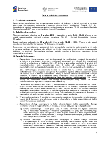 Opis przedmiotu zamówienia I. Przedmiot zamówienia Przedmiotem zamówienia jest zorganizowanie dwóch lub jednego z dwóch spotkań w centrum Warszawy dotyczącego wdrażania Programu Operacyjnego Inteligentny Rozwój (PO IR). Uczestnikami spotkań będą przedstawiciele instytucji systemu wdrażania PO IR, członkowie Komitetu Monitorującego PO IR oraz przedstawiciele Komisji Europejskiej. II. Opis i terminy spotkań: Pierwsze spotkanie odbędzie się 8 grudnia 2016 r. (czwartek) w godz. 9:30 – 15:30. Wezmą w nim udział przedstawiciele instytucji systemu wdrażania PO IR i Komisji Europejskiej (łącznie: 35 osób). Drugie spotkanie odbędzie się 15 grudnia 2016 r. w godz. 10:00 – 16:30. Wezmą w nim udział członkowie Komitetu Monitorującego PO IR (łącznie: 80 osób). Dopuszcza się zmniejszenie wskazanej liczb uczestników spotkania maksymalnie o 5 osób w ramach każdego ze spotkań, nie później niż 5 dni roboczych przed terminem rozpoczęcia każdego ze spotkań. Zamawiający poniesie wydatki zgodne z faktyczną zgłoszoną liczbą uczestników spotkania. III. Zadania Wykonawcy: 1. Zapewnienie klimatyzowanej sali konferencyjnej (z możliwością regulacji temperatury) w jednym z powyższych terminów z miejscami siedzącymi przy stołach (po zewnętrznej stronie) w ustawieniu w kształcie litery „U” (tylko w przypadku spotkania 8 grudnia br.) z uwzględnieniem stołu prezydialnego (dla 6 osób) lub ustawienie kolumnowe z uwzględnieniem stołu prezydialnego (dla 6 osób) odpowiednie w przypadku obu spotkań. Sala konferencyjna zlokalizowana będzie w hotelu lub w centrum konferencyjnym o standardzie odpowiadającym co najmniej 4 gwiazdkom, zgodnie z Rozporządzeniem z dnia 19 sierpnia 2004 r. Ministra Gospodarki i Pracy w sprawie obiektów hotelarskich i innych obiektów, w których są świadczone usługi hotelarskie (Dz.U.06.22.169 z późn. zm.), położonym w odległości nie większej niż 4 km od siedziby Zamawiającego – Pl. Trzech Krzyży 3/5, Warszawa (biorąc pod uwagę ogólnodostępne drogi pieszo lub autem – w zależności od tego, która odległość będzie krótsza). 2. Zapewnienie wyposażenia sali: laptop (z zainstalowanym pakietem Microsoft Office), rzutnik, ekran, flipchart, wskaźnik do prezentacji, multifony (1 szt. na 2 osoby), zapewnienie dostępu do internetu bezprzewodowego z dostępem do usługi na czas wynajmu sali konferencyjnej dla wszystkich uczestników spotkania, przedłużacze/gniazdka elektryczne dostępne w pobliżu stołów konferencyjnych oraz obsługa techniczna Sali (nagłośnienie, nagrywanie), dostępna co najmniej na pół godziny przed spotkaniem i podczas całego spotkania. 3. W przypadku spotkania 8 grudnia br. zapewnienie sprzętu do tłumaczenia symultanicznego: kabina dla 2 tłumaczy, oraz słuchawki wraz z odbiornikami w ilości odpowiadającej liczbie uczestników danego spotkania. 4. Zapewnienie obsługi cateringowej w ilości odpowiadającej liczbie uczestników danego spotkania, wraz z obsługą kelnerską w miejscu, w którym odbywać się będą spotkania: a) lunchu zasiadanego – bufet poza salą, w której odbywać się będzie spotkanie (np. w restauracji hotelowej/w oddzielnie wyznaczonej sali przy sali konferencyjnej); menu zawierające: zupę, co najmniej 2 dania mięsne, minimum 1 danie wegetariańskie, 3 rodzaje surówek, 3 rodzaje sałatek, 2 rodzaje dodatków skrobiowych, pieczywo, deser oraz napoje: kawa, herbata, soki, woda; b) serwisu kawowego z poczęstunkiem dostępnym w trakcie całego spotkania i uzupełnianym w razie potrzeby; serwis kawowy zlokalizowany będzie obok sali konferencyjnej lub w sali konferencyjnej, na stołach innych niż stoły uczestników konferencji; serwis będzie zawierał co najmniej: słodkie wypieki (co najmniej 3 rodzaje), świeże owoce sezonowe filetowane (ew. warzywa – co najmniej 3 rodzaje), napoje 1 (świeżo mielona i parzona kawa, herbata – co najmniej 3 rodzaje, soki, woda, cytryna, mleko, cukier); Wykonawca zapewni co najmniej 7 stolików koktajlowych; c) butelkowanej wody mineralnej (gazowanej i niegazowanej) o jednostkowej pojemności 0,2 l – 0,5 l na stołach uczestników konferencji (co najmniej 0,7 l na jedną osobę). 5. Dołączenie propozycji menu przy składaniu oferty. 6. Oznakowanie sali konferencyjnej w hotelu/ centrum konferencyjnym oraz drogi do sali, w której odbędą się spotkania. Przygotowanie oznakowania musi zostać zakończone na co najmniej godzinę przed rozpoczęciem spotkania. Sposób oznakowania miejsca konferencji zostanie ustalony z Zamawiającym. Na oznakowaniu powinna znaleźć się informacja, że szkolenie jest współfinansowane z Europejskiego Funduszu Rozwoju Regionalnego w ramach Programu Operacyjnego Inteligentny Rozwój 2014-2020; logo PO IR, logo Ministerstwa Rozwoju, logo Unii Europejskiej, zgodnie z Księgą identyfikacji wizualnej znaku marki Fundusze Europejskie i znaków programów polityki spójności na lata 2014-2020, dostępnej do pobrania pod adresem strony internetowej: http://www.funduszeeuropejskie.gov.pl/media/10013/KIW_CMYK_09102015.pdf 7. Zapewnienie uczestnikom konferencji szatni wraz z obsługą. 8. Wykonawca zapewni dla Zamawiającego bezpieczne miejsce, w którym na jeden dzień przed terminem spotkania i jeden dzień po terminie spotkania, będzie mógł złożyć materiały konferencyjne (np. roll-upy, wydrukowane prezentacje, notesy, długopisy). 9. Wykonawca wyznaczy jedną osobę do ogólnej koordynacji projektu, która będzie współpracowała z osobami wskazanymi przez Zamawiającego. IV. Termin i sposób złożenia oferty Oferty należy składać wyłącznie w wersji elektronicznej na adres: [email protected] do 21 listopada br. do godziny 23:59:59 (z zastrzeżeniem, że 17-18 listopada br. kontakt z Zamawiającym będzie utrudniony). V. Warunki udziału w zamówieniu 1. Oferty należy składać w terminie składania ofert. 2. Do oferty należy dołączyć szczegółowy koszto