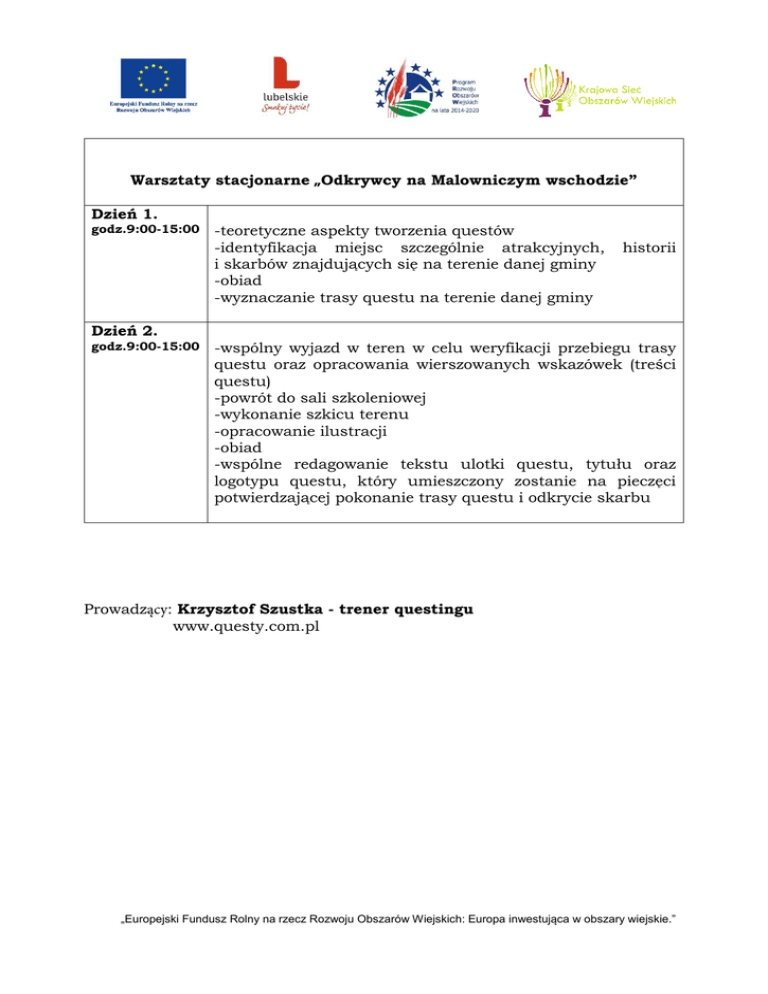 Warsztaty stacjonarne „Odkrywcy na Malowniczym wschodzie” Dzień 1. godz.9:00-15:00 -teoretyczne aspekty tworzenia questów -identyfikacja miejsc szczególnie atrakcyjnych, i skarbów znajdujących się na terenie danej gminy -obiad -wyznaczanie trasy questu na terenie danej gminy historii Dzień 2. godz.9:00-15:00 -wspólny wyjazd w teren w celu weryfikacji przebiegu trasy questu oraz opracowania wierszowanych wskazówek (treści questu) -powrót do sali szkoleniowej -wykonanie szkicu terenu -opracowanie ilustracji -obiad -wspólne redagowanie tekstu ulotki questu, tytułu oraz logotypu questu, który umieszczony zostanie na pieczęci potwierdzającej pokonanie trasy questu i odkrycie skarbu Prowadzący: Krzysztof Szustka - trener questingu www.questy.com.pl „Europejski Fundusz Rolny na rzecz Rozwoju Obszarów Wiejskich: Europa inwestująca w obszary wiejskie.”