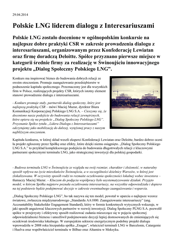 Polskie LNG liderem dialogu z Interesariuszami Polskie LNG zostało