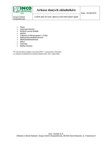 Arkusz danych składników Data : 02-08-2010 Grupa Chemii Gospodarczej • • • • • • • • • • Ludwik płyn do szyb i glazury nano-tech green apple Aqua Isopropyl Alcohol Sodium Lauryl Sulfate perfum 2-Bromo-2-Nitropropane-1,3-Diol Methylchloroisothiazolinone Methylisothiazolinone Silica Colorant Methyl Alcohol W celu korelacji między nazwami INCI i numerami CAS patrz: ec.europa.eu/enterprise/cosmetics/html/cosm_inci_index.htm Inco –Veritas S.A. Oddział w Górze Kalwarii, Grupa Chemii Gospodarczej, 05-530 Góra Kalwaria, ul. Towarowa 8