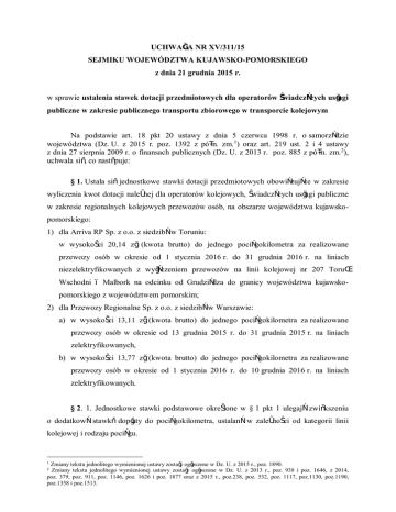 UCHWAŁA NR XV/311/15 SEJMIKU WOJEWÓDZTWA KUJAWSKO-POMORSKIEGO z dnia 21 grudnia 2015 r. w sprawie ustalenia stawek dotacji przedmiotowych dla operatorów świadczących usługi publiczne w zakresie publicznego transportu zbiorowego w transporcie kolejowym Na podstawie art. 18 pkt 20 ustawy z dnia 5 czerwca 1998 r. o samorządzie województwa (Dz. U. z 2015 r. poz. 1392 z późn. zm. 1) oraz art. 219 ust. 2 i 4 ustawy z dnia 27 sierpnia 2009 r. o finansach publicznych (Dz. U. z 2013 r. poz. 885 z późn. zm. 2), uchwala się, co następuje: § 1. Ustala się jednostkowe stawki dotacji przedmiotowych obowiązujące w zakresie wyliczenia kwot dotacji należnej dla operatorów kolejowych, świadczących usługi publiczne w zakresie regionalnych kolejowych przewozów osób, na obszarze województwa kujawskopomorskiego: 1) dla Arriva RP Sp. z o.o. z siedzibą w Toruniu: w wysokości 20,14 zł (kwota brutto) do jednego pociągokilometra za realizowane przewozy osób w okresie od 1 stycznia 2016 r. do 31 grudnia 2016 r. na liniach niezelektryfikowanych z wyłączeniem przewozów na linii kolejowej nr 207 Toruń Wschodni – Malbork na odcinku od Grudziądza do granicy województwa kujawskopomorskiego z województwem pomorskim; 2) dla Przewozy Regionalne Sp. z o.o. z siedzibą w Warszawie: a) w wysokości 13,11 zł (kwota brutto) do jednego pociągokilometra za realizowane przewozy osób w okresie od 13 grudnia 2015 r. do 31 grudnia 2015 r. na liniach zelektryfikowanych, b) w wysokości 13,77 zł (kwota brutto) do jednego pociągokilometra za realizowane przewozy osób w okresie od 1 stycznia 2016 r. do 10 grudnia 2016 r. na liniach zelektryfikowanych. § 2. 1. Jednostkowe stawki podstawowe określone w § 1 pkt 1 ulegają zwiększeniu o dodatkową stawkę dopłaty do pociągokilometra, ustalaną w zależności od kategorii linii kolejowej i rodzaju pociągu. 1 Zmiany tekstu jednolitego wymienionej ustawy zostały ogłoszone w Dz. U. z 2015 r., poz. 1890. Zmiany tekstu jednolitego wymienionej ustawy zostały ogłoszone w Dz. U. z 2013 r., poz. 938 i poz. 1646, z 2014, poz. 379, poz. 911, poz. 1146, poz. 1626 i poz. 1877 oraz z 2015 r., poz.238, poz. 532, poz. 1117, poz.1130, poz.1190, poz.1358 i poz.1513. 2 2. Dodatkowa stawka dopłaty do pociągokilometra stanowi równowartość stawki jednostkowej opłaty podstawowej za minimalny dostęp do infrastruktury kolejowej ustalanej przez zarządcę infrastruktury kolejowej. § 3. Wykonanie uchwały powierza się Zarządowi Województwa KujawskoPomorskiego. § 4. Uchwała wchodzi w życie z dniem podjęcia. UZASADNIENIE 1. Przedmiot regulacji: Uchwała w sprawie ustalenia stawek dotacji przedmiotowych do świadczonych usług publicznych w zakresie regionalnych przewozów osób w związku z koniecznością określenia wysokości stawek dopłat do jednego pociągokilometra za przewozy osób pociągami na obszarze województwa kujawsko-pomorskiego w 2016 r. 2. Podstawa prawna: Na podstawie art. 18 pkt 20 ustawy z dnia 5 czerwca 1998 r. o samorządzie województwa do wyłącznej właściwości Sejmiku Województwa należy podejmowanie uchwał w sprawach zastrzeżonych ustawami i statutem województwa do kompetencji sejmiku województwa. Zgodnie z art. 14 ust 1 pkt 10 wskazanej powyżej ustawy Samorząd województwa wykonuje w zakresie transportu zbiorowego zadania o charakterze wojewódzkim określone ustawami. Zgodnie z art. 219 ust. 2 i 4 ustawy z dnia 27 sierpnia 2009 r. o finansach publicznych, z budżetu jednostki samorządu terytorialnego mogą być udzielane dotacje przedmiotowe innym podmiotom, o ile tak stanowią odrębne przepisy. Stawki dotacji przedmiotowych ustala organ stanowiący jednostki samorządu terytorialnego. Niniejsza uchwała nie narusza przepisów rozporządzenia (WE) Nr 1370/2007 Parlamentu Europejskiego i Rady z dnia 23 października 2007 r. dotyczącego usług publicznych w zakresie kolejowego i drogowego transportu pasażerskiego oraz uchylające rozporządzenia Rady (EWG) nr 1191/69 i (EWG) nr 1107/70. 3. Konsultacje wymagane przepisami prawa: Zgodnie z istniejącym stanem prawnym nie ma konieczności skierowania projektu uchwały do konsultacji. Projekt uchwały wymaga przedłożenia właściwym Komisjom Sejmiku Województwa w celu zaopiniowania. 4. Uzasadnienie merytoryczne: W myśl ustawy z dnia 16 grudnia 2010 r. o publicznym transporcie zbiorowym organizatorem publicznego transportu zbiorowego na linii komunikacyjnej lub sieci komunikacyjnej w wojewódzkich przewozach pasażerskich, w tym połączeń na liniach kolejowych, jest Województwo. W roku 2010 Zarząd Województwa w wyniku przeprowadzonego w trybie przetargu nieograniczonego postepowania o zamówienie publiczne na świadczenie usług publicznych w zakresie kolejowych przewozów pasażerskich na terenie województwa kujawskopomorskiego dla części dotyczącej przewozów osób pociągami na liniach niezelektryfikowanych dokonał wyboru operatora kolejowego Arriva RP Sp. z o.o., który złożył ofertę z wysokością stawki podstawowej dopłaty do pociągokilometra 17,99 zł (brutto). Zgodnie z umową o świadczenie usług publicznych w zakresie kolejowych przewozów pasażerskich na terenie województwa kujawsko-pomorskiego, zawartą z Arriva RP Sp. z o. o. na okres 10 lat, tj. od 12 grudnia 2010 r. do 12 grudnia 2020 r., podstawowa stawka dopłaty do pociągokilometra podlega waloryzacji z dniem 1 stycznia każdego roku, o roczny wskaźnik cen towarów i usług konsumpcyjnych ogłoszony przez Główny Urząd Statystyczny w roku poprzednim. W związku z powyższym, obowiązująca w 2015 roku jednostkowa stawka podstawowa z dniem 1 stycznia 2016 r. zostaje zwaloryzowana o wskaźnik inflacji dla roku 2014 wynoszący 0,0 %. Dotację dla Przewozy Regionalne Sp. z o. o., operatora, któremu zadanie przewozowe zostało powierzone w drodze bezpośredniego zlecenia, ustala się w oparciu o wykonaną pracę eksploatacyjną w kwocie 13,11 zł za jeden pociągokilometr w