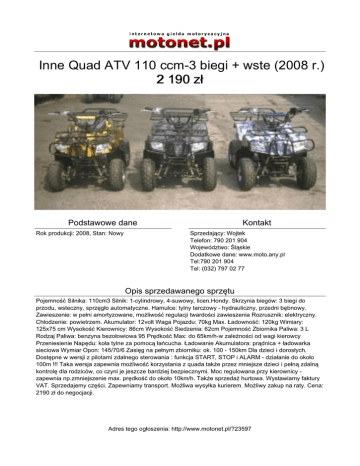 Inne Quad ATV 110 ccm-3 biegi + wste (2008 r.) 2 190 zł Podstawowe dane Rok produkcji: 2008, Stan: Nowy Kontakt Sprzedający: Wojtek Telefon: 790 201 904 Województwo: Śląskie Dodatkowe dane: www.moto.any.pl Tel:790 201 904 Tel: (032) 797 02 77 Opis sprzedawanego sprzętu Pojemność Silnika: 110cm3 Silnik: 1-cylindrowy, 4-suwowy, licen.Hondy. Skrzynia biegów: 3 biegi do przodu, wsteczny, sprzęgło automatyczne. Hamulce: tylny tarczowy - hydrauliczny, przedni bębnowy. Zawieszenie: w pełni amortyzowane, możliwość regulacji twardości zawieszenia Rozrusznik: elektryczny. Chłodzenie: powietrzem. Akumulator: 12volt Waga Pojazdu: 70kg Max. Ładowność: 120kg Wimiary: 125x75 cm Wysokość Kierownicy: 86cm Wysokość Siedzenia: 62cm Pojemność Zbiornika Paliwa: 3 L Rodzaj Paliwa: benzyna bezołowiowa 95 Prędkość Max: do 65km/h-w zależności od wagi kierowcy Przeniesienie Napędu: koła tylne za pomocą łańcucha. Ładowanie Akumulatora: prądnica + ładowarka sieciowa Wymiar Opon: 145/70/6 Zasięg na pełnym zbiorniku: ok. 100 - 150km Dla dzieci i dorosłych. Dostępne w wersji z pilotami zdalnego sterowania : funkcja START, STOP i ALARM - działanie do około 100m !!! Taka wersja zapewnia możliwość korzystania z quada także przez mniejsze dzieci i pełną zdalną kontrolę dla rodziców, co czyni je jeszcze bardziej bezpiecznymi. Moc regulowana przy kierownicy zapewnia np.zmniejszenie max. prędkość do około 10km/h. Także sprzedaż hurtowa. Wystawiamy faktury VAT. Sprzedajemy części. Zapewniamy transport. Możliwa wysyłka kurierem. Możliwy zakup na raty. Cena: 2190 zł do negocjacji. Adres tego ogłoszenia: http://www.motonet.pl/?23597