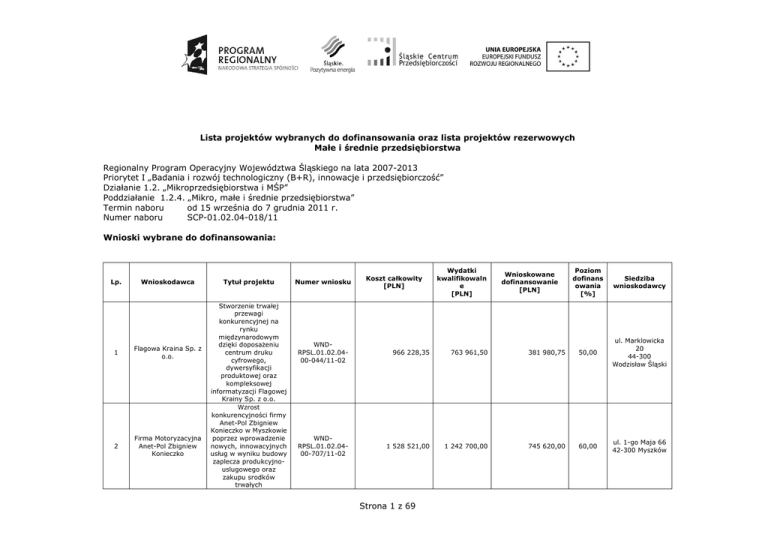 Lista projektów wybranych do dofinansowania oraz lista projektów rezerwowych Małe i średnie przedsiębiorstwa Regionalny Program Operacyjny Województwa Śląskiego na lata 2007-2013 Priorytet I „Badania i rozwój technologiczny (B+R), innowacje i przedsiębiorczość” Działanie 1.2. „Mikroprzedsiębiorstwa i MŚP” Poddziałanie 1.2.4. „Mikro, małe i średnie przedsiębiorstwa” Termin naboru od 15 września do 7 grudnia 2011 r. Numer naboru SCP-01.02.04-018/11 Wnioski wybrane do dofinansowania: Lp. Wnioskodawca 1 Flagowa Kraina Sp. z o.o. 2 Firma Motoryzacyjna Anet-Pol Zbigniew Konieczko Tytuł projektu Stworzenie trwałej przewagi konkurencyjnej na rynku międzynarodowym dzięki doposaŜeniu centrum druku cyfrowego, dywersyfikacji produktowej oraz kompleksowej informatyzacji Flagowej Krainy Sp. z o.o. Wzrost konkurencyjności firmy Anet-Pol Zbigniew Konieczko w Myszkowie poprzez wprowadzenie nowych, innowacyjnych usług w wyniku budowy zaplecza produkcyjnouslugowego oraz zakupu srodków trwałych Numer wniosku Koszt całkowity [PLN] Wydatki kwalifikowaln e [PLN] Wnioskowane dofinansowanie [PLN] Poziom dofinans owania [%] Siedziba wnioskodawcy WNDRPSL.01.02.0400-044/11-02 966 228,35 763 961,50 381 980,75 50,00 ul. Marklowicka 20 44-300 Wodzisław Śląski WNDRPSL.01.02.0400-707/11-02 1 528 521,00 1 242 700,00 745 620,00 60,00 ul. 1-go Maja 66 42-300 Myszków Strona 1 z 69 3 Anteo-Banach spółka cywilna Dariusz Banach, Damian Banach 4 Kadrew Sp. z o.o. 5 Technika Okienna P.H.U. Aleksander Rduch i Zbigniew Borek Sp. J. 6 Fabryka Elementów Napędowych "FENA" Sp. z o.o. 7 Przedsiębiorstwo Produkcyjno Handlowe "MANDAM" Sp. z o.o. Rozszerzenie działalności Anteo s.c. o nowe usługi w zakresie wykonywania instalacji elektrycznych. Dywersyfikacja działalności spółki Kadrew oraz rozwój działalności eksportowej szansą na wzrost konkurencyjności na rynku międzynarodowym DoposaŜenie parku maszyn firmy Technika Okienna Rduch & Borek w celu dywersyfikacji produktowej oraz podniesienia konkurencyjności firmy na rynku produktów energooszczędnych i pasywnych Działania modernizacyjne w przedsiębiorstwie FENA Sp. z o.o. prowadzące do wprowadzenia na rynek nowych, innowacyjnych oraz ulepszonych produktów. Wzrost konkurencyjności PPH MANDAM SP. Z O.O. w wyniku wprowadzenia na rynek nowych produktów poprzez rozbudowę parku maszynowego i poprawę efektywności zarządzania czasem pracy. WNDRPSL.01.02.0400-E15/11-02 1 230 000,00 1 000 000,00 600 000,00 60,00 ul. Karola Goduli 3641-703 Ruda Śląska WNDRPSL.01.02.0400-F34/11-02 1 537 500,00 1 250 000,00 750 000,00 60,00 ul. Gamowska 3 47-480 Pawłów WNDRPSL.01.02.0400-A01/11-02 1 186 851,60 964 920,00 578 952,00 60,00 ul. Wiejska 55a 44-323 Gogołowa WNDRPSL.01.02.0400-816/11-02 1 725 690,00 1 389 000,00 694 500,00 50,00 ul. Kościuszki 191 40-525 Katowice WNDRPSL.01.02.0400-356/11-01 507 744,00 412 800,00 206 400,00 50,00 ul. Toruńska 2 44-100 Gliwice Strona 2 z 69 8 JAGODEX SPÓŁKA Z OGRANICZONĄ ODPOWIEDZIALNOŚC IĄ 9 System Spółka z ograniczoną odpowiedzialnością 10 PRO-INVEST mgr inŜ. Arkadiusz Nagięć 11 POL-EKO-APARATURA Spółka Jawna A. Polok-Kowalska, S. Kowalski 12 PRZEDSIĘBIORSTWO PRODUKCYJNO HANDLOWO USŁUGOWE BOR-POL MARIUSZ BORKOWSKI Wzrost konkurencyjności JAGODEX Sp. z o.o. na rynku krajowym i międzynarodowym w wyniku wprowadzenia do oferty nowej grupy makaronów owsianych dzięki uruchomieniu nowoczesnej linii technologicznej Wzrost konkurencyjności System Sp. z o. o. poprzez zmianę procesu technologicznego i wprowadzenie nowego produktu Wzrost konkurencyjności firmy projektowo-budowlanej PRO-INVEST poprzez zakup nowoczesnego, specjalistycznego oprogramowania do trójwymiarowego projektowania i obliczania obiektów budowlanych. Zakup innowacyjnych metod projektowych i produkcyjnych w celu wdroŜenia nowych produktów do oferty Pol-Eko-Aparatura Sp.J. Rozszerzenie działalności P.P.H.U Bor-Pol poprzez utworzenie nowoczesnego laboratorium analitycznego w Sośnicowicach. WNDRPSL.01.02.0400-A10/11-02 1 053 679,50 811 650,00 405 825,00 50,00 ul. Staszica 8 44-330 Jastrzębie-Zdrój WNDRPSL.01.02.0400-D09/11-02 1 140 390,80 904 567,50 542 740,50 60,00 ul. Wojska Polskiego 140 41-208 Sosnowiec WNDRPSL.01.02.0400-D64/11-02 726 315,00 590 500,00 354 300,00 60,00 ul. Wawelska 4 40-096 Katowice WNDRPSL.01.02.0400-567/11-02 805 650,00 655 000,00 327 500,00 50,00 ul. Kokoszycka 172C 44-300 Wodzisław Śląski WNDRPSL.01.02.0400-497/11-02 1 928 141,58 1 624 265,51 749 923,39 46,17 ul. Jaśminu 2 44-152 Gliwice Strona 3 z 69 13 NEOTHERM Spółka Jawna Rafał Herzyk, Ireneusz Nowak 14 ZISCO Zakład Instalacji Sanitarnych C.O. Franciszek Bandura 15 J.P. Cover Spółka z ograniczoną odpowiedzialnością 16 MERITUM Spółka z ograniczoną odpowiedzialnością 17 18 Zmiana procesu produkcyjnego styropianu, poprzez zakup urządzeń najnowszej generacji przez NEOTHERM Spółka Jawna Rafał Herzyk, Ireneusz Nowak. Zasadnicza zmiana procesu produkcyjnego oraz wprowadzenie na rynek nowych usług poprzez modernizację parku maszynowego z zastosowaniem i wykorzystaniem innowacyjnej technologii przecisku sterowanego Wzrost konkurencyjności rynkowej i dywersyfikacja oferty produktowej JP Cover sp. z o.o. poprzez rozbudowę linii produkcyjnej i doposaŜenie laboratorium. WNDRPSL.01.02.0400-685/11-02 1 685 100,00 1 370 000,00 749 938,00 54,74 ul. Pułaskiego 6 42-300 Myszków WNDRPSL.01.02.0400-684/11-02 1 023 483,00 817 000,00 490 200,00 60,00 ul. A. Mickiewicza 75 43-250 Pawłowice WNDRPSL.01.02.0400-762/11-02 1 048 298,86 852 275,49 499 944,81 58,66 ul. Gustawa Morcinka 17 43-417 Kaczyce Plastyczna powłoka cynkowa czyli nowość w galwanizacji WNDRPSL.01.02.0400-196/11-02 1 224 834,00 974 800,00 584 880,00 60,00 ul. Przemysłowa 3 44-203 Rybnik Media Sp. z o.o. Wprowadzenie nowych usług z zakresu informatyki śledczej WNDRPSL.01.02.0400-E18/11-01 391 017,00 317 900,00 190 740,00 60,00 ul. Piotrowicka 61 40-