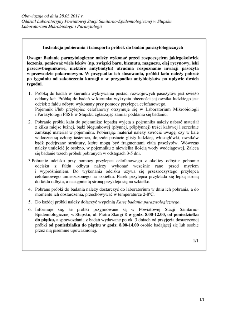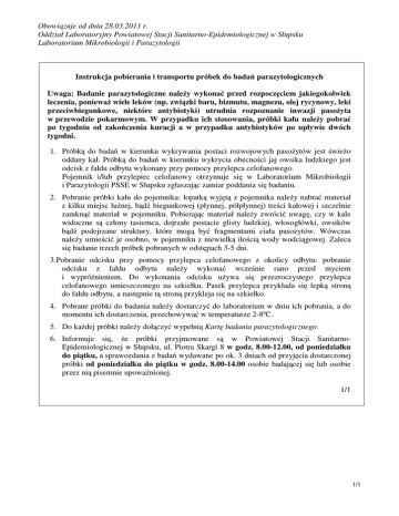 Obowi zuje od dnia 28.03.2011 r. Oddział Laboratoryjny Powiatowej Stacji Sanitarno-Epidemiologicznej w Słupsku Laboratorium Mikrobiologii i Parazytologii Instrukcja pobierania i transportu próbek do bada parazytologicznych Uwaga: Badanie parazytologiczne nale y wykona przed rozpocz ciem jakiegokolwiek leczenia, poniewa wiele leków (np. zwi zki baru, bizmutu, magnezu, olej rycynowy, leki przeciwbiegunkowe, niektóre antybiotyki) utrudnia rozpoznanie inwazji paso yta w przewodzie pokarmowym. W przypadku ich stosowania, próbki kału nale y pobra po tygodniu od zako czenia kuracji a w przypadku antybiotyków po upływie dwóch tygodni. 1. Próbk do bada w kierunku wykrywania postaci rozwojowych paso ytów jest wie o oddany kał. Próbk do bada w kierunku wykrycia obecno ci jaj owsika ludzkiego jest odcisk z fałdu odbytu wykonany przy pomocy przylepca celofanowego. Pojemnik i/lub przylepiec celofanowy otrzymuje si w Laboratorium Mikrobiologii i Parazytologii PSSE w Słupsku zgłaszaj c zamiar poddania si badaniu. 2. Pobranie próbki kału do pojemnika: łopatk wyj t z pojemnika nale y nabra materiał z kilku miejsc lu nej, b d biegunkowej (płynnej, półpłynnej) tre ci kałowej i szczelnie zamkn materiał w pojemniku. Pobieraj c materiał nale y zwróci uwag , czy w kale widoczne s człony tasiemca, dojrzałe postacie glisty ludzkiej, włosogłówki, owsików b d podejrzane struktury, które mog by fragmentami ciała paso ytów. Wówczas nale y umie ci je osobno, w pojemniku z niewielk ilo ci wody wodci gowej. Zaleca si badanie trzech próbek pobranych w odst pach 3-5 dni. 3.Pobranie odcisku przy pomocy przylepca celofanowego z okolicy odbytu: pobranie wcze nie rano przed myciem odcisku z fałdu odbytu nale y wykona i wypró nieniem. Do wykonania odcisku u ywa si przezroczystego przylepca celofanowego umieszczonego na szkiełku. Pasek przylepca przykłada si lepk stron do fałdu odbytu, a nast pnie t stron przykleja si na szkiełko. 4. Pobrane próbki do badania nale y dostarczy do laboratorium w dniu ich pobrania, a do momentu ich dostarczenia, przechowywa w temperaturze 2-8ºC. 5. Do ka dej próbki nale y doł czy wypełni Kart badania parazytologicznego. 6. Informuje si , e próbki przyjmowane s w Powiatowej Stacji SanitarnoEpidemiologicznej w Słupsku, ul. Piotra Skargi 8 w godz. 8.00-12.00, od poniedziałku do pi tku, a sprawozdania z bada wydawane po ok. 3 dniach od przyj cia dostarczonej próbki od poniedziałku do pi tku w godz. 8.00-14.00 osobie badaj cej si lub osobie przez ni pisemnie upowa nionej. 1/1 1/1