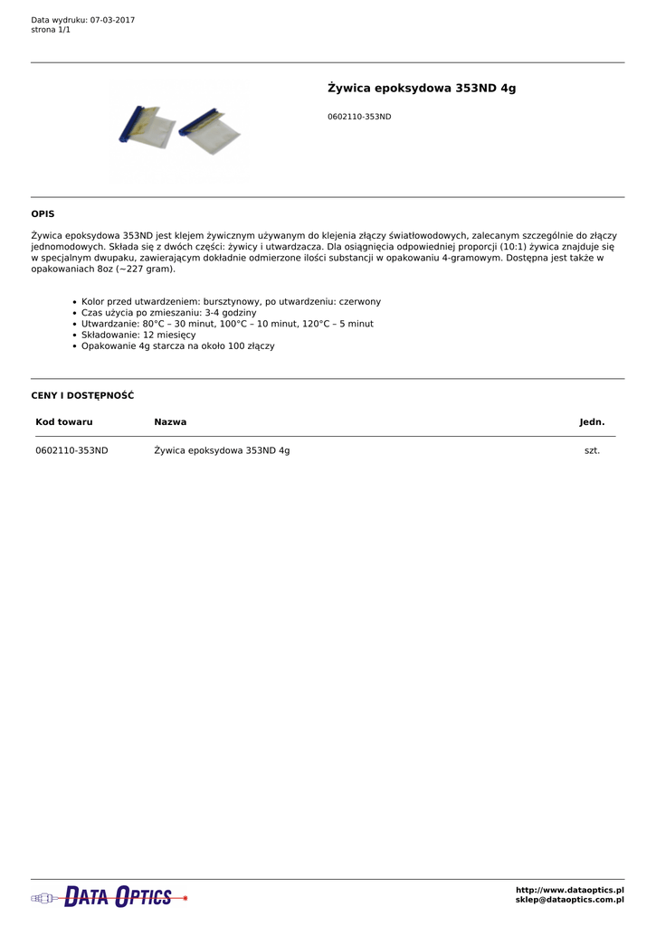 Data wydruku: 07-03-2017 strona 1/1 Żywica epoksydowa 353ND 4g 0602110-353ND OPIS Żywica epoksydowa 353ND jest klejem żywicznym używanym do klejenia złączy światłowodowych, zalecanym szczególnie do złączy jednomodowych. Składa się z dwóch części: żywicy i utwardzacza. Dla osiągnięcia odpowiedniej proporcji (10:1) żywica znajduje się w specjalnym dwupaku, zawierającym dokładnie odmierzone ilości substancji w opakowaniu 4-gramowym. Dostępna jest także w opakowaniach 8oz (~227 gram). Kolor przed utwardzeniem: bursztynowy, po utwardzeniu: czerwony Czas użycia po zmieszaniu: 3-4 godziny Utwardzanie: 80°C – 30 minut, 100°C – 10 minut, 120°C – 5 minut Składowanie: 12 miesięcy Opakowanie 4g starcza na około 100 złączy CENY I DOSTĘPNOŚĆ Kod towaru Nazwa 0602110-353ND Żywica epoksydowa 353ND 4g Jedn. szt. http://www.dataoptics.pl [email protected] Powered by TCPDF (www.tcpdf.org)