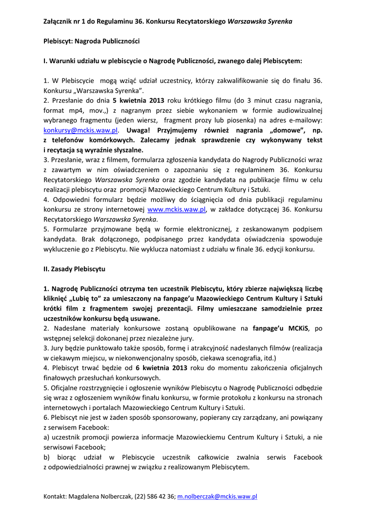 Załącznik nr 1 do Regulaminu 36. Konkursu Recytatorskiego Warszawska Syrenka Plebiscyt: Nagroda Publiczności I. Warunki udziału w plebiscycie o Nagrodę Publiczności, zwanego dalej Plebiscytem: 1. W Plebiscycie mogą wziąć udział uczestnicy, którzy zakwalifikowanie się do finału 36. Konkursu „Warszawska Syrenka”. 2. Przesłanie do dnia 5 kwietnia 2013 roku krótkiego filmu (do 3 minut czasu nagrania, format mp4, mov.,) z nagranym przez siebie wykonaniem w formie audiowizualnej wybranego fragmentu (jeden wiersz, fragment prozy lub piosenka) na adres e-mailowy: [email protected]. Uwaga! Przyjmujemy również nagrania „domowe”, np. z telefonów komórkowych. Zalecamy jednak sprawdzenie czy wykonywany tekst i recytacja są wyraźnie słyszalne. 3. Przesłanie, wraz z filmem, formularza zgłoszenia kandydata do Nagrody Publiczności wraz z zawartym w nim oświadczeniem o zapoznaniu się z regulaminem 36. Konkursu Recytatorskiego Warszawska Syrenka oraz zgodzie kandydata na publikacje filmu w celu realizacji plebiscytu oraz promocji Mazowieckiego Centrum Kultury i Sztuki. 4. Odpowiedni formularz będzie możliwy do ściągnięcia od dnia publikacji regulaminu konkursu ze strony internetowej www.mckis.waw.pl, w zakładce dotyczącej 36. Konkursu Recytatorskiego Warszawska Syrenka. 5. Formularze przyjmowane będą w formie elektronicznej, z zeskanowanym podpisem kandydata. Brak dołączonego, podpisanego przez kandydata oświadczenia spowoduje wykluczenie go z Plebiscytu. Nie wyklucza natomiast z udziału w finale 36. edycji konkursu. II. Zasady Plebiscytu 1. Nagrodę Publiczności otrzyma ten uczestnik Plebiscytu, który zbierze największą liczbę kliknięć „Lubię to” za umieszczony na fanpage’u Mazowieckiego Centrum Kultury i Sztuki krótki film z fragmentem swojej prezentacji. Filmy umieszczane samodzielnie przez uczestników konkursu będą usuwane. 2. Nadesłane materiały konkursowe zostaną opublikowane na fanpage’u MCKiS, po wstępnej selekcji dokonanej przez niezależne jury. 3. Jury będzie punktowało także sposób, formę i atrakcyjność nadesłanych filmów (realizacja w ciekawym miejscu, w niekonwencjonalny sposób, ciekawa scenografia, itd.) 4. Plebiscyt trwać będzie od 6 kwietnia 2013 roku do momentu zakończenia oficjalnych finałowych przesłuchań konkursowych. 5. Oficjalne rozstrzygnięcie i ogłoszenie wyników Plebiscytu o Nagrodę Publiczności odbędzie się wraz z ogłoszeniem wyników finału konkursu, w formie protokołu z konkursu na stronach internetowych i portalach Mazowieckiego Centrum Kultury i Sztuki. 6. Plebiscyt nie jest w żaden sposób sponsorowany, popierany czy zarządzany, ani powiązany z serwisem Facebook: a) uczestnik promocji powierza informacje Mazowieckiemu Centrum Kultury i Sztuki, a nie serwisowi Facebook; b) biorąc udział w Plebiscycie uczestnik całkowicie zwalnia serwis Facebook z odpowiedzialności prawnej w związku z realizowanym Plebiscytem. Kontakt: Magdalena Nolberczak, (22) 586 42 36; [email protected]