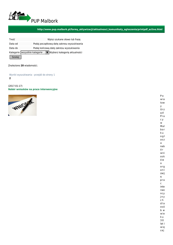 PUP Malbork http://www.pup.malbork.pl/formy_aktywizacji/aktualnosci_komunikaty_ogloszenia/printpdf_active.html Treść Wpisz szukane słowo lub frazę Data od Podaj początkową datę zakresu wyszukiwania Data do Podaj końcową datę zakresu wyszukiwania Kategorie wszystkie kategorie ... ▼ Wybierz kategorię aktualności Szukaj Znaleziono 20 wiadomości. Wyniki wyszukiwania - przejdź do strony 1 2 (2017-01-17) Nabór wniosków na prace interwencyjne Po wia tow y Urz ąd Pra cy w Mal bor ku ogł asz a nab ór wni osk ów o org ani zacj ę pra c inte rwe ncy jny ch dla osó b w wie ku 30 lat i wię cej Czytaj całośćaktualności - Nabór wniosków na prace interwencyjne (2016-12-29) Krajowy Fundusz Szkoleniowy w 2017 roku Min iste r Rod zin y, Pra cy i Poli tyki Spo łecz nej okr eślił Prio ryte ty wy dat kow ani a śro dkó w Kraj ow ego Fun dus zu Szk ole nio we go w rok u 201 7. Czytaj całośćaktualności - Krajowy Fundusz Szkoleniowy w 2017 roku (2016-11-18) Pomorski Dzień Przedsiębiorczości – IDG Po wia tow y Urz ąd Pra cy w Mal bor ku, w dni u 17 list opa da br. w ram ach Świ ato we go Tyg odn ia Prz eds iębi orc zoś ci wsp ólni e z inn ymi Urz ęda mi Pra cy w woj ew ódz twi e po mor ski m, zor gan izo wał już po raz ós my prz eds ięw zięc ie pn. Po mor ski Dzi eń Prz eds iębi orc zoś ci – IDG. Czytaj całośćaktualności - Pomorski Dzień Przedsiębiorczości – IDG (2016-10-31) Zawód przyszłości, czyli operator drona Po wia tow y Urz ąd Pra cy w Mal bor ku zap ras za oso by bez rob otn e do udz iału w cie kaw ym szk ole niu z zak res u obs ługi Bez zał ogo wyc h Sta tkó w Po wie trzn ych. Czytaj całośćaktualności - Zawód przyszłości, czyli operator drona (2016-10-04) Zapraszamy do udziału w giełdzie pracy Zakład produkcyjno – handlowy, z wieloletnim doświadczeniem na rynku, poszukuje kandydatów do pracy. Szwalnia współpracuje m.in ze znanymi markami odzieżowymi! Czytaj całośćaktualności - Zapraszamy do udziału w giełdzie pracy (2016-09-19) Mobilny i aktywny kapitał ludzki w powiatach malborskim i sztumskim W dni u 16 wrz eśn ia 201 6 r., z inicj aty wy Po wia tow ego Urz ędu Pra cy w Mal bor ku, nas tąpi ło ofic jaln e pod pis ani e um owy par tne rski ej dot ycz ące j wsp óln ej real izac ji proj ekt u Czytaj całośćaktualności - Mobilny i aktywny kapitał ludzki w powiatach malborskim i sztumskim (2016-08-11) Zdobądź nowy zawód i dobrą pracę - bezpłatny kurs i staż programisty Wyższa Szkoła Bankowa w Gdańsku zaprasza do udziału w projekcie „Kurs i staż przekwalifikowujący do zawodu programisty dla bezrobotnych absolwentów szkół wyższych” Czytaj całośćaktualności - Zdobądź nowy zawód i dobrą pracę - bezpłatny kurs i staż programisty (2016-07-22) Podjąłeś zatrudnienie? Poinformuj o tym Urząd Pracy PUP w Mal bor ku prz ypo min a, że każ da oso ba bez rob otn a w mo me nci e pod jęci a zatr udn ieni a zob owi ąza na jest zgł osić ten fakt do Po wia tow ego Urz ędu Pra cy w ter min ie 7 dni. Czytaj całośćaktualności - Podjąłeś zatrudnienie? Poinformuj o tym Urząd Pracy (2016-06-10) Nowa perspektywa finansowa UE W no wej per spe kty wie fina nso wej UE duż e śro dki prz ezn acz one zos tały na akt ywi zacj ę osó b poz ost ają cyc h bez pra cy. Moż liwo ści z tym zwi ąza ne w peł ni star a się wyk orz yst ać PUP w Mal bor ku. Czytaj całośćaktualności - Nowa perspektywa finansowa UE (2016-03-11) Spotkanie z pracodawcami już za nami W dni u 9 mar ca 201 6 r., z inicj aty wy Woj ew ódz kie go Urz ędu Pra cy w Gd ańs ku ora z czt ere ch Urz ędó w pra cy zor gan izo wa ne zos tało se min ariu m dla pra cod awc ów. Czytaj całośćaktualności - Spotkanie z pracodawcami już za nami Wyniki wyszukiwania - przejdź do strony 1 2